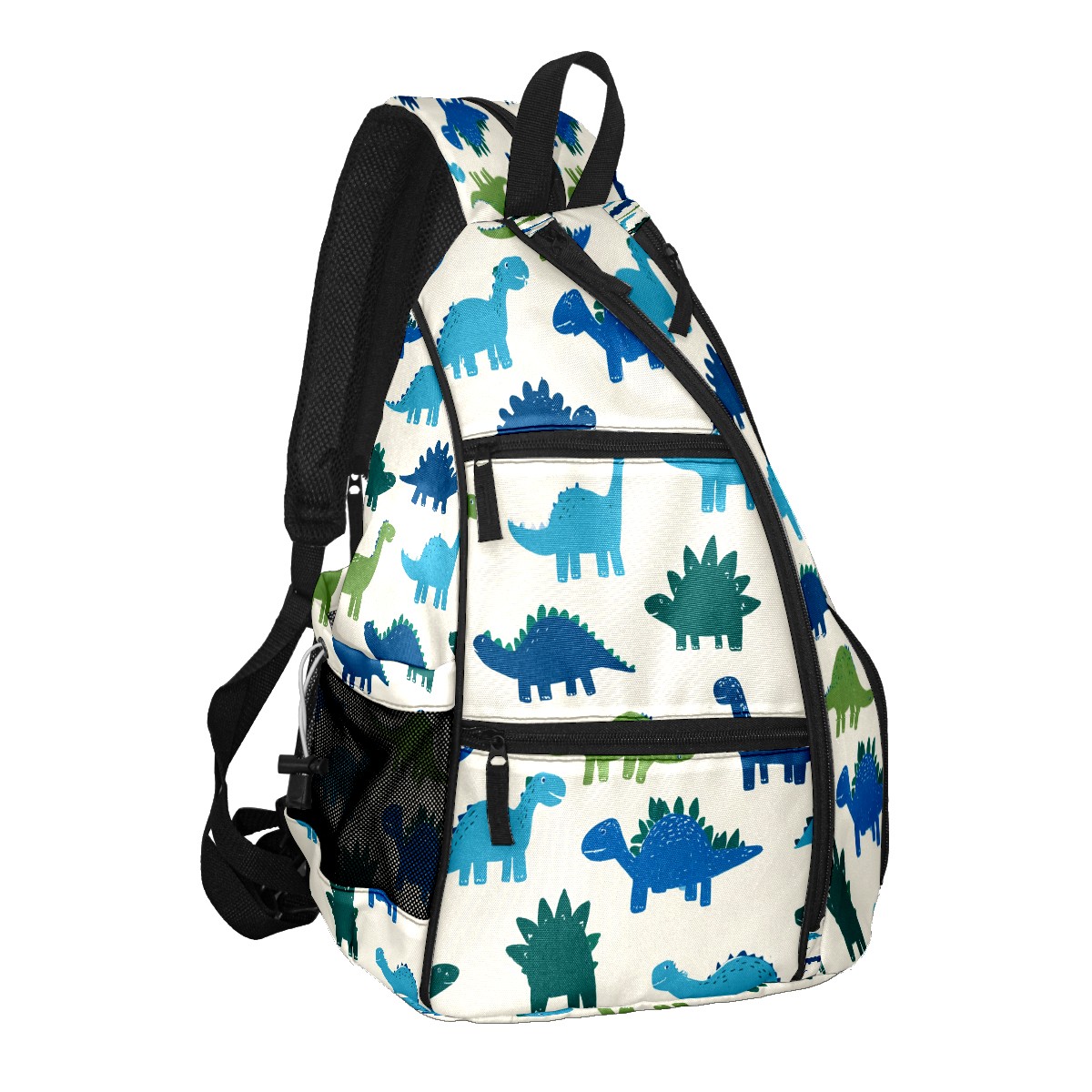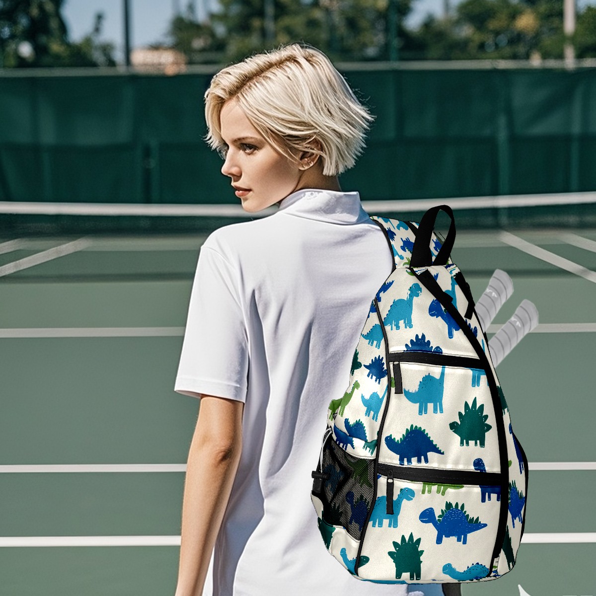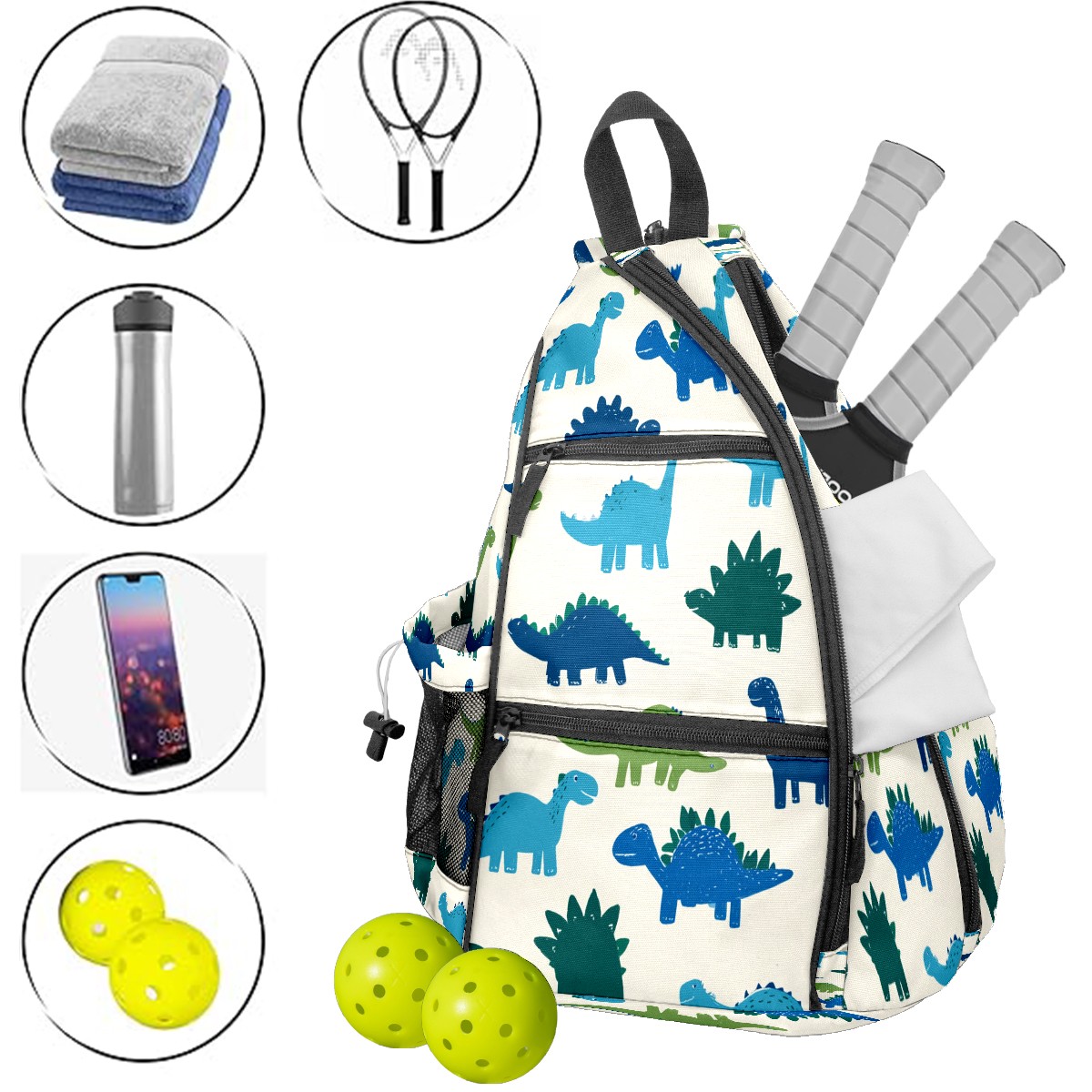 Pickleball Sling Bag for Women and Men - Backpack with Nylon Fabric/Woven Strap/Mesh Pocket/Fence Hook/Adjustable Bag Cute Dinosaur Blue