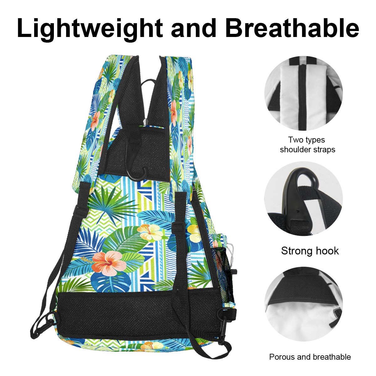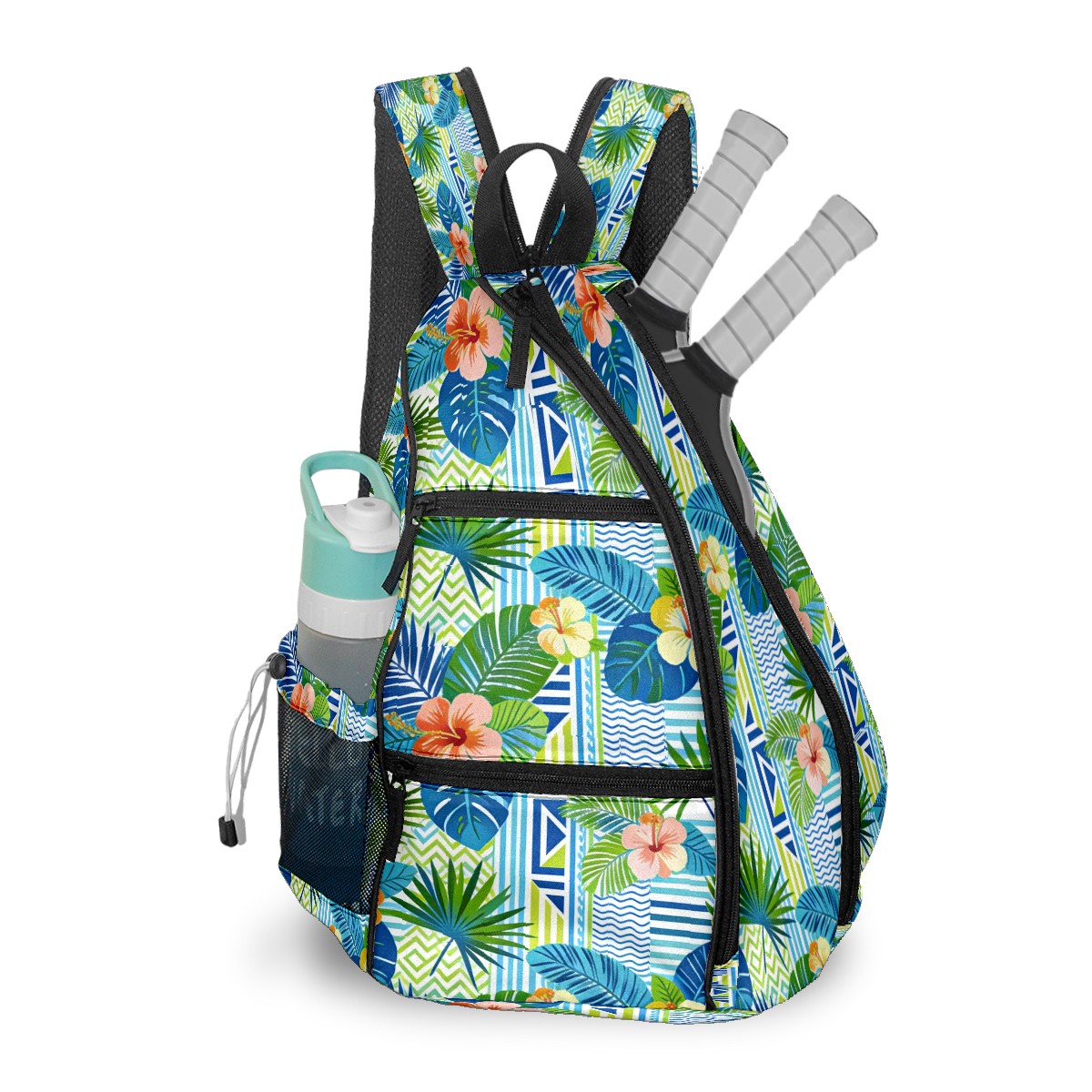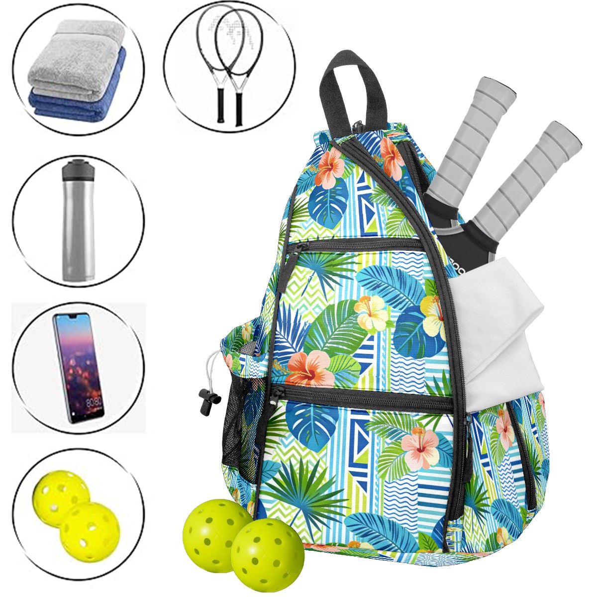 Pickleball Sling Bag for Women and Men - Backpack with Nylon Fabric/Woven Strap/Mesh Pocket/Fence Hook/Adjustable Bag Blue Flower