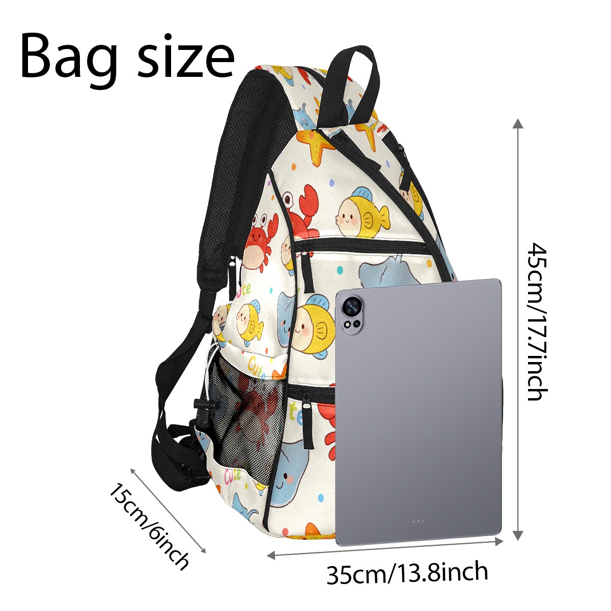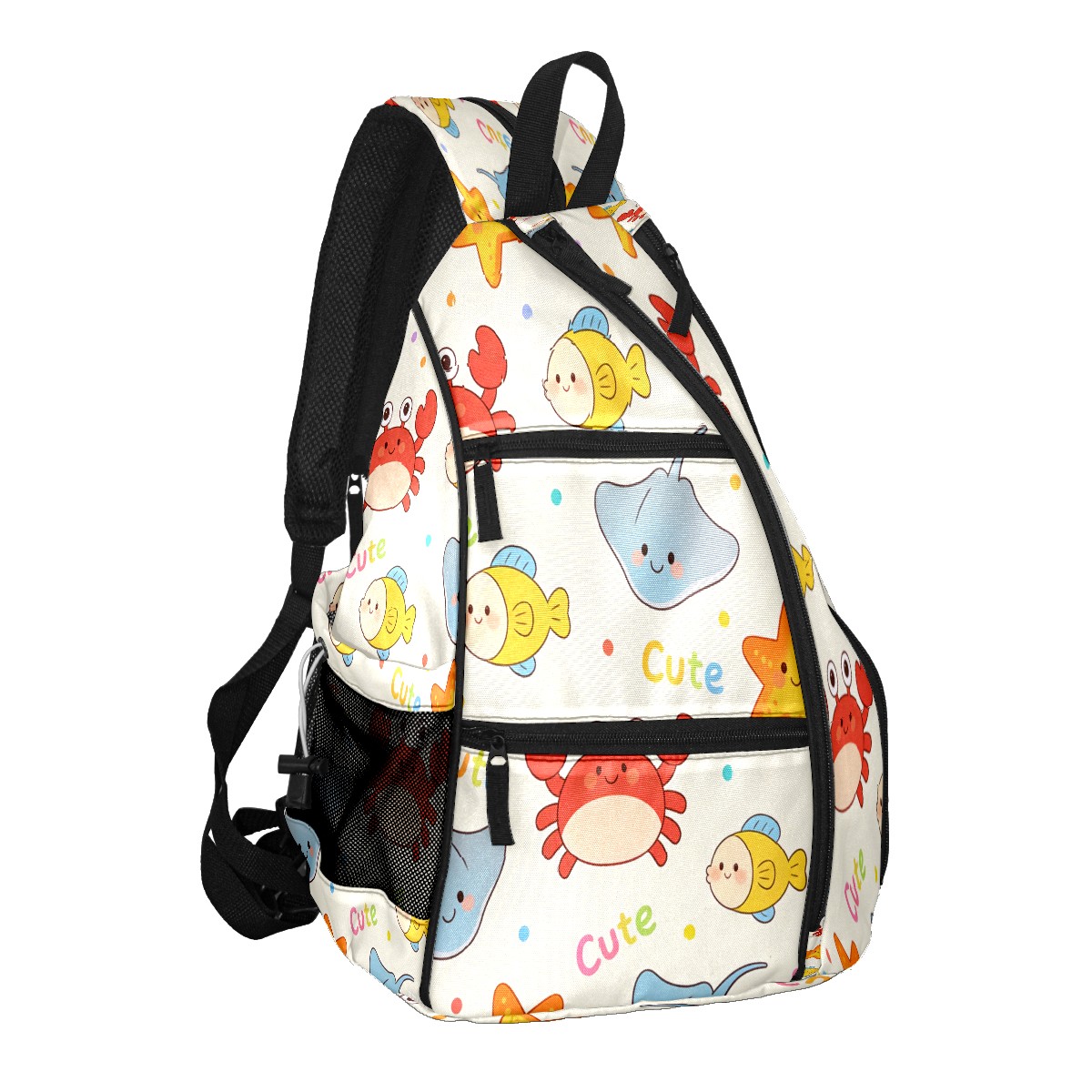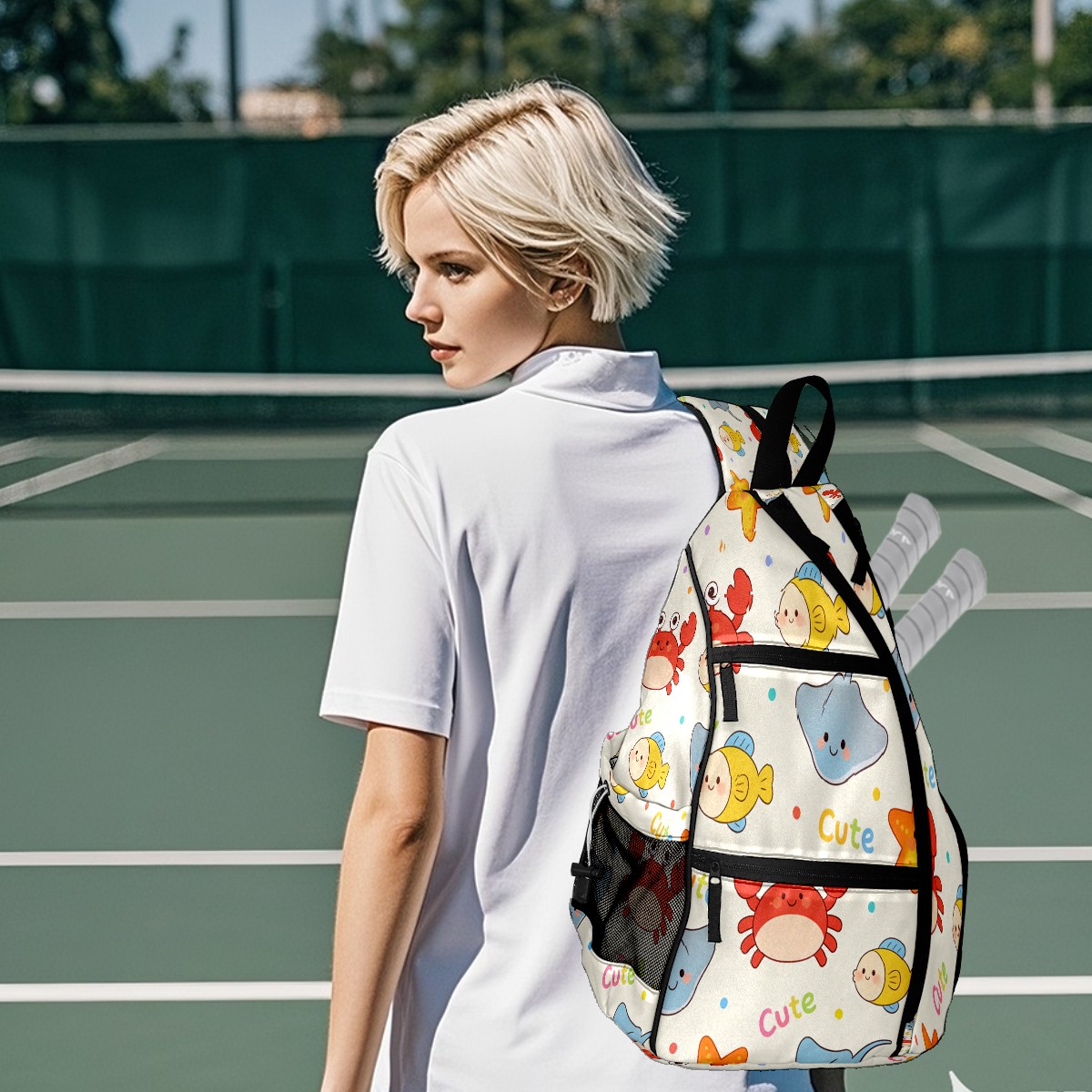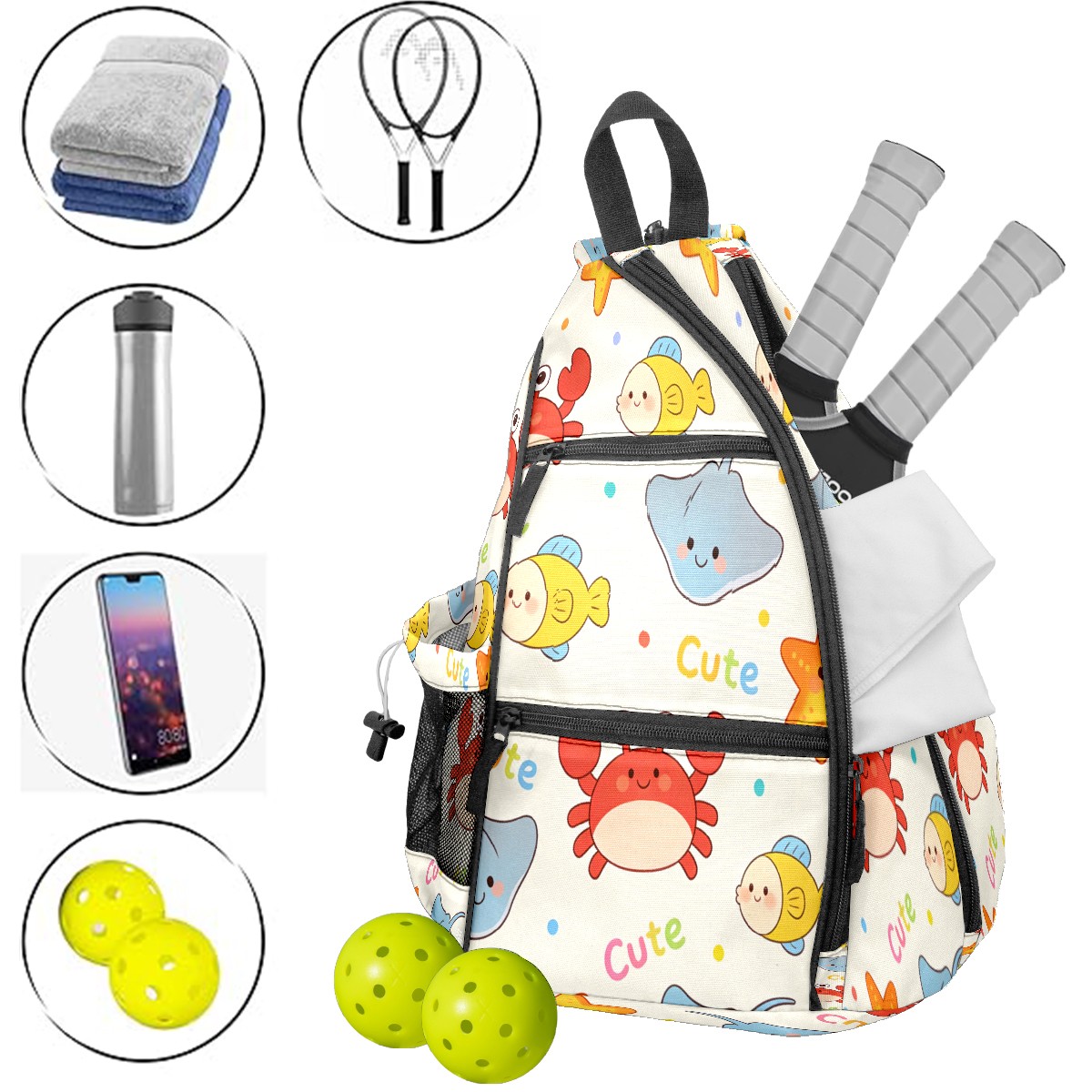 Pickleball Sling Bag for Women and Men - Backpack with Nylon Fabric/Woven Strap/Mesh Pocket/Fence Hook/Adjustable Bag Cartoon Marine Life