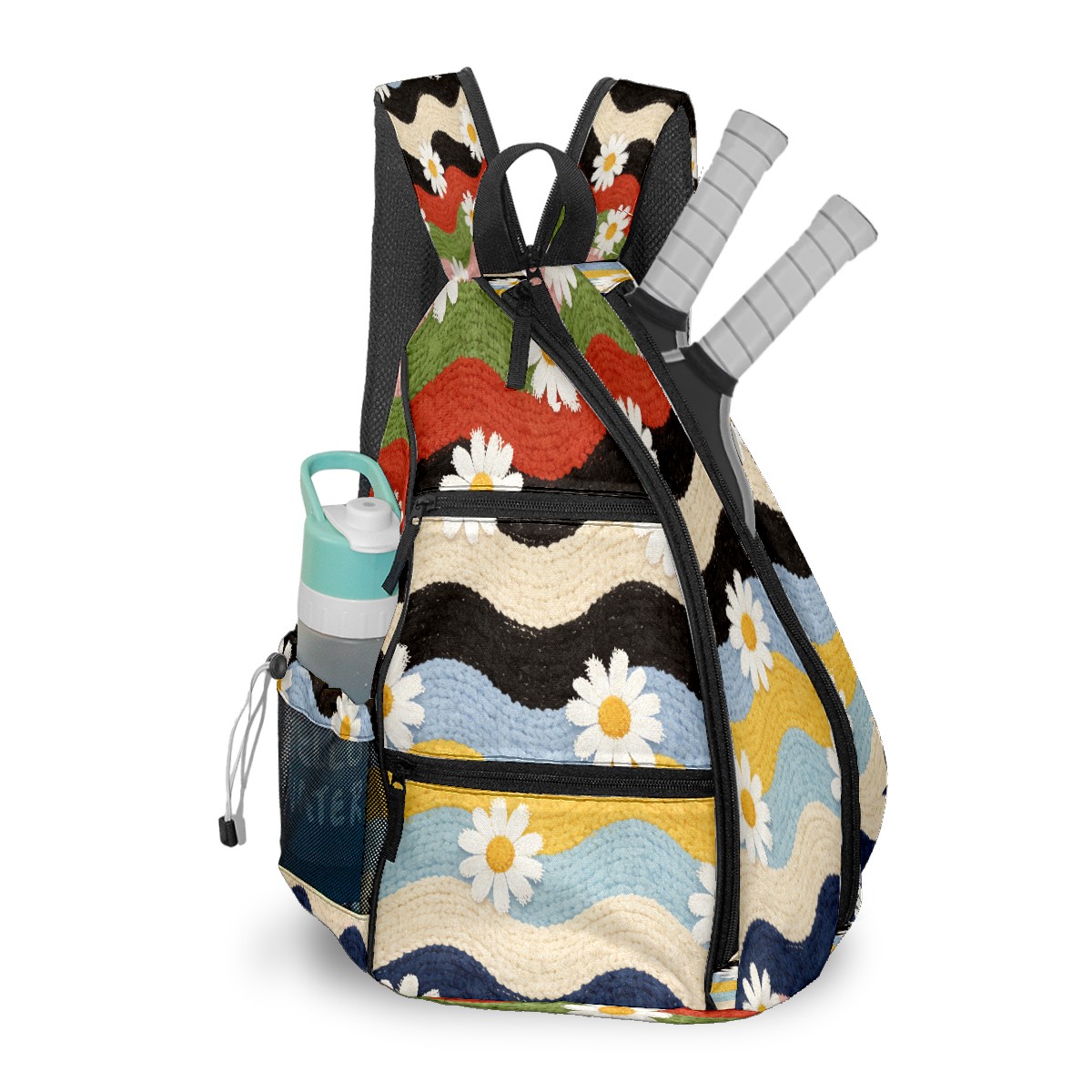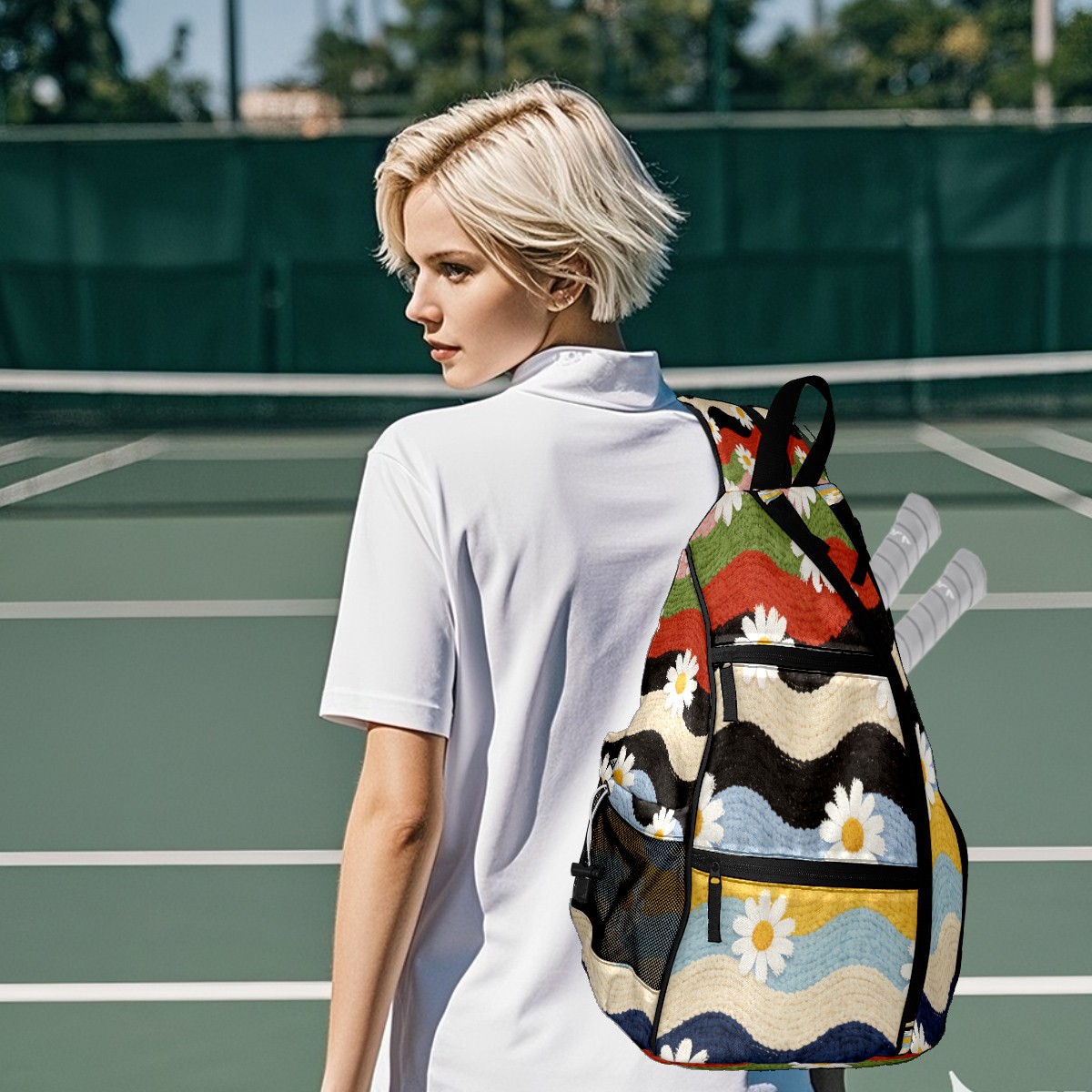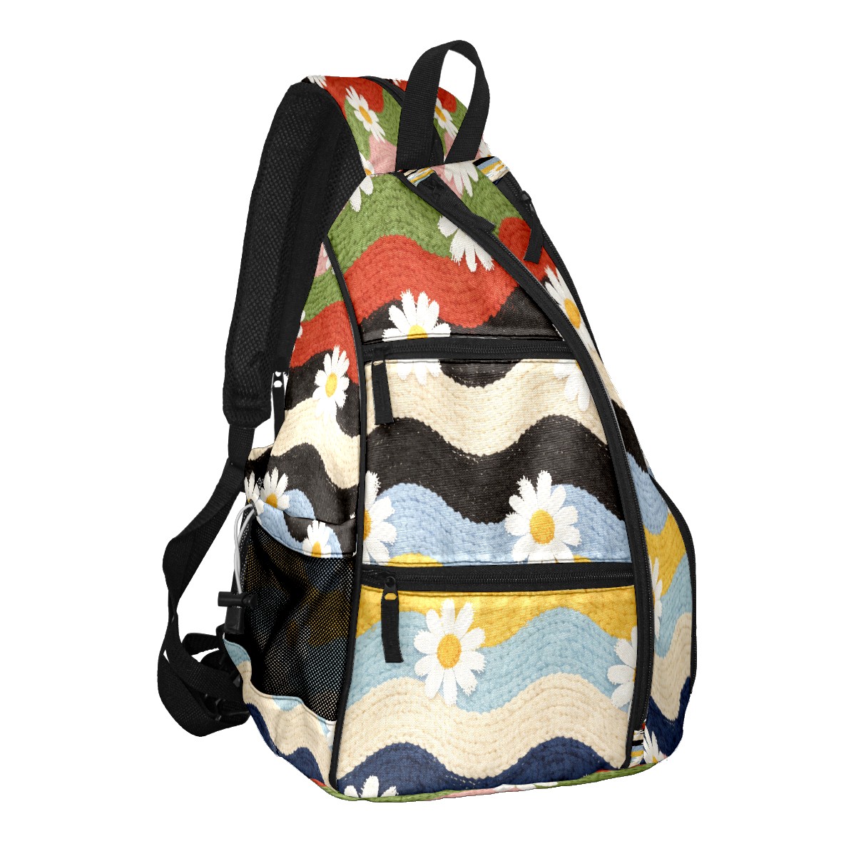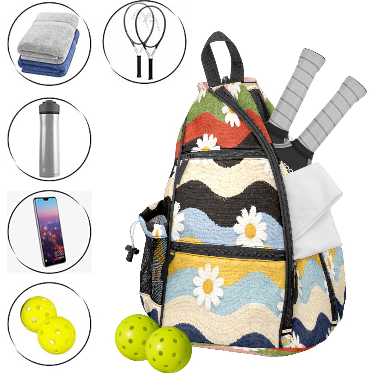 Pickleball Sling Bag for Women and Men - Backpack with Nylon Fabric/Woven Strap/Mesh Pocket/Fence Hook/Adjustable Bag Striped Daisy