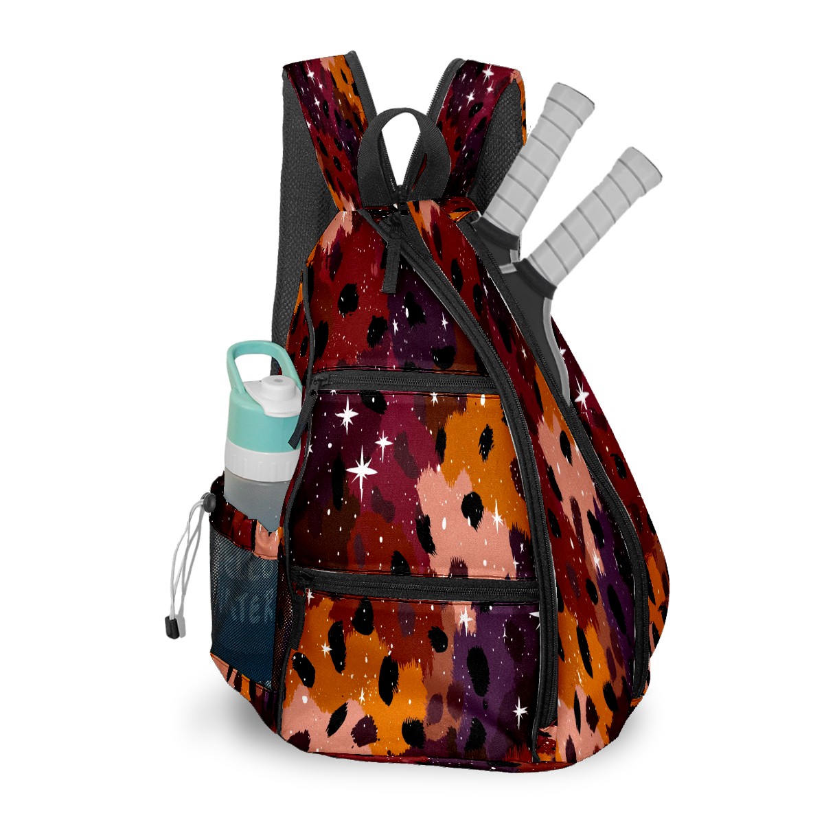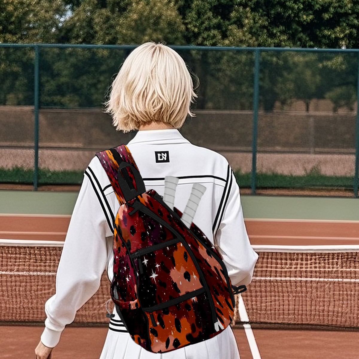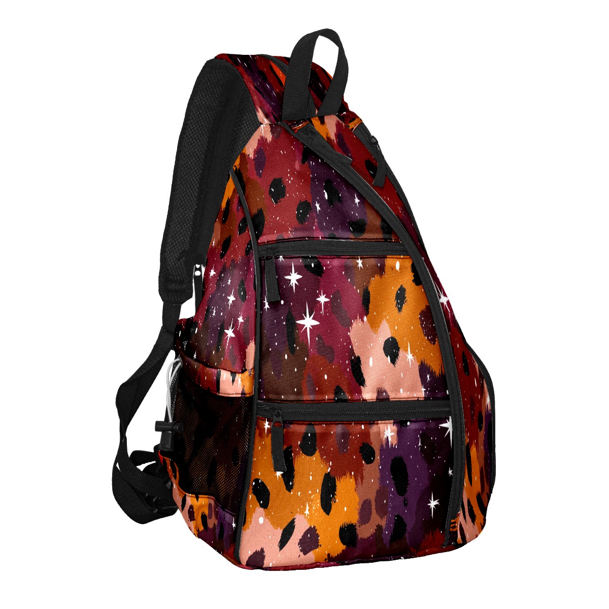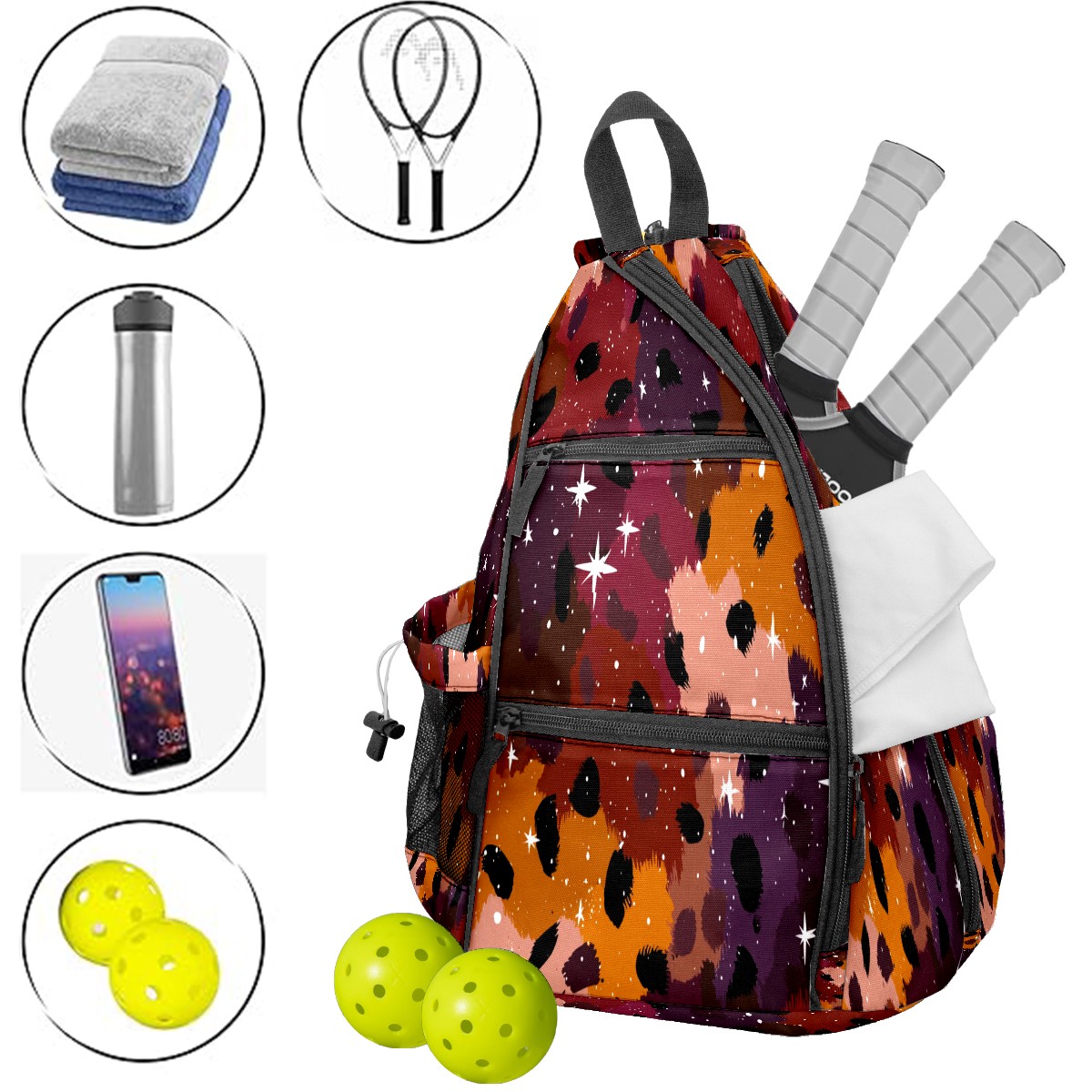 Pickleball Sling Bag for Women and Men - Backpack with Nylon Fabric/Woven Strap/Mesh Pocket/Fence Hook/Adjustable Bag Shiny Leopard Purple