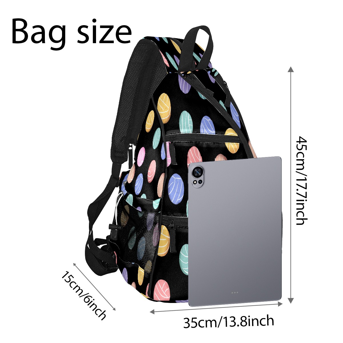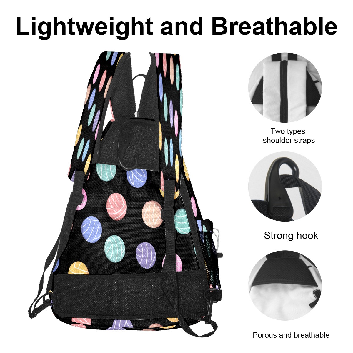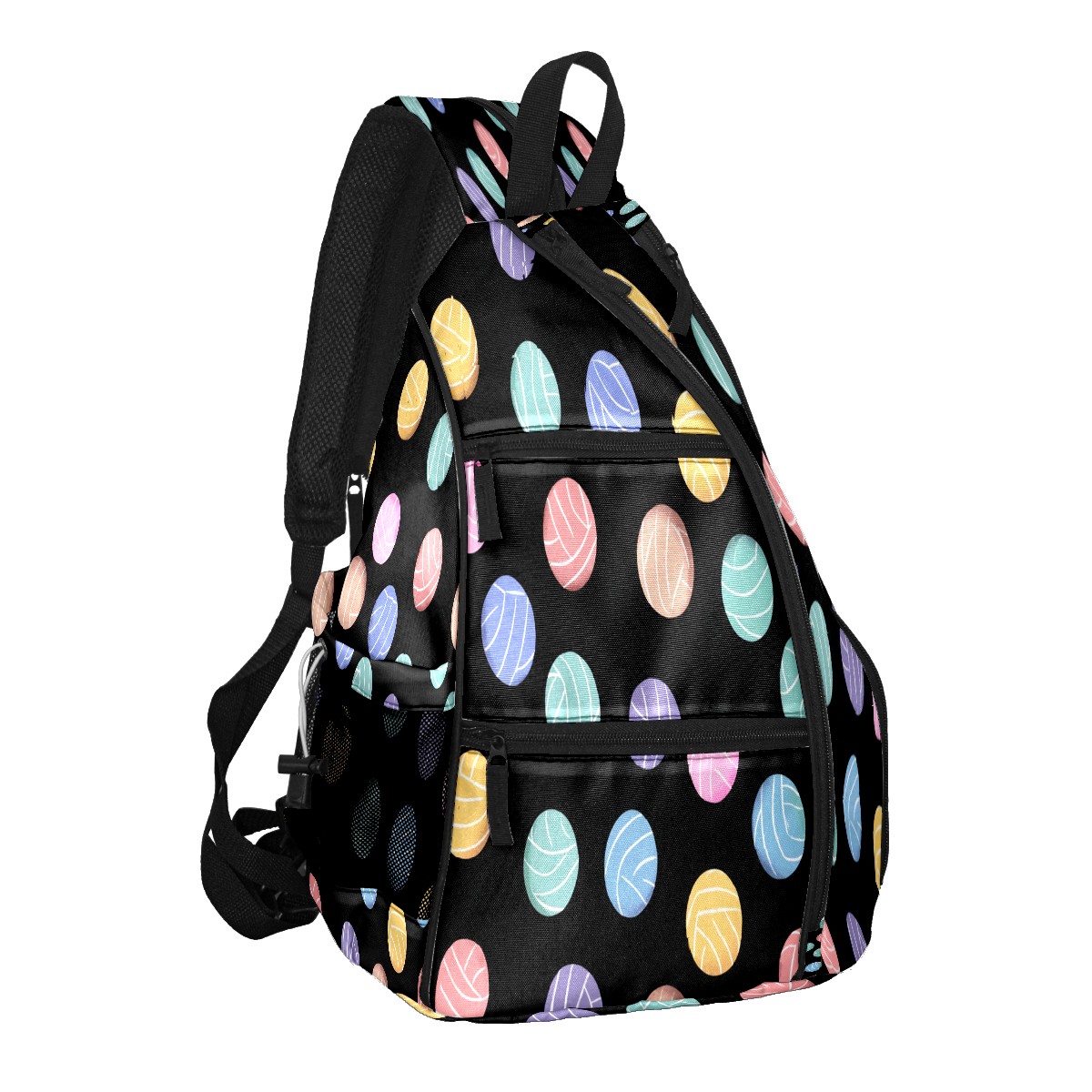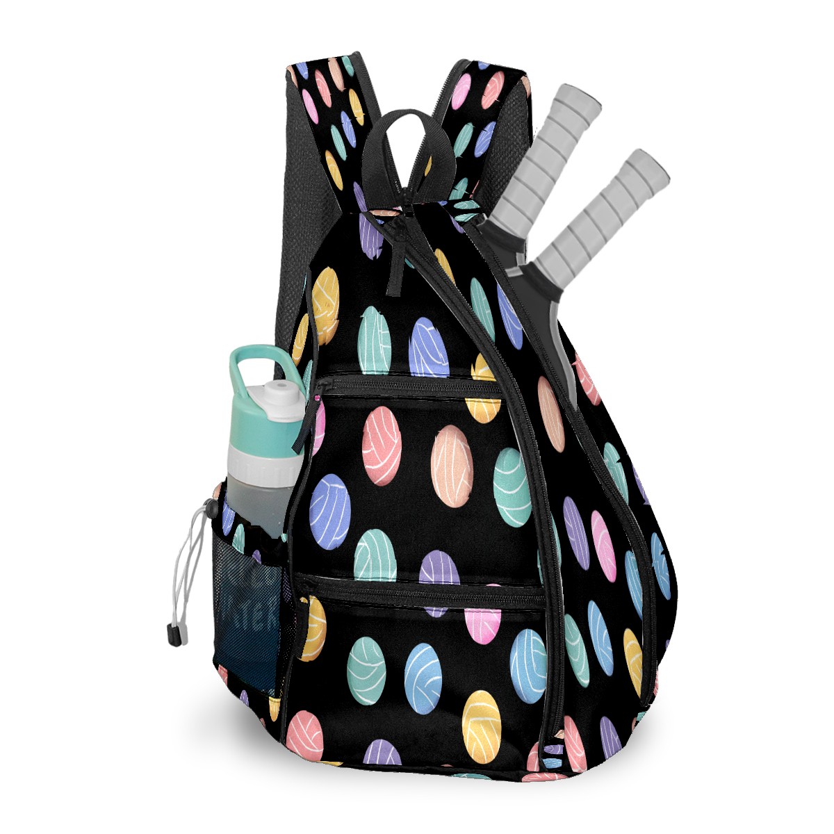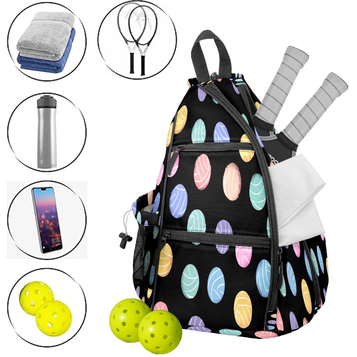 Counullo Colorful Ball Black Premium Nylon Pickleball Backpack, 3-in-1 Convertible Shoulder Crossbody Sling Bag for Women Men, Fits 2-4 Pickleball Paddles & Tennis Sports Gear