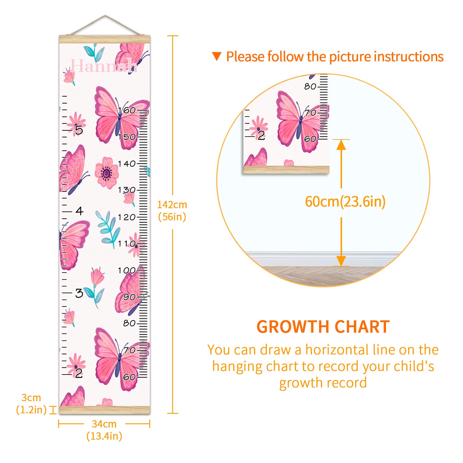 Personalized Kids Name Growth Chart Ruler for Wall Wood Frame Canvas Height Measure Chart 13.4x56 in Hanging Growth Chart Pink Butterfly & Flower12.30 Boys Girls Room Decor
