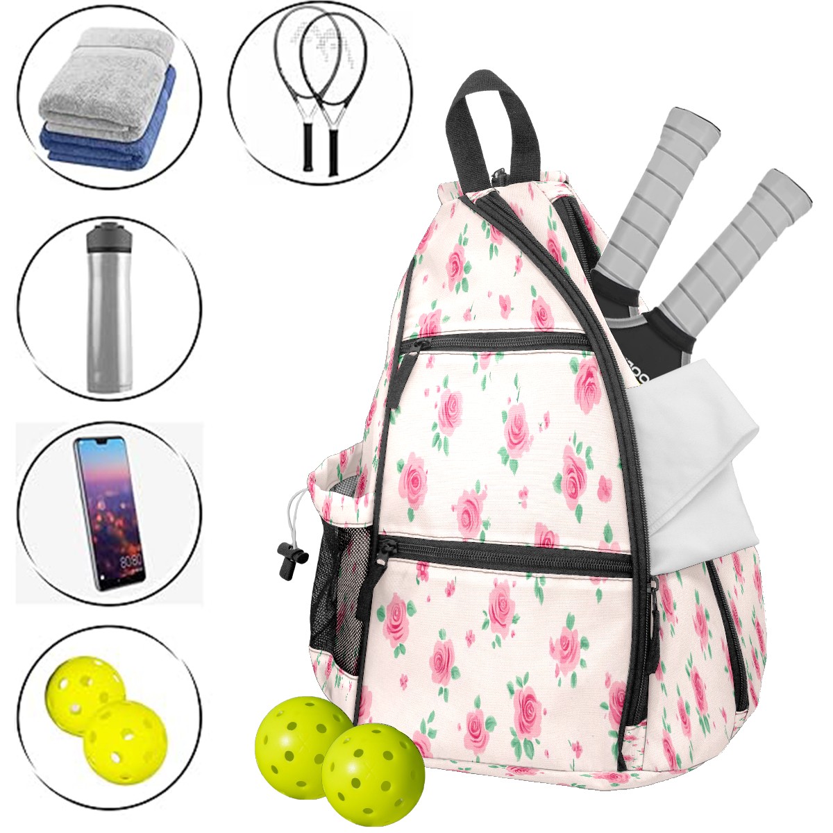 Pickleball Backpack for Women and Men, Adjustable Pickleball Sling Bag for Paddles, Balls & Accessories (Tiny Pink Roses)