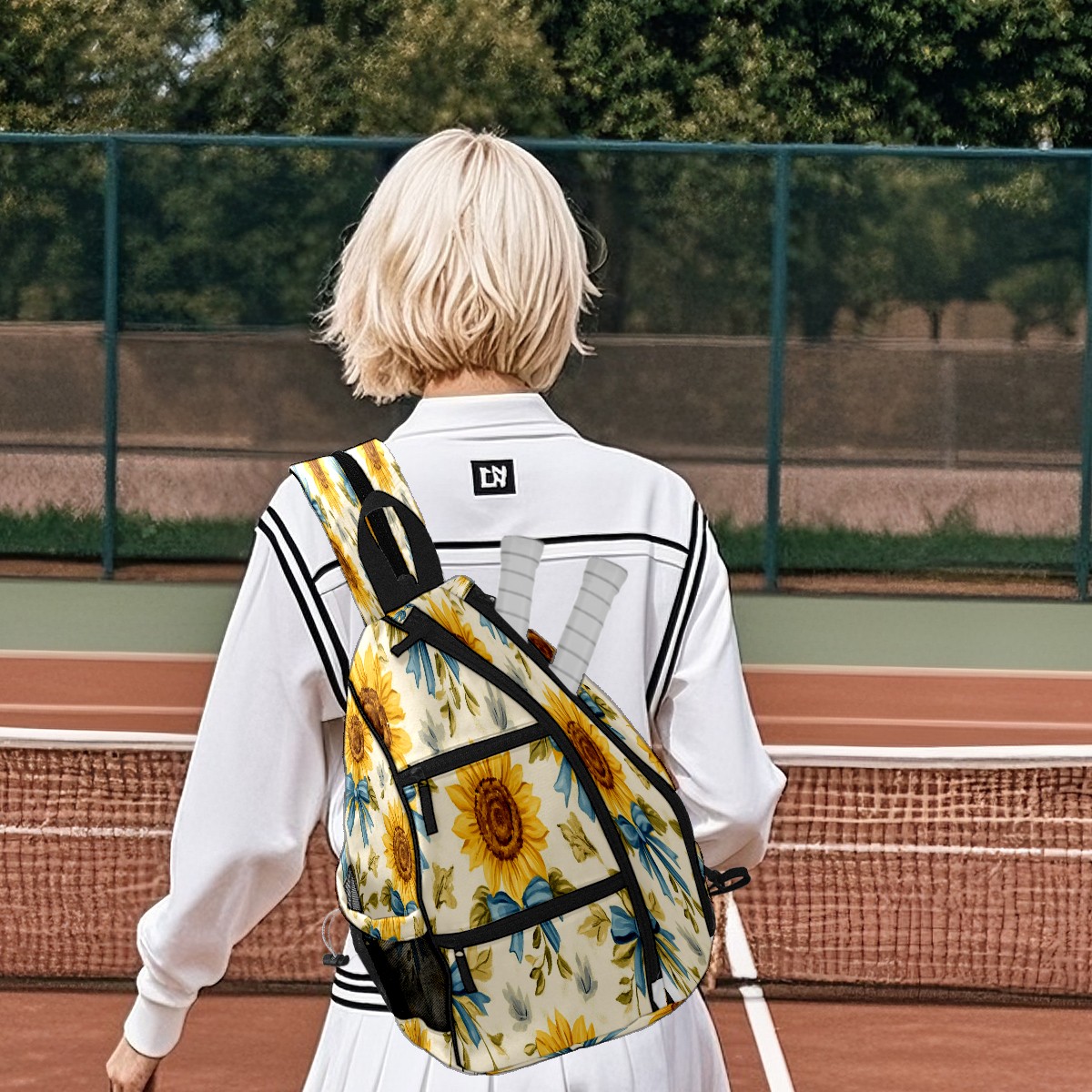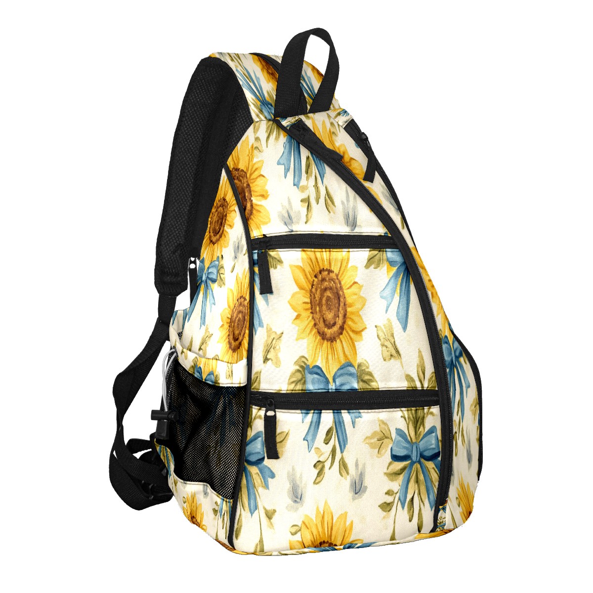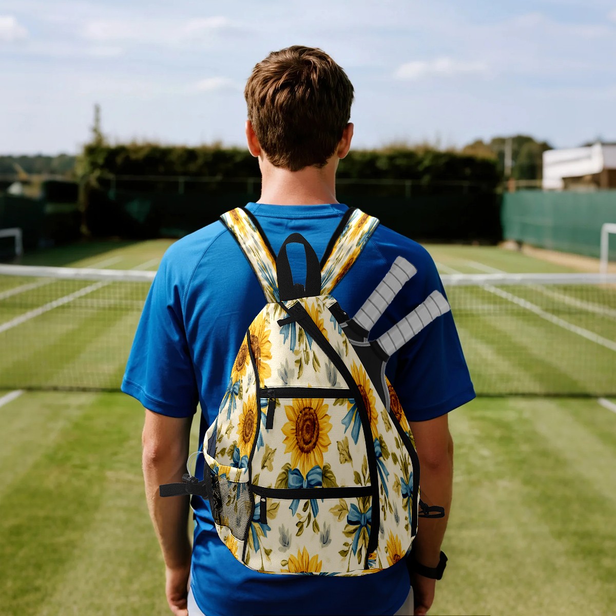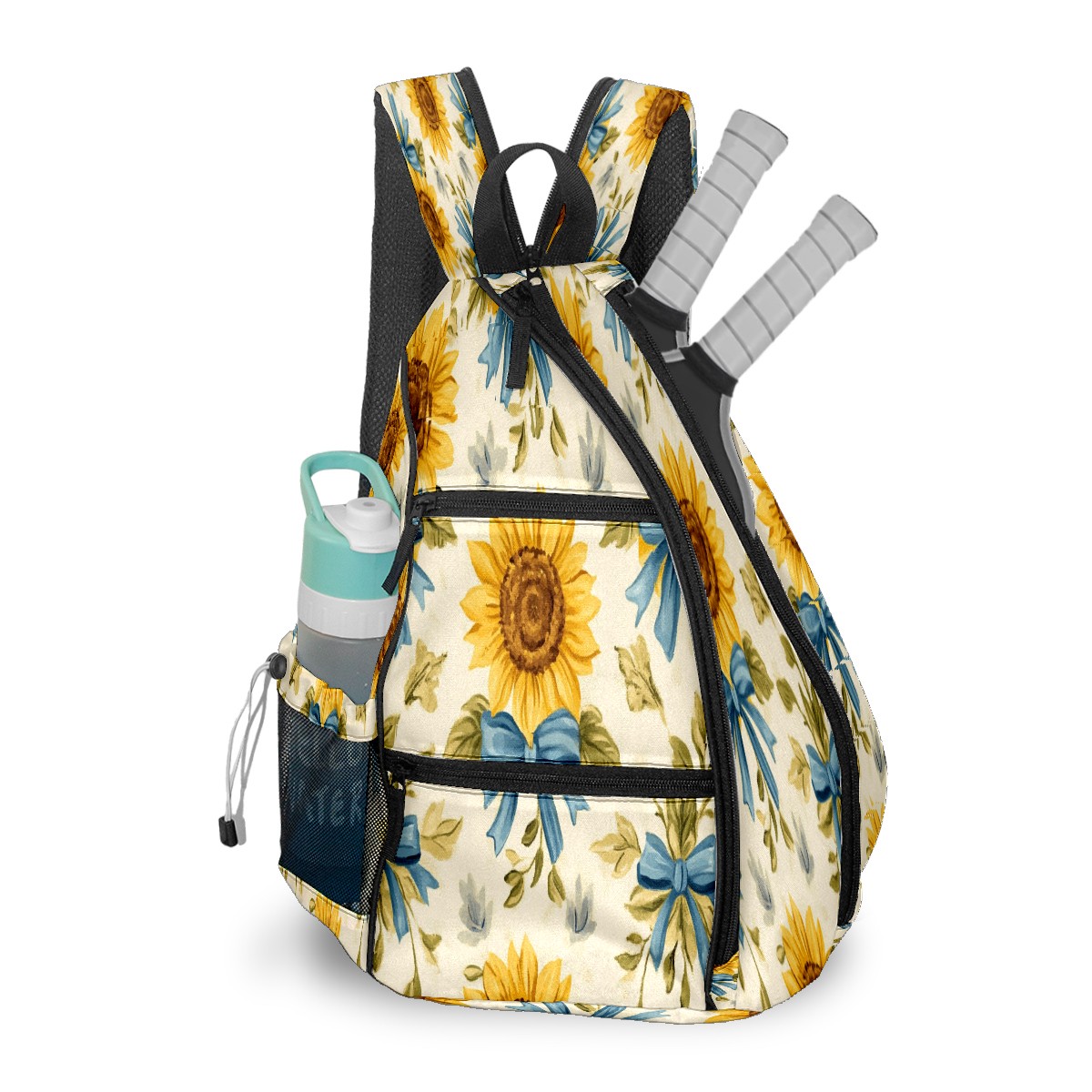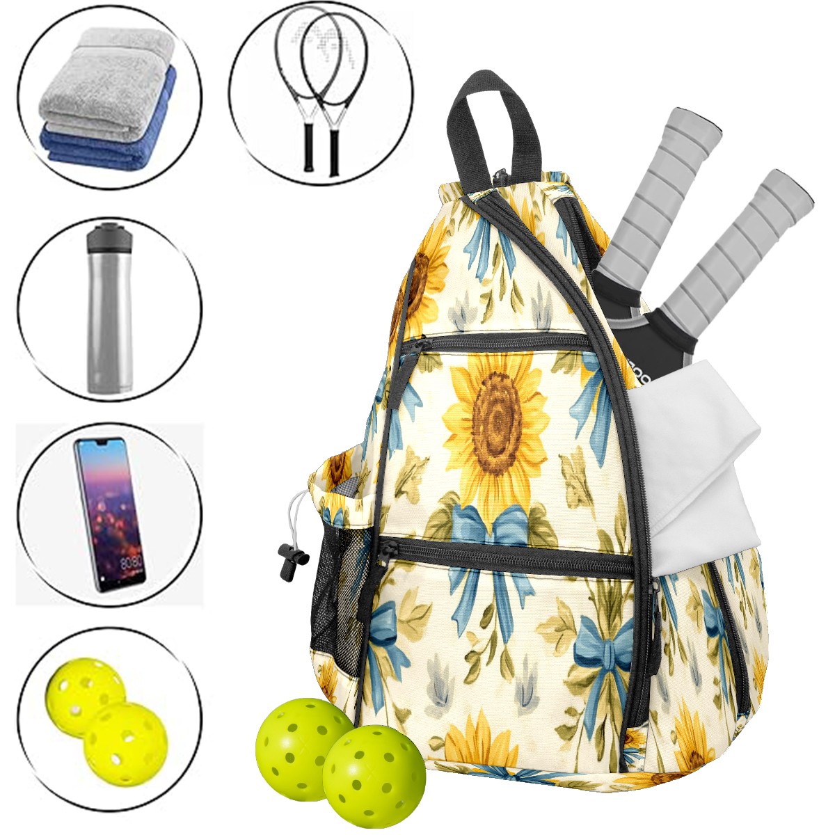 Pickleball Backpack for Women and Men, Adjustable Pickleball Sling Bag for Paddles, Balls & Accessories (Sunflowers And Blue Bows)