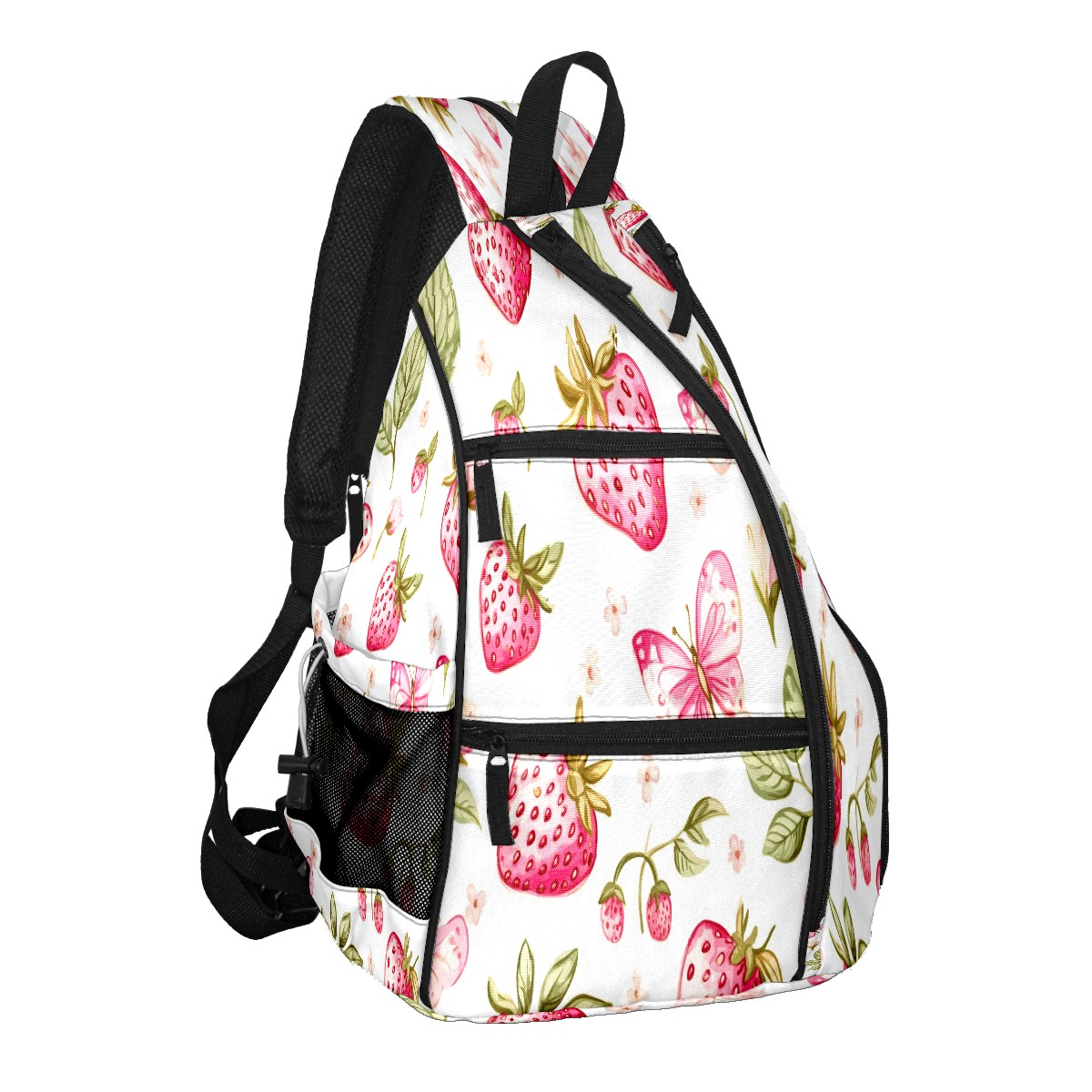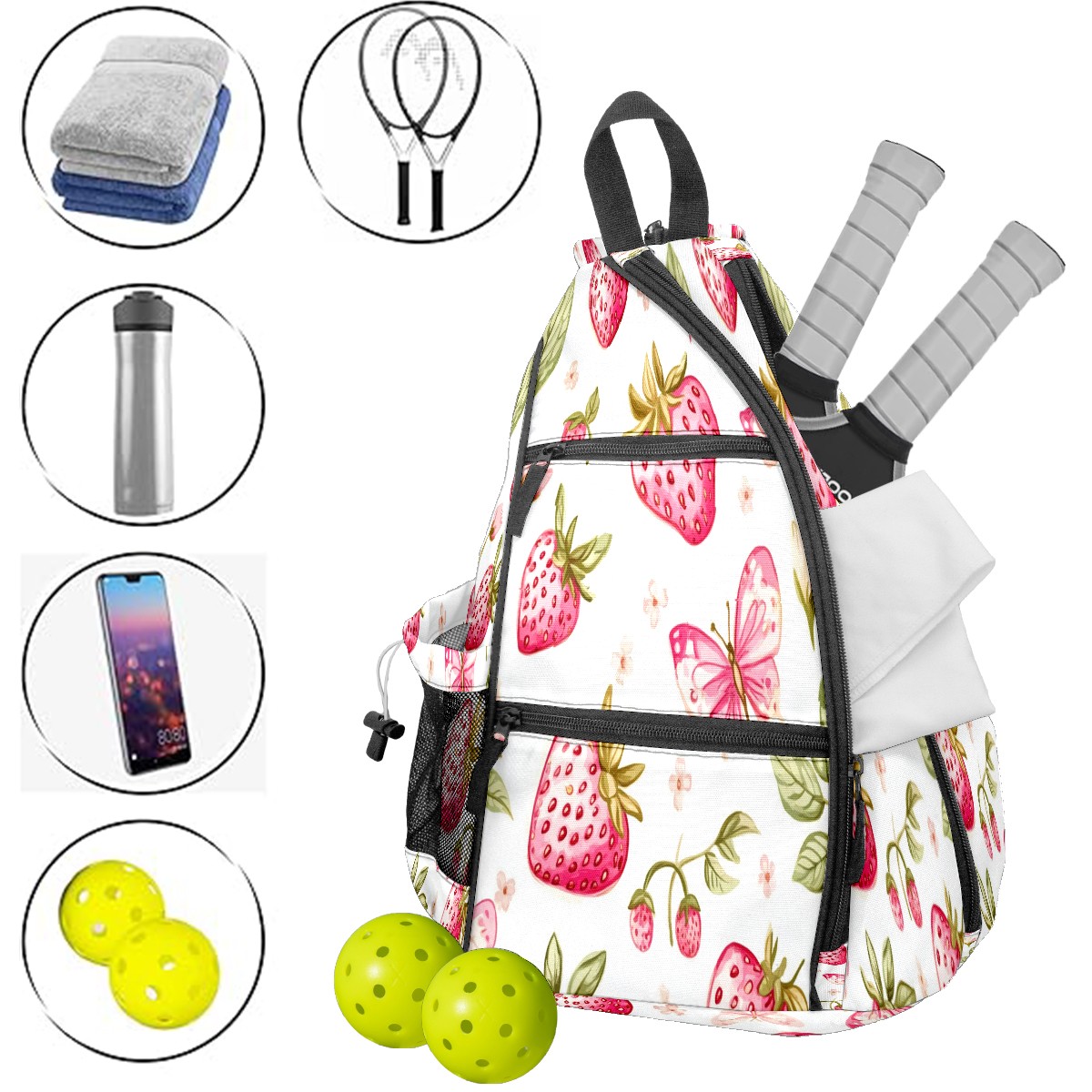 Pickleball Backpack for Women and Men, Adjustable Pickleball Sling Bag for Paddles, Balls & Accessories (Pink Strawberries And Butterflies)