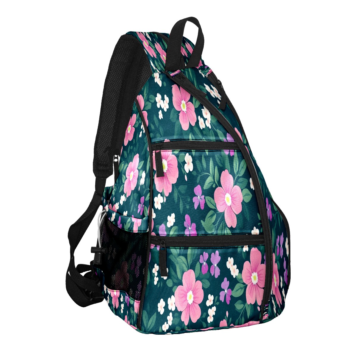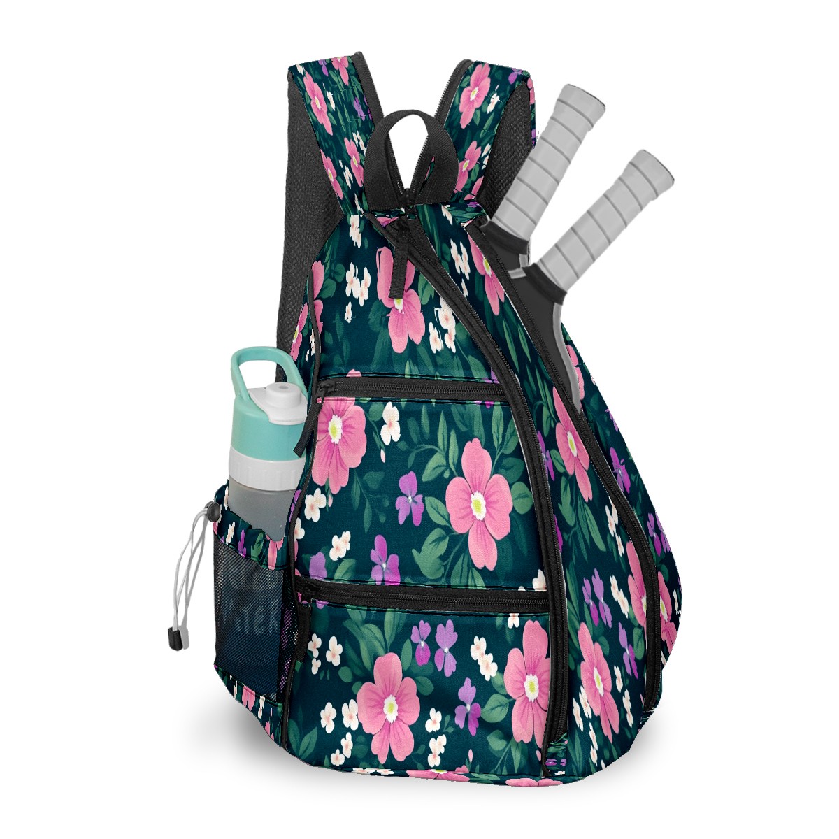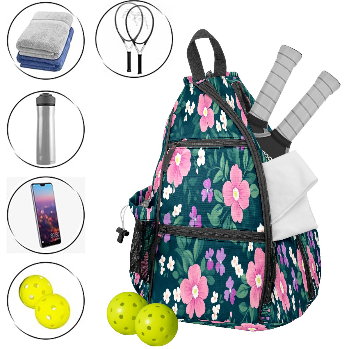 Pickleball Backpack for Women and Men, Adjustable Pickleball Sling Bag for Paddles, Balls & Accessories (Pink And Green Floral)