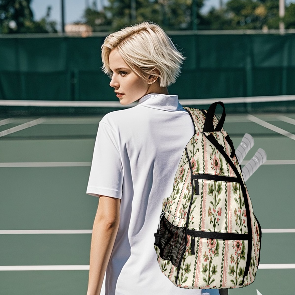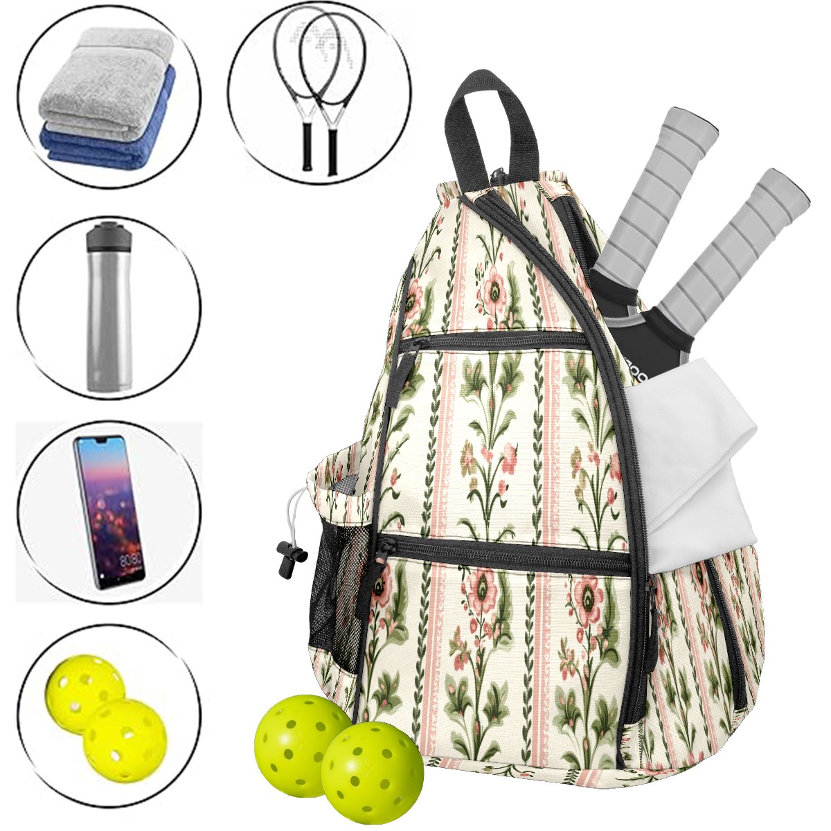 Pickleball Backpack for Women and Men, Adjustable Pickleball Sling Bag for Paddles, Balls & Accessories (Pink And Green Flowers)