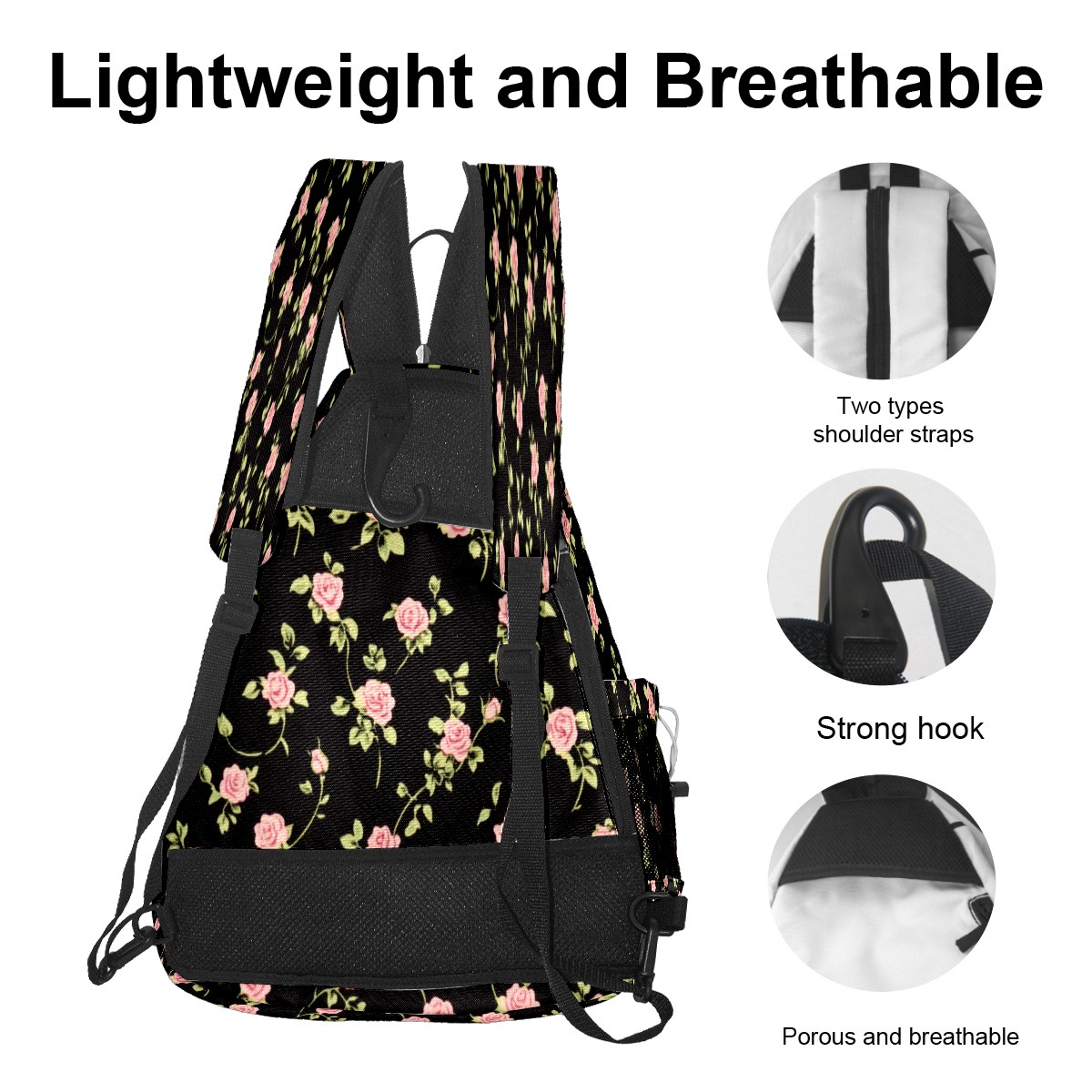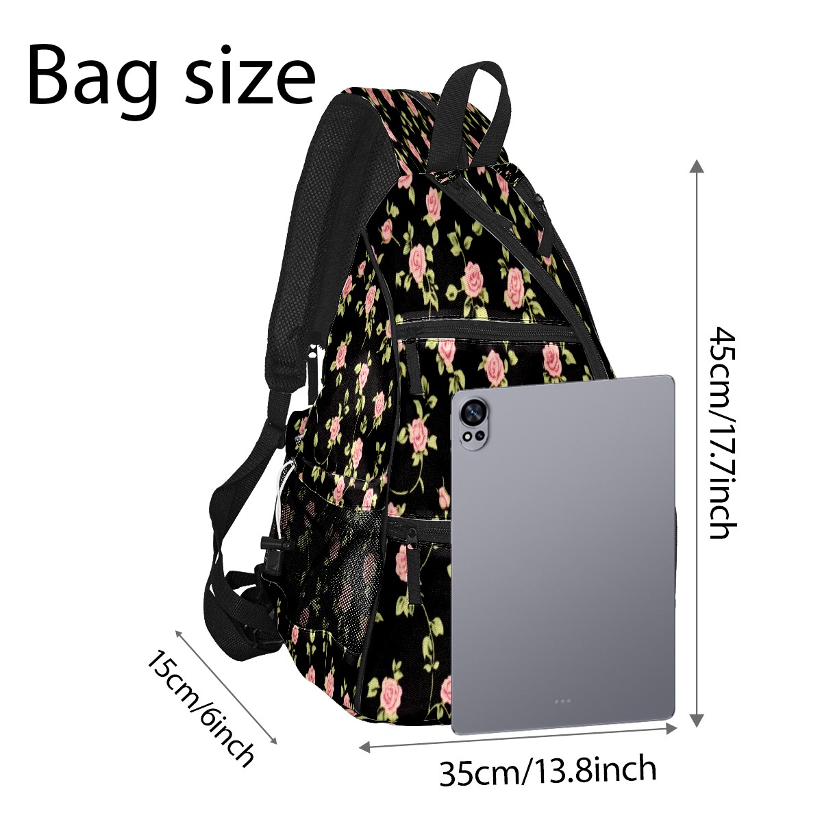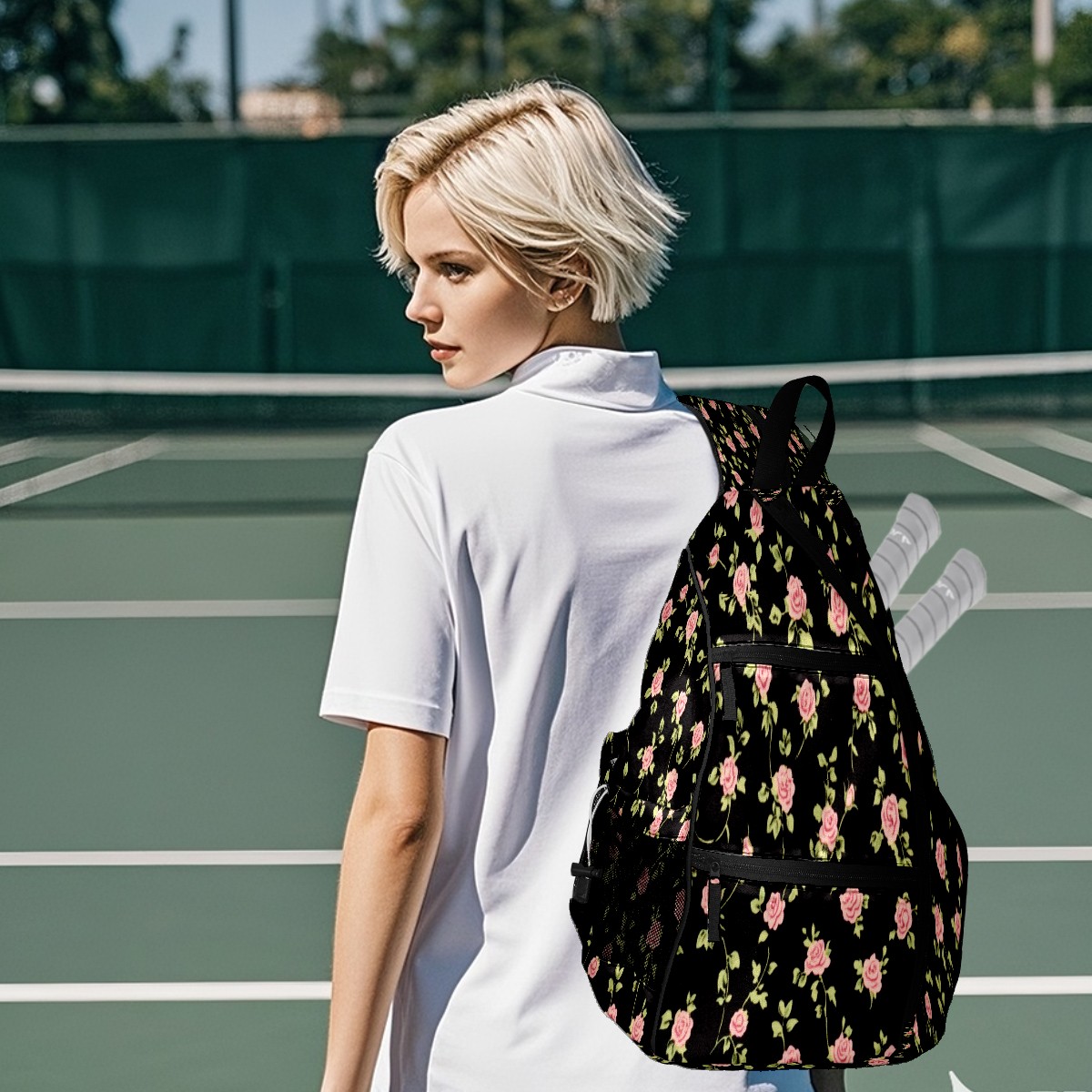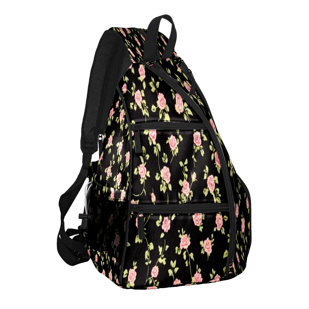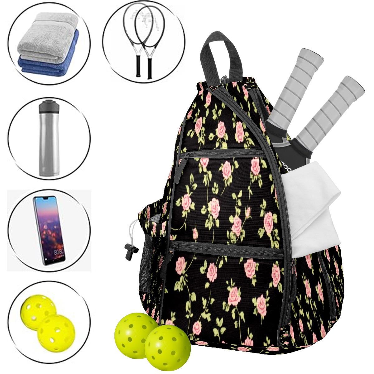 Pickleball Backpack for Women and Men, Adjustable Pickleball Sling Bag for Paddles, Balls & Accessories (Black Pink Roses)