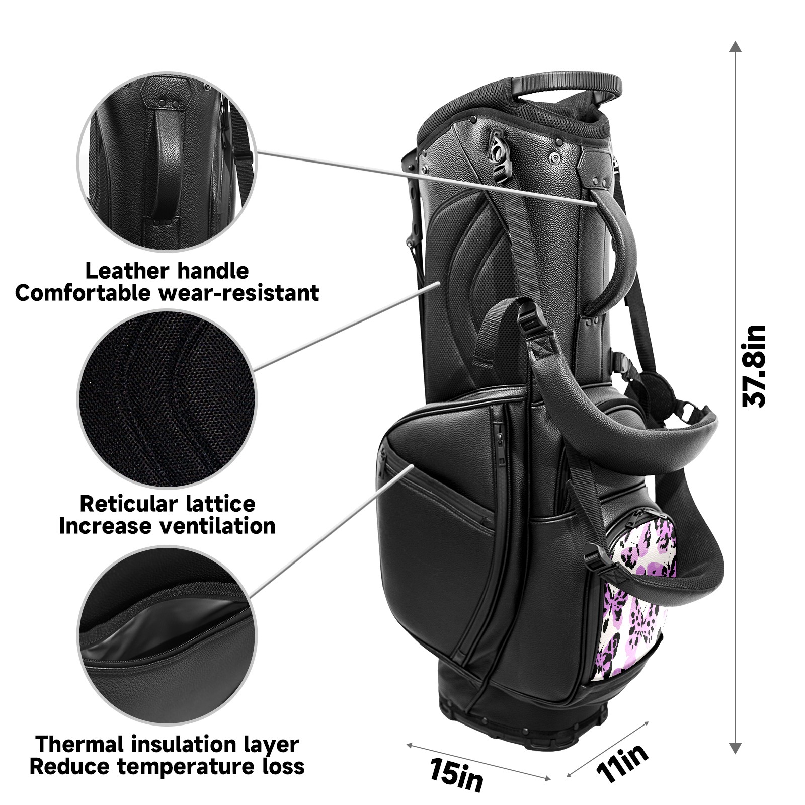 <p>This golf cart bag combines versatility with durability, providing comprehensive protection and convenient access for your clubs. The five-way top compartments provide strategic zoning for easily storing a variety of clubs and protecting them from impacts and wear. The PU fabric and sturdy plastic base combine premium quality with durability. The versatile storage system includes multiple zippered pockets and a separate cooler compartment for storing equipment, accessories, and drinks. The portable rear handle allows for easy transport. The ergonomic, padded shoulder straps are adjustable and removable to fit your shoulder and reduce weight. A built-in rain cover effectively keeps out moisture, ensuring your clubs stay dry and protected in wet weather. This is the ideal golf bag for your golfing adventure.<br></p>