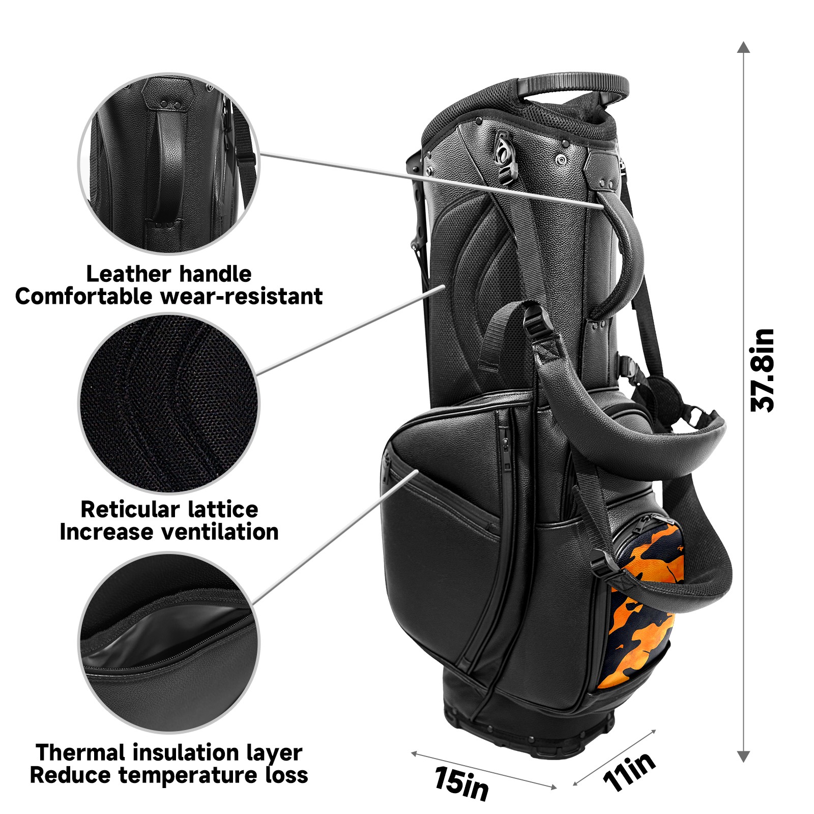 • <p>This golf cart bag combines versatility with durability, providing comprehensive protection and convenient access for your clubs. The five-way top compartments provide strategic zoning for easily storing a variety of clubs and protecting them from impacts and wear. The PU fabric and sturdy plastic base combine premium quality with durability. The versatile storage system includes multiple zippered pockets and a separate cooler compartment for storing equipment, accessories, and drinks. The portable rear handle allows for easy transport. The ergonomic, padded shoulder straps are adjustable and removable to fit your shoulder and reduce weight. A built-in rain cover effectively keeps out moisture, ensuring your clubs stay dry and protected in wet weather. This is the ideal golf bag for your golfing adventure.<br></p>