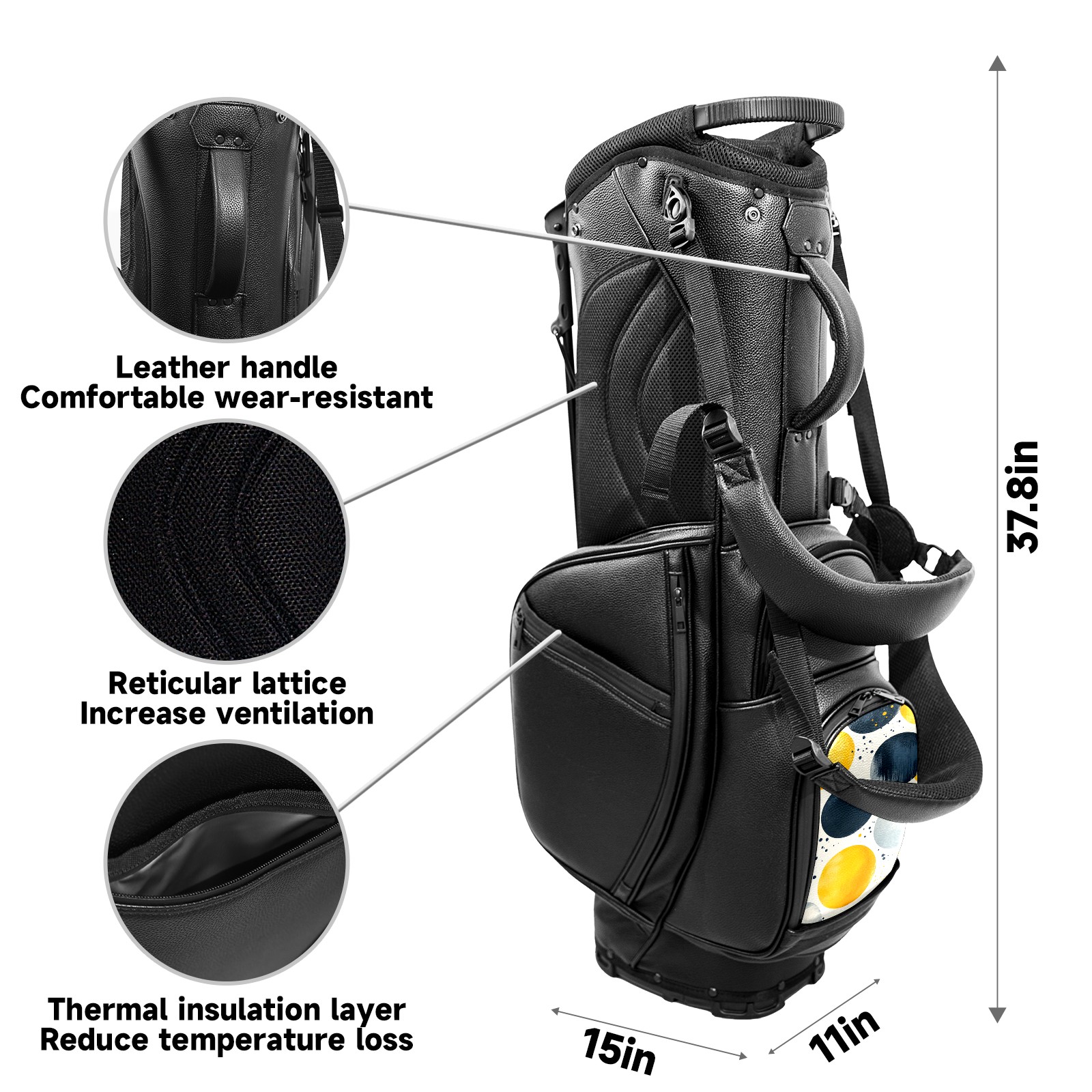 <p>This golf cart bag combines versatility with durability, providing comprehensive protection and convenient access for your clubs. The five-way top compartments provide strategic zoning for easily storing a variety of clubs and protecting them from impacts and wear. The PU fabric and sturdy plastic base combine premium quality with durability. The versatile storage system includes multiple zippered pockets and a separate cooler compartment for storing equipment, accessories, and drinks. The portable rear handle allows for easy transport. The ergonomic, padded shoulder straps are adjustable and removable to fit your shoulder and reduce weight. A built-in rain cover effectively keeps out moisture, ensuring your clubs stay dry and protected in wet weather. This is the ideal golf bag for your golfing adventure.<br></p>