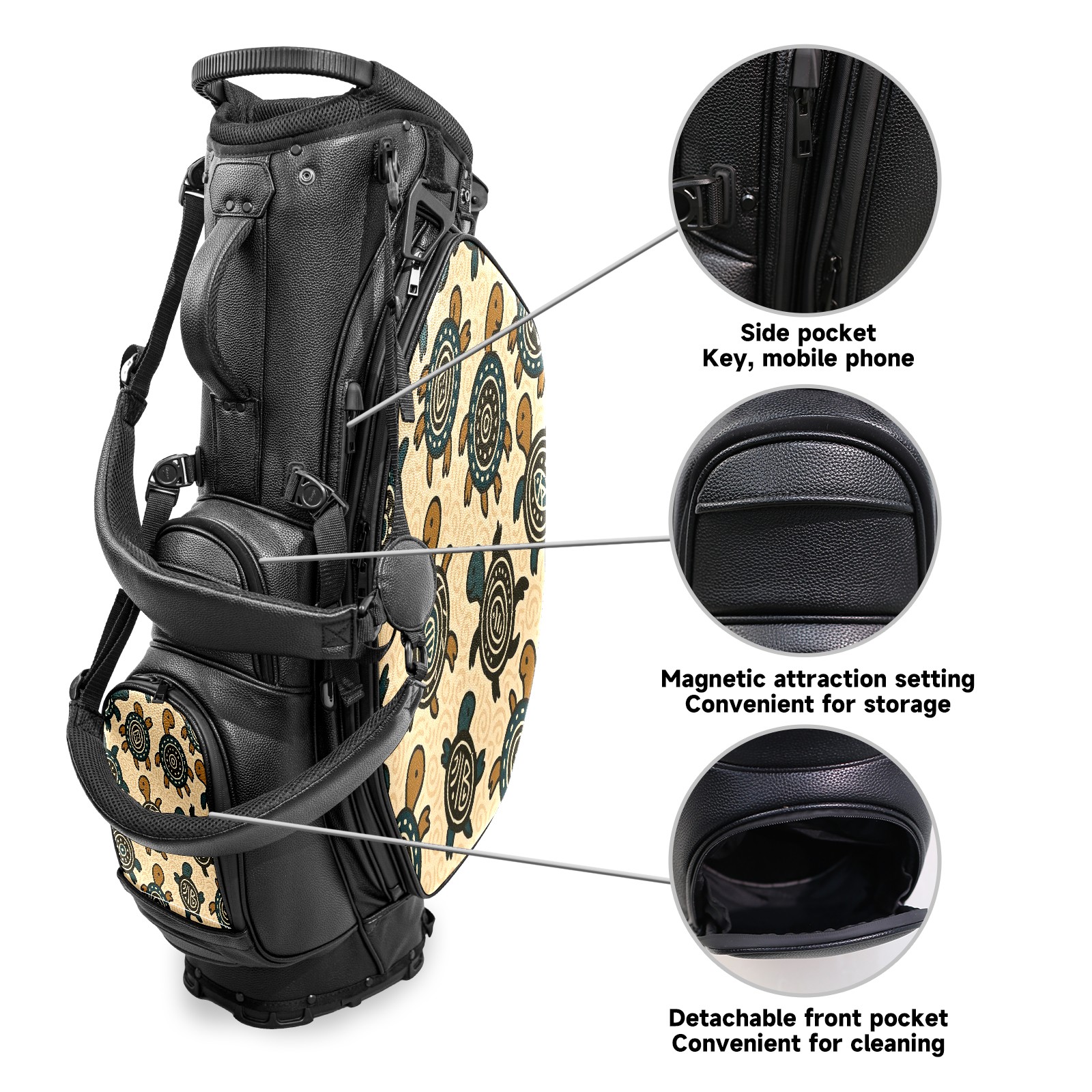 <p>This golf cart bag combines versatility with durability, providing comprehensive protection and convenient access for your clubs. The five-way top compartments provide strategic zoning for easily storing a variety of clubs and protecting them from impacts and wear. The PU fabric and sturdy plastic base combine premium quality with durability. The versatile storage system includes multiple zippered pockets and a separate cooler compartment for storing equipment, accessories, and drinks. The portable rear handle allows for easy transport. The ergonomic, padded shoulder straps are adjustable and removable to fit your shoulder and reduce weight. A built-in rain cover effectively keeps out moisture, ensuring your clubs stay dry and protected in wet weather. This is the ideal golf bag for your golfing adventure.<br></p>