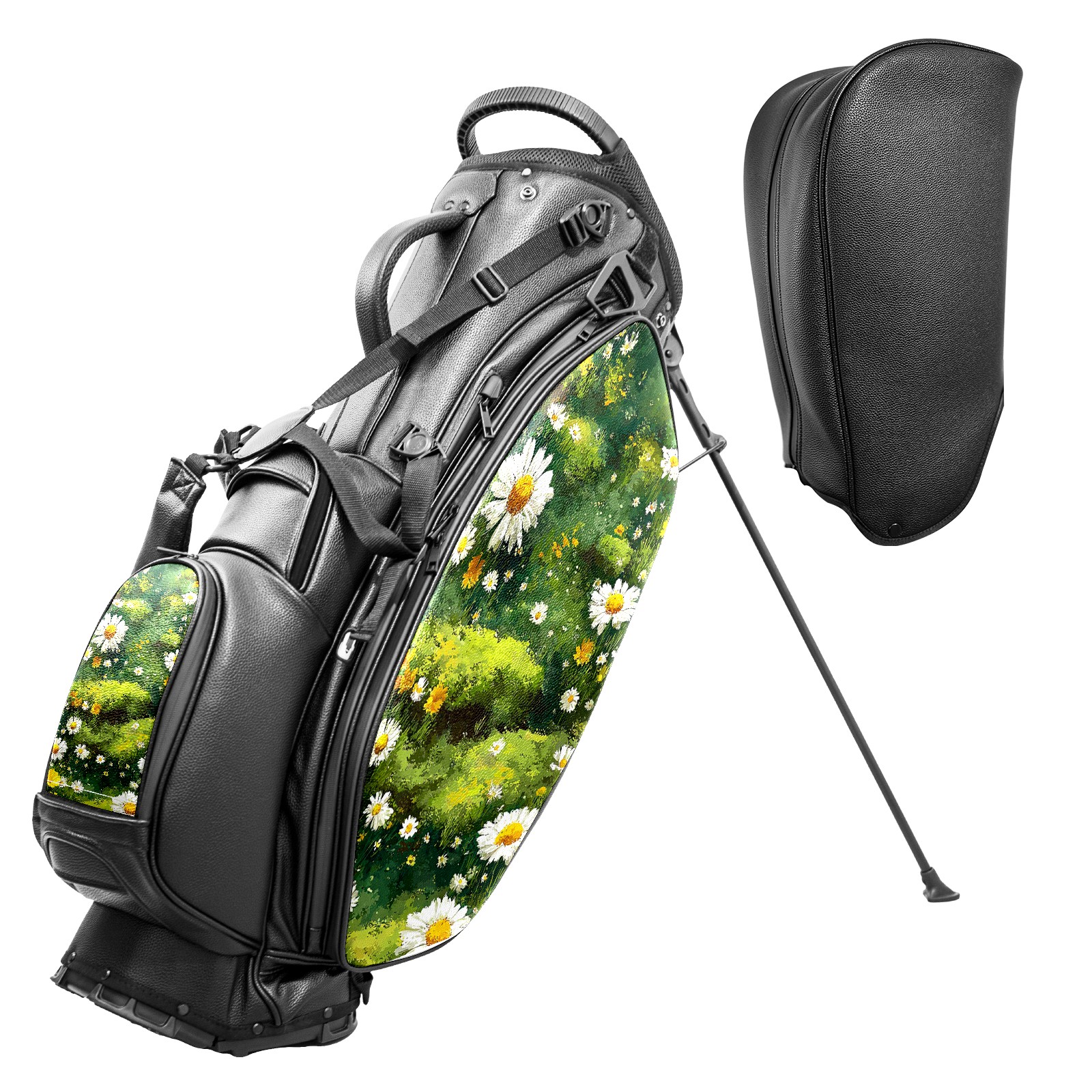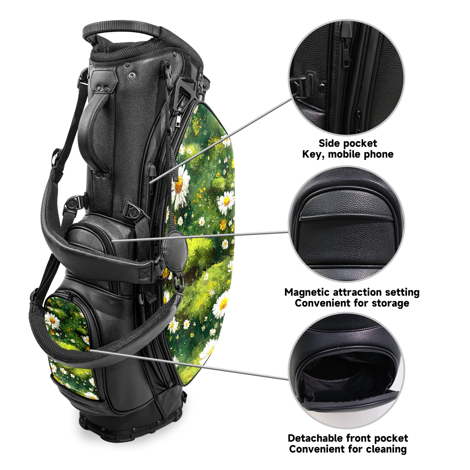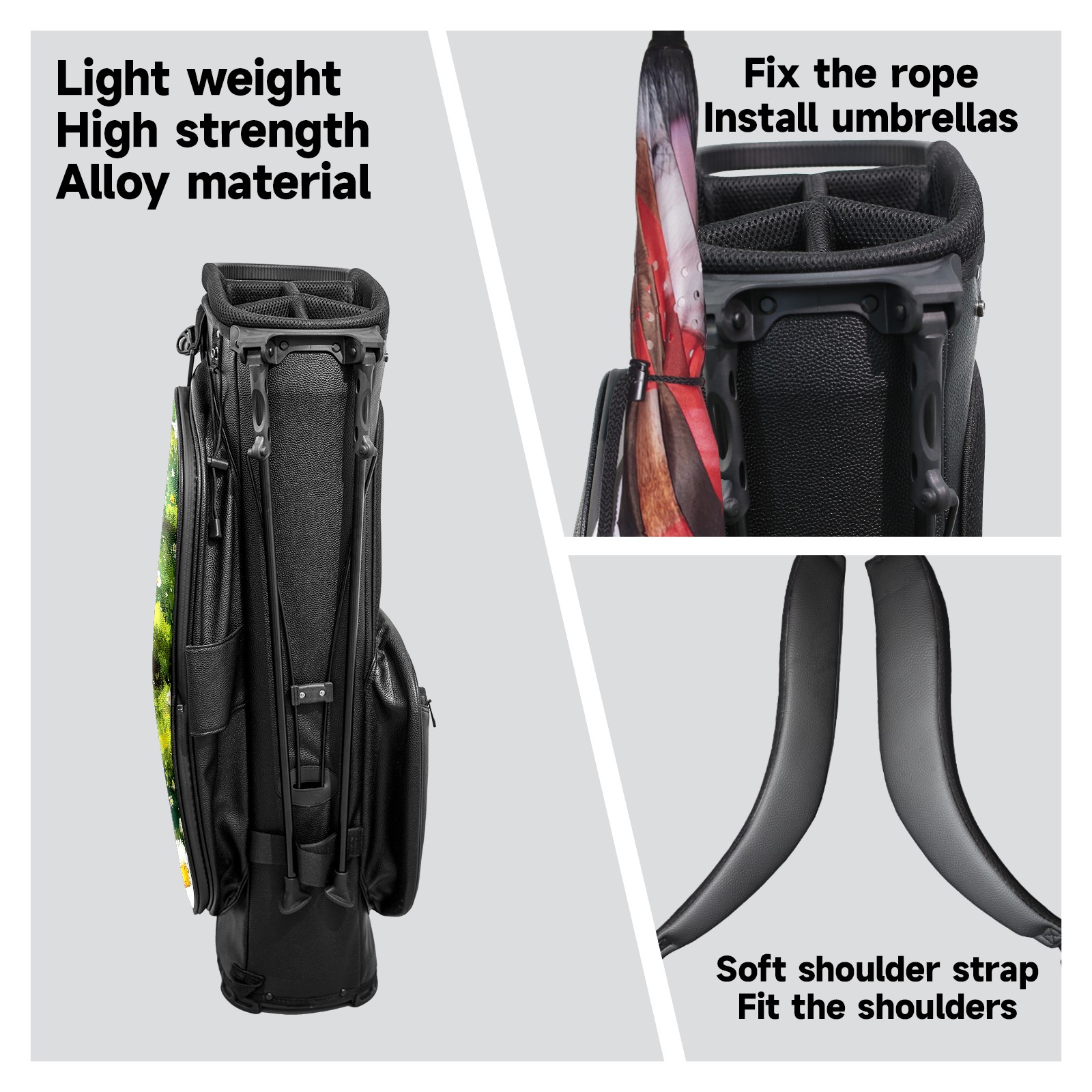 <p>This golf cart bag combines versatility with durability, providing comprehensive protection and convenient access for your clubs. The five-way top compartments provide strategic zoning for easily storing a variety of clubs and protecting them from impacts and wear. The PU fabric and sturdy plastic base combine premium quality with durability. The versatile storage system includes multiple zippered pockets and a separate cooler compartment for storing equipment, accessories, and drinks. The portable rear handle allows for easy transport. The ergonomic, padded shoulder straps are adjustable and removable to fit your shoulder and reduce weight. A built-in rain cover effectively keeps out moisture, ensuring your clubs stay dry and protected in wet weather. This is the ideal golf bag for your golfing adventure.<br></p>