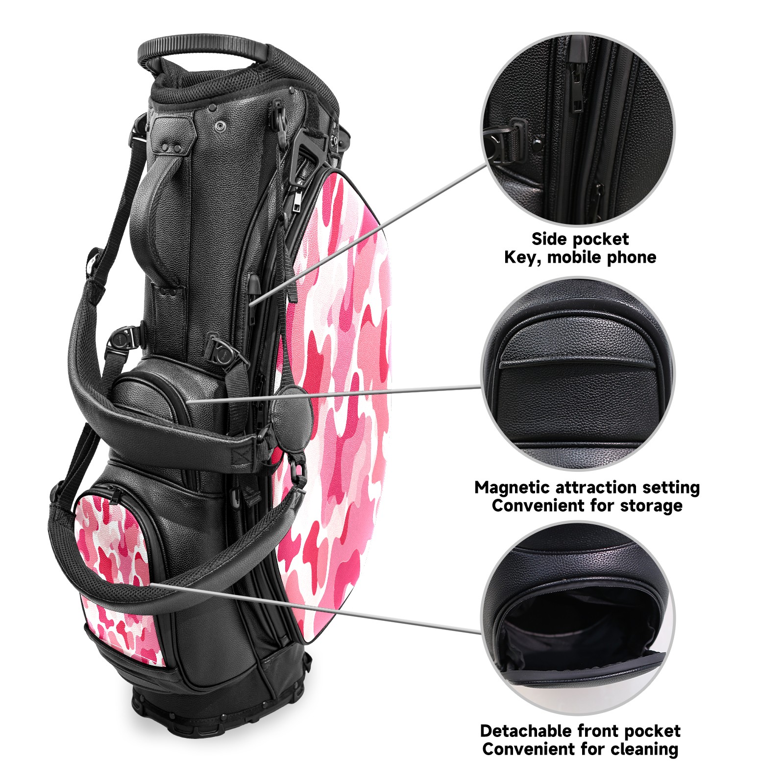 <p>This golf cart bag combines versatility with durability, providing comprehensive protection and convenient access for your clubs. The five-way top compartments provide strategic zoning for easily storing a variety of clubs and protecting them from impacts and wear. The PU fabric and sturdy plastic base combine premium quality with durability. The versatile storage system includes multiple zippered pockets and a separate cooler compartment for storing equipment, accessories, and drinks. The portable rear handle allows for easy transport. The ergonomic, padded shoulder straps are adjustable and removable to fit your shoulder and reduce weight. A built-in rain cover effectively keeps out moisture, ensuring your clubs stay dry and protected in wet weather. This is the ideal golf bag for your golfing adventure.<br></p>