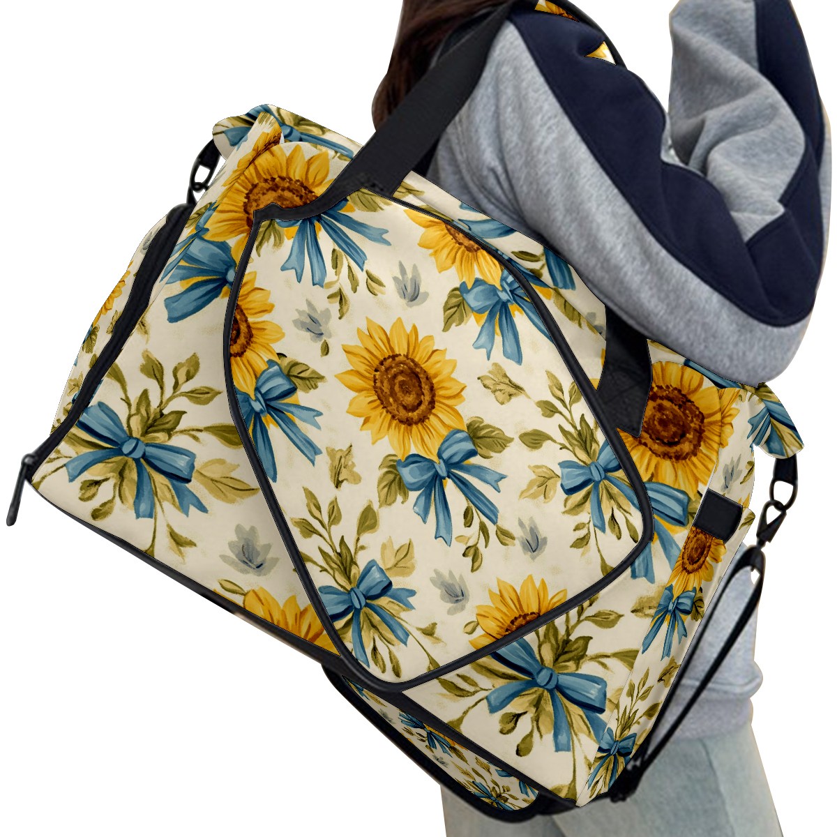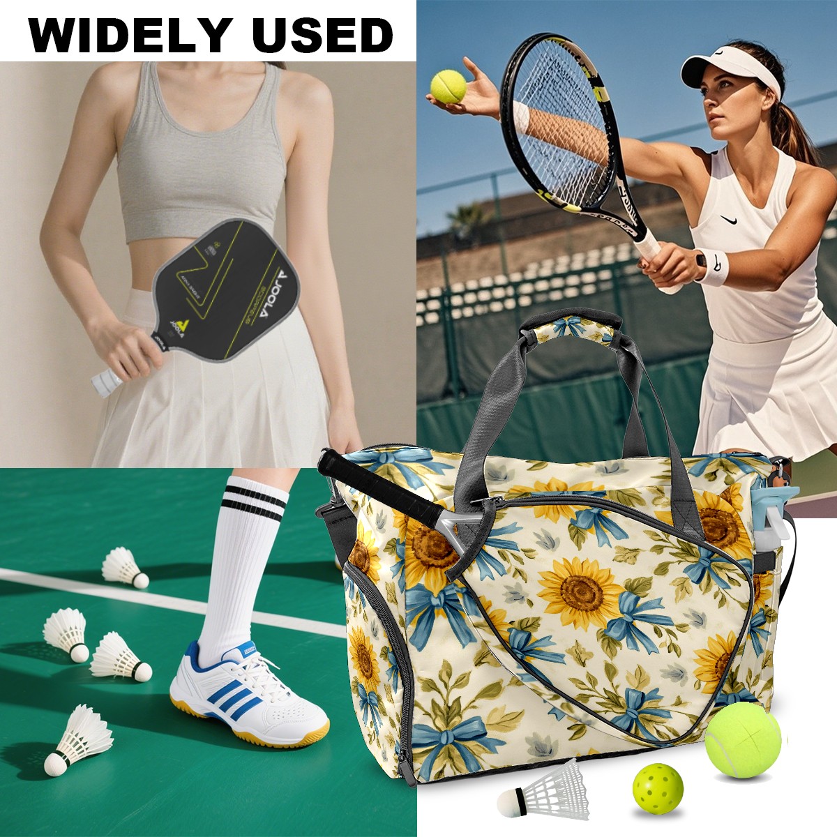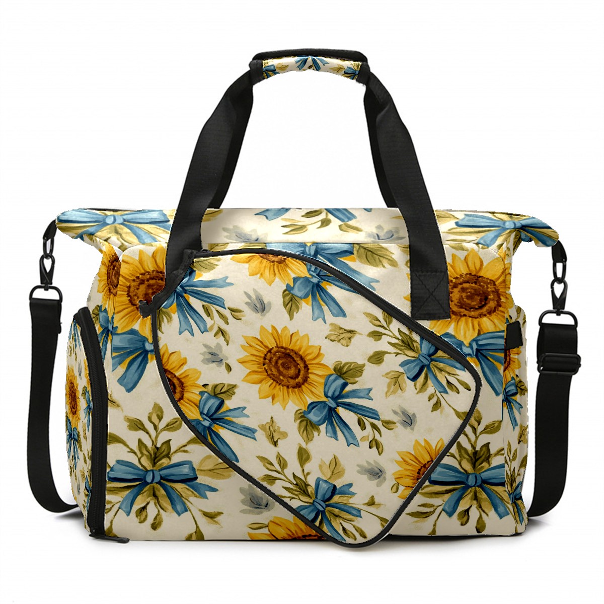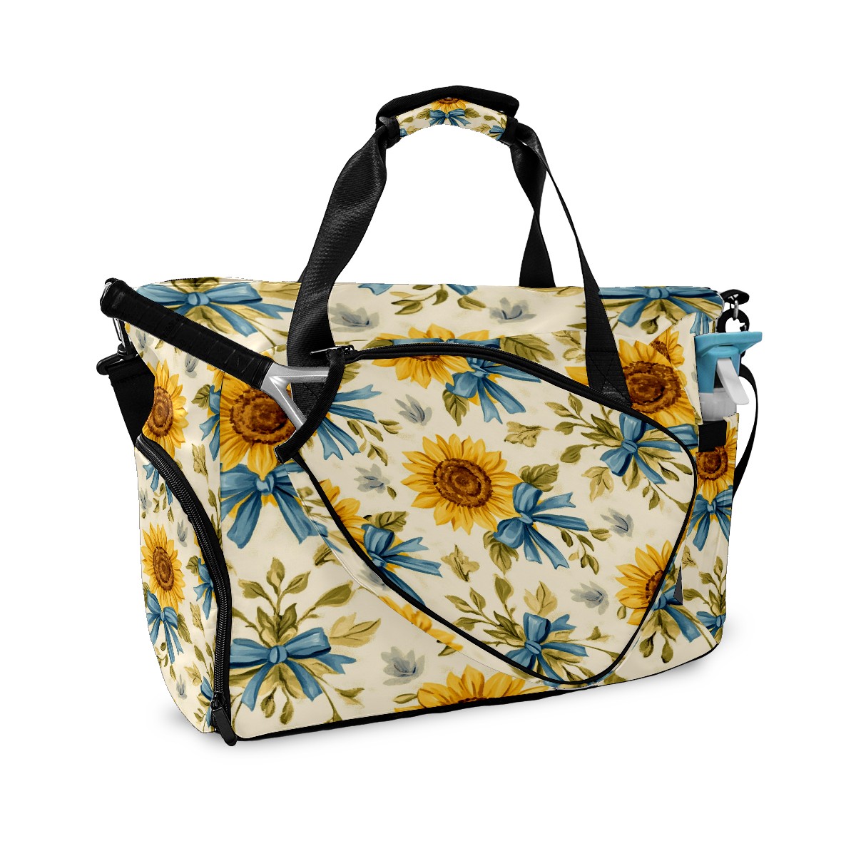Pickleball Tote Bag Carryall for Paddles Balls and Accessories, Portable Lightweight Gear Bag for Players(Sunflowers And Blue Bows)