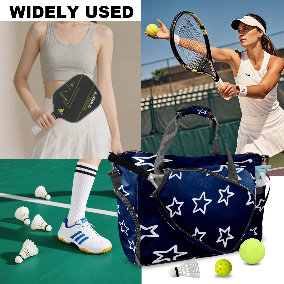 Lightweight Pickleball Tote Bag with Large Capacity, Shoe Compartment, Large Paddle Storage, Water Bottle Holder & Fence Hook for Women & Men Star