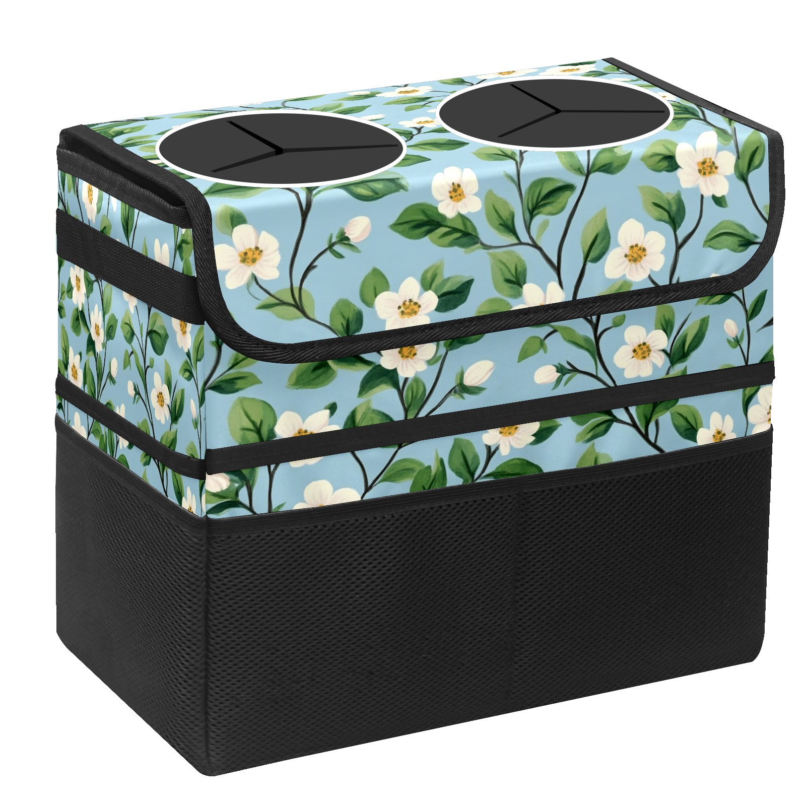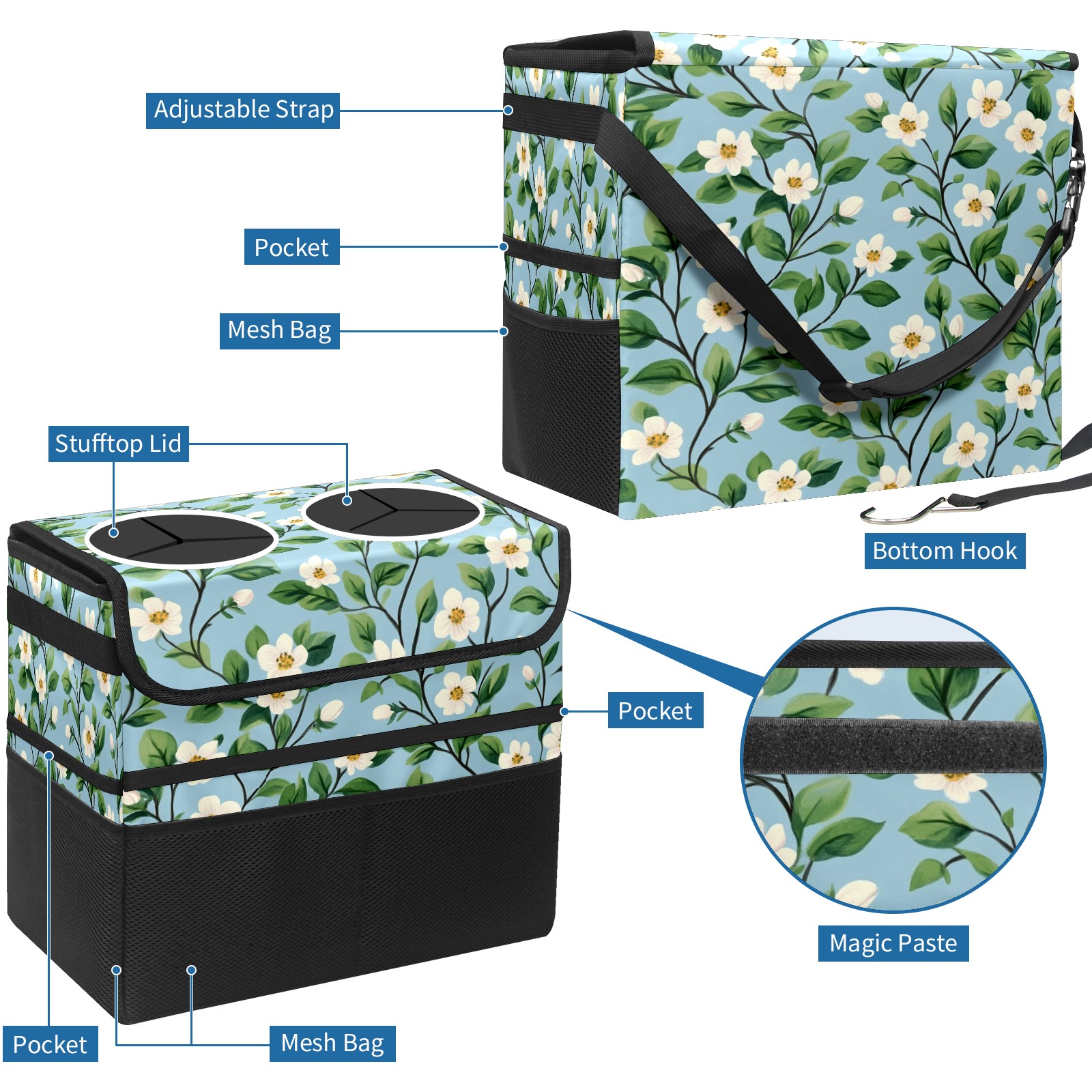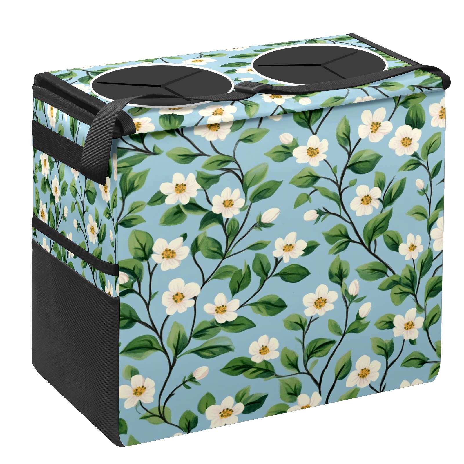 Car Trash Can with Lid, Portable Hanging Automotive Garbage Bin for Vehicles, Leakproof Waste Bag Container for SUV Truck Van Interior Auto Travel Road Trips(Small White Flowers)