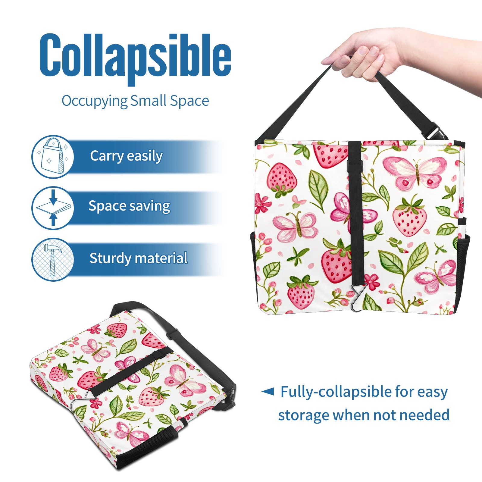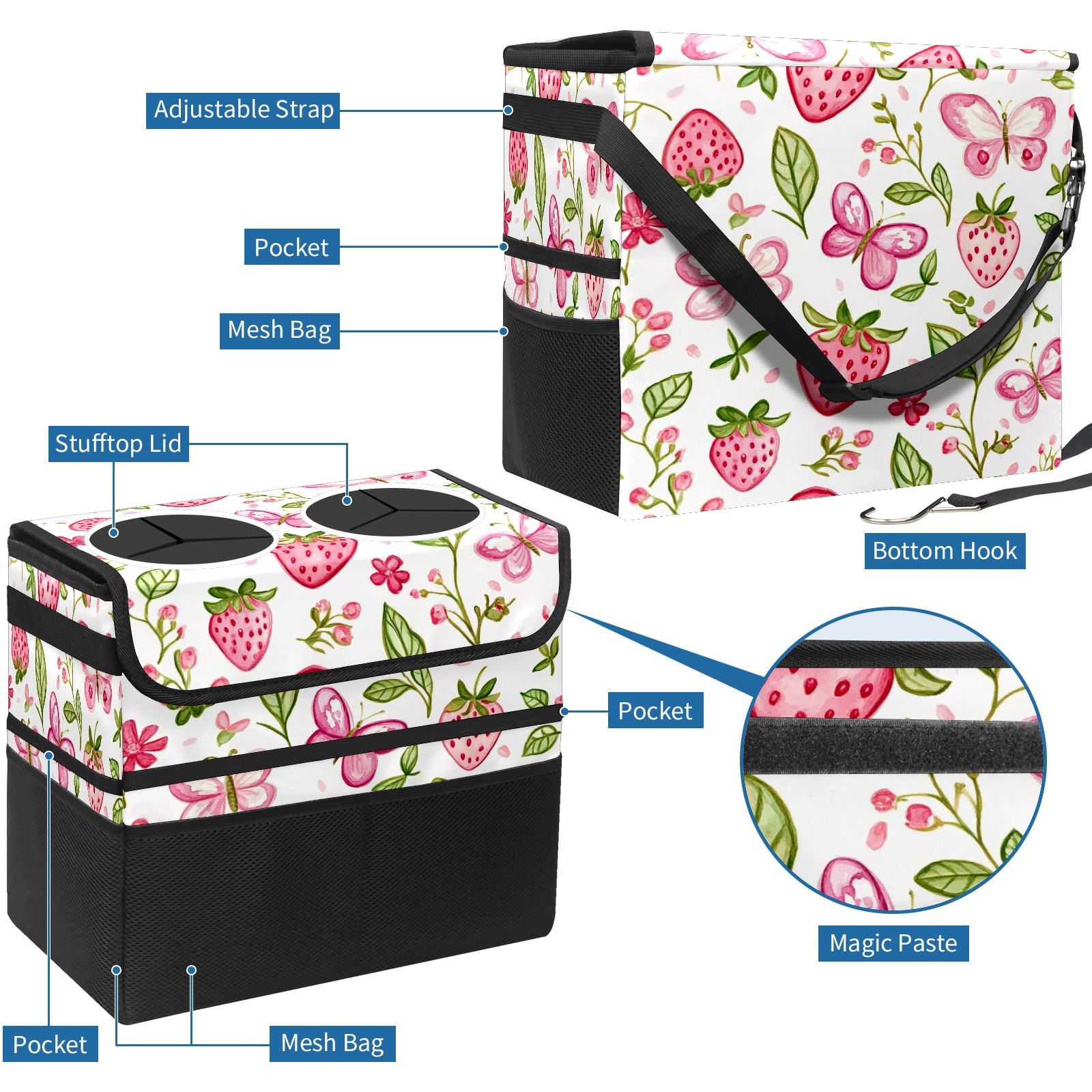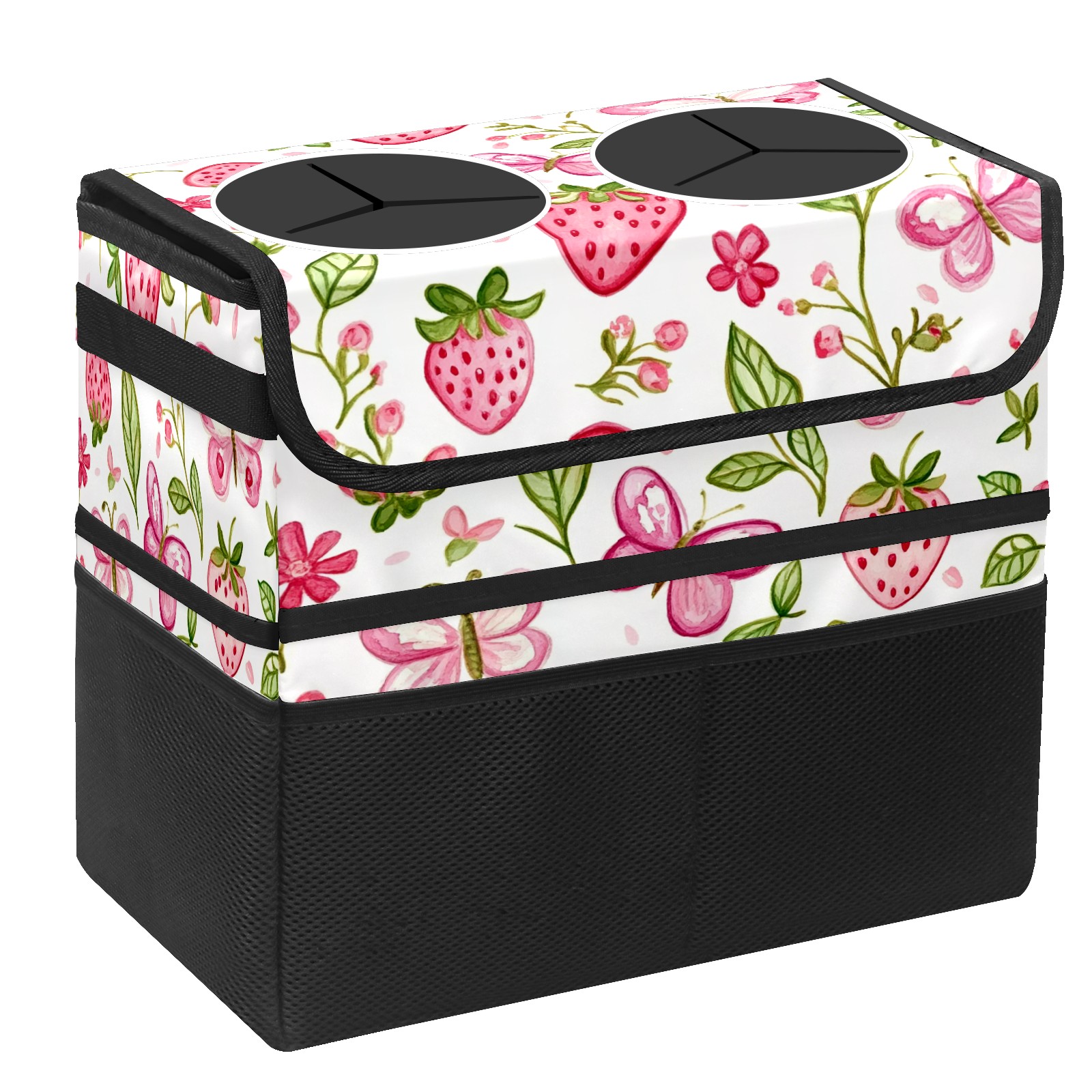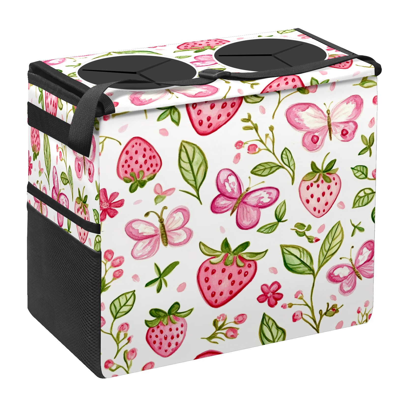 Car Trash Can with Lid, Portable Hanging Automotive Garbage Bin for Vehicles, Leakproof Waste Bag Container for SUV Truck Van Interior Auto Travel Road Trips(Pink Strawberry And Butterfly)