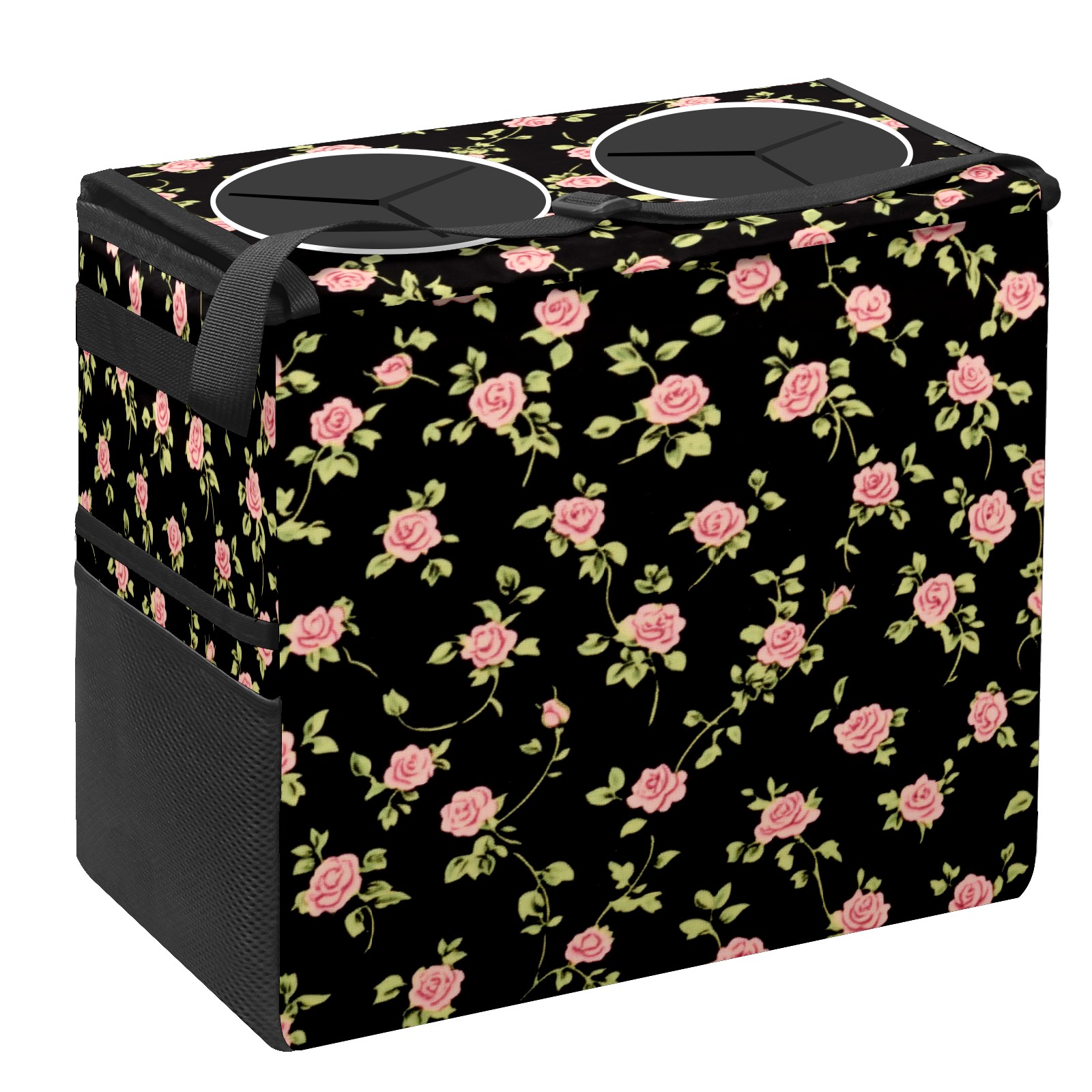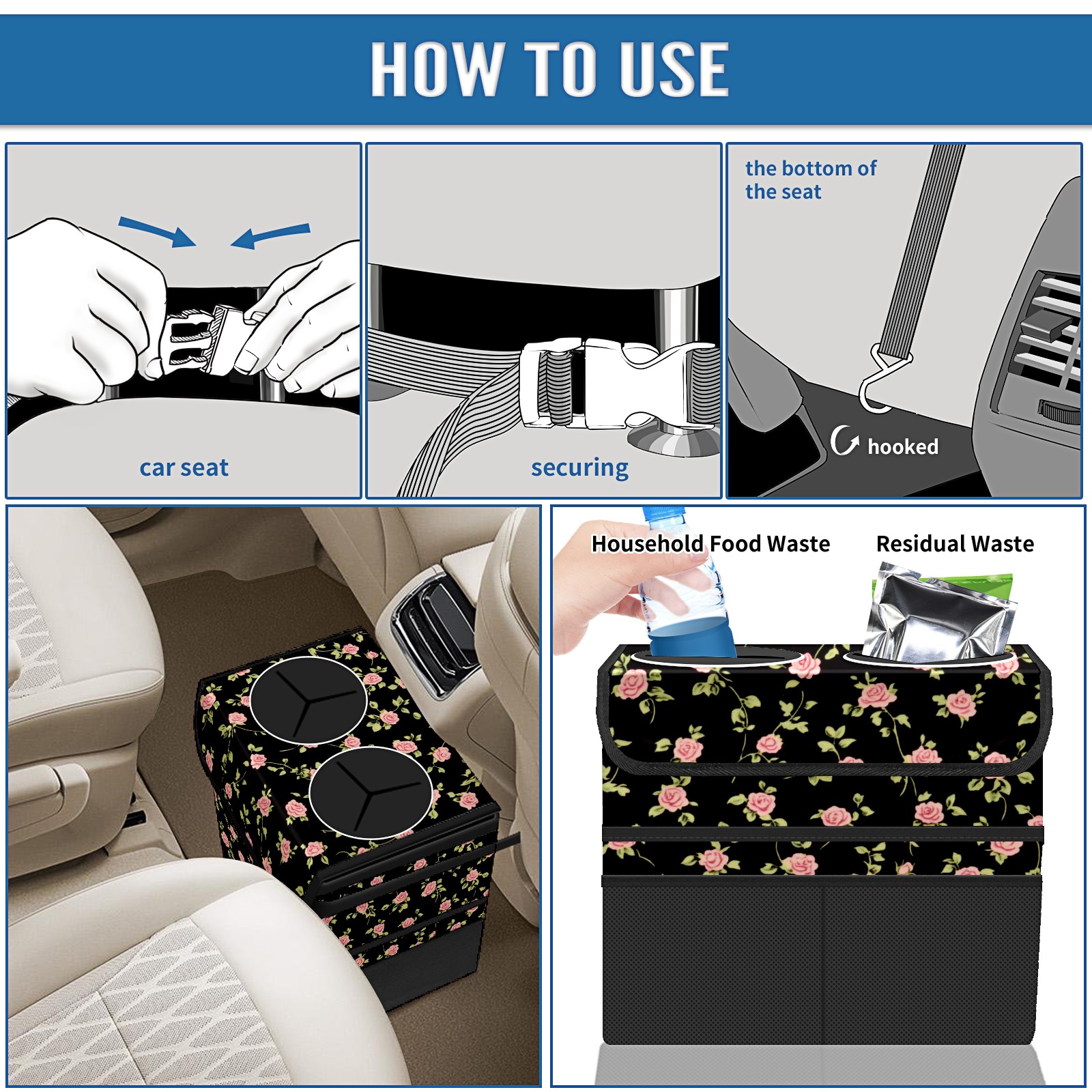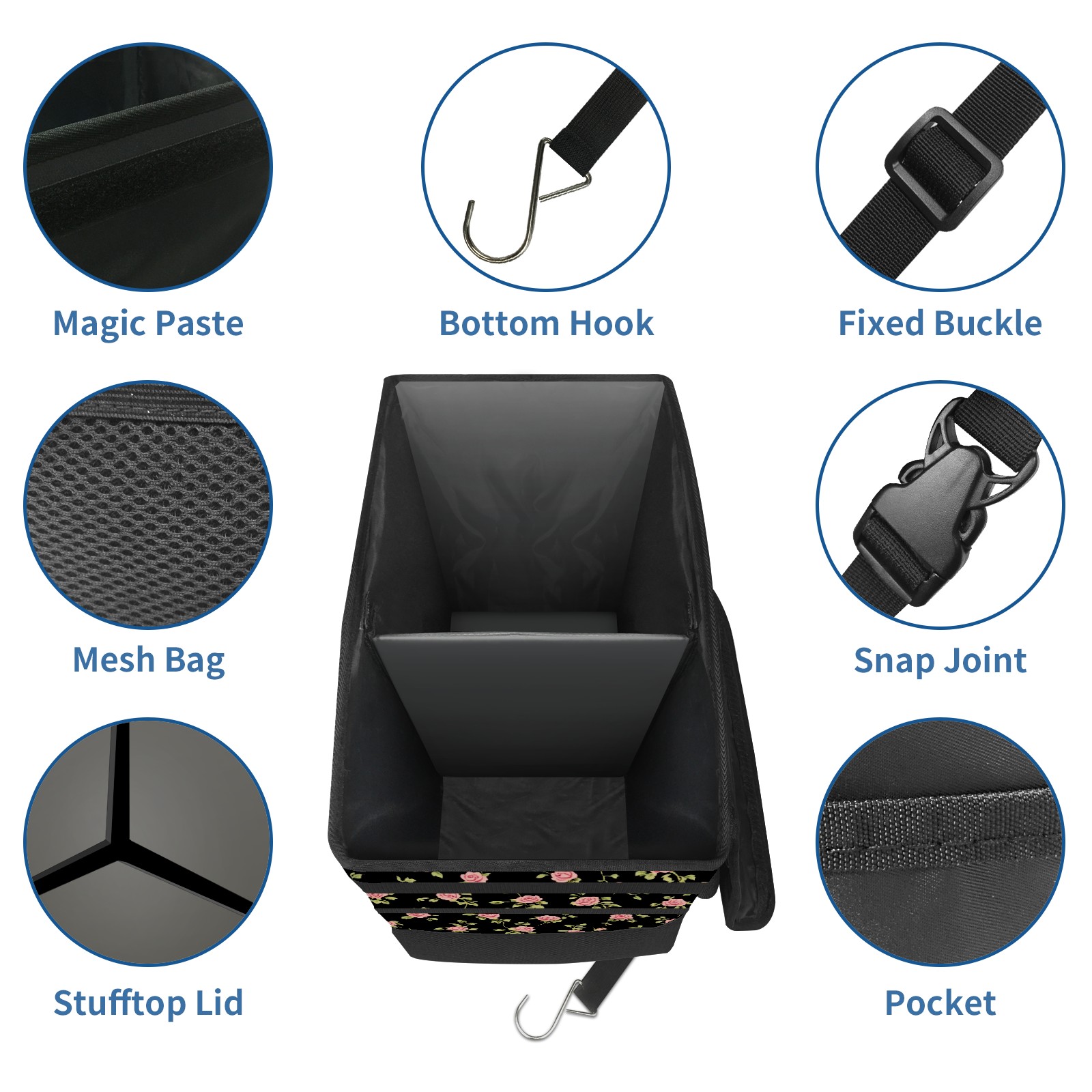 Car Trash Can with Lid, Portable Hanging Automotive Garbage Bin for Vehicles, Leakproof Waste Bag Container for SUV Truck Van Interior Auto Travel Road Trips(Black Pink Roses)