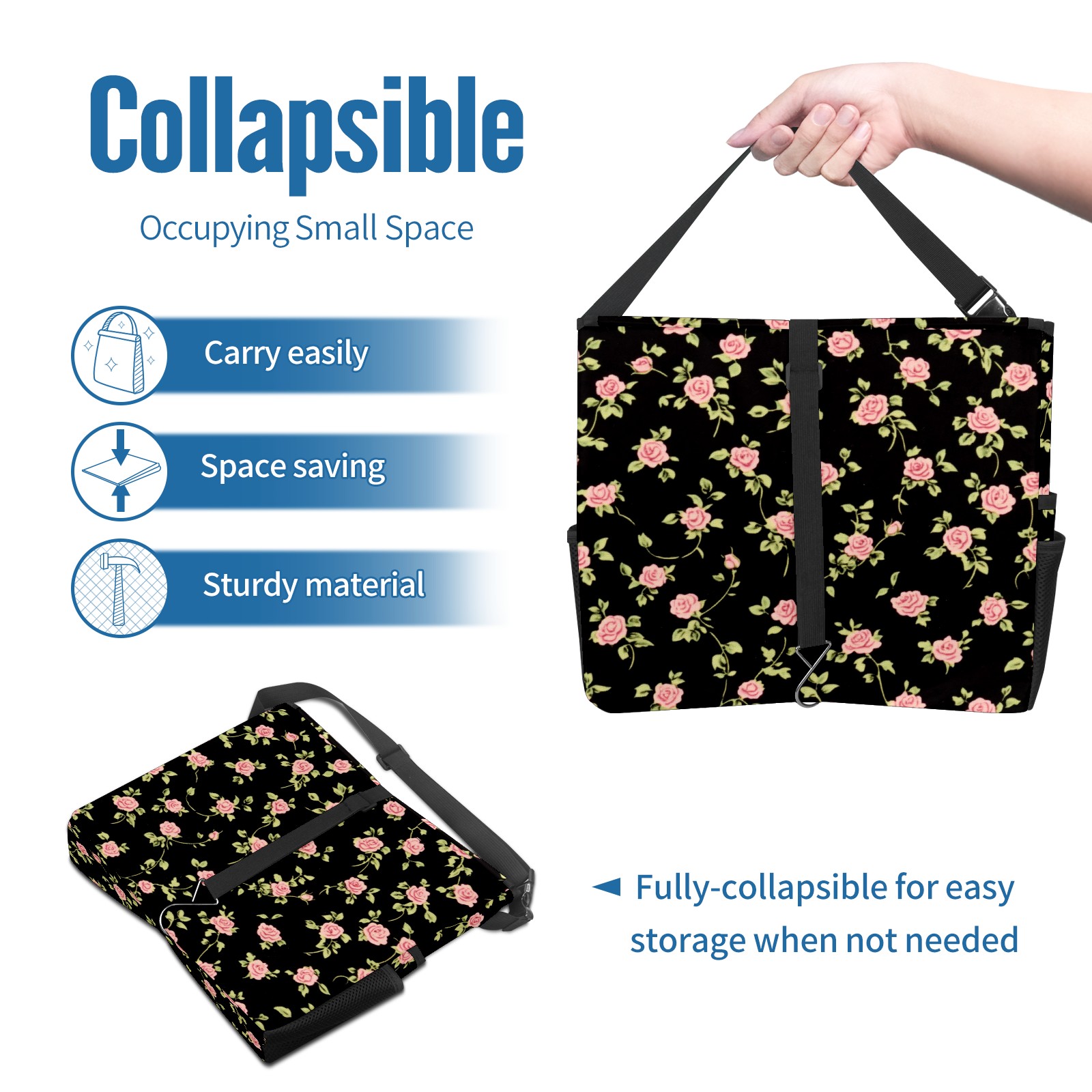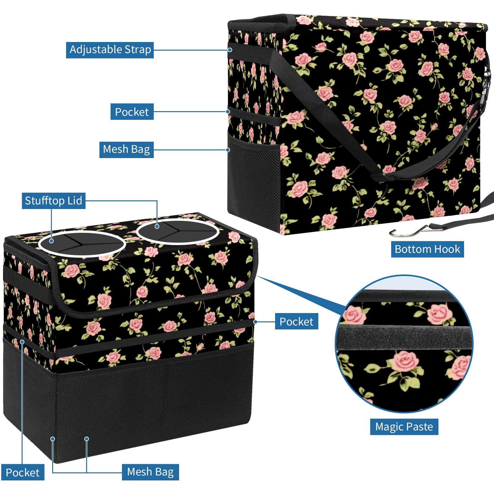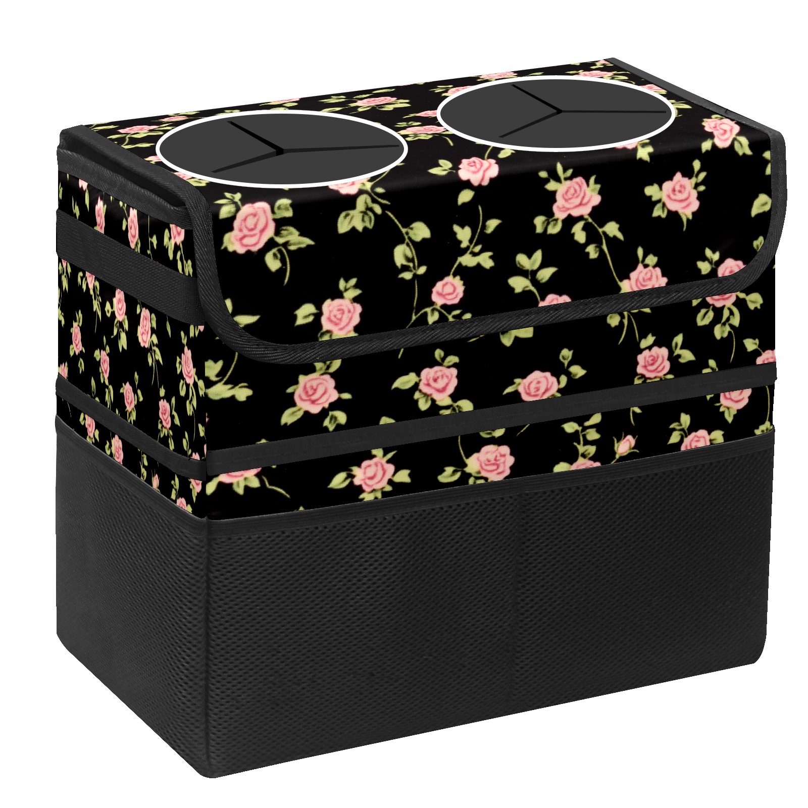 Car Trash Can with Lid, Portable Hanging Automotive Garbage Bin for Vehicles, Leakproof Waste Bag Container for SUV Truck Van Interior Auto Travel Road Trips(Black Pink Roses)