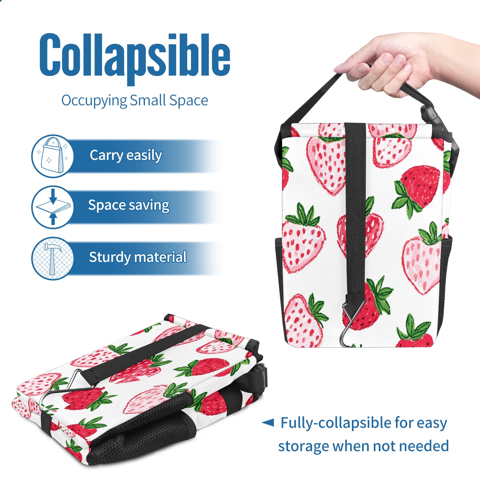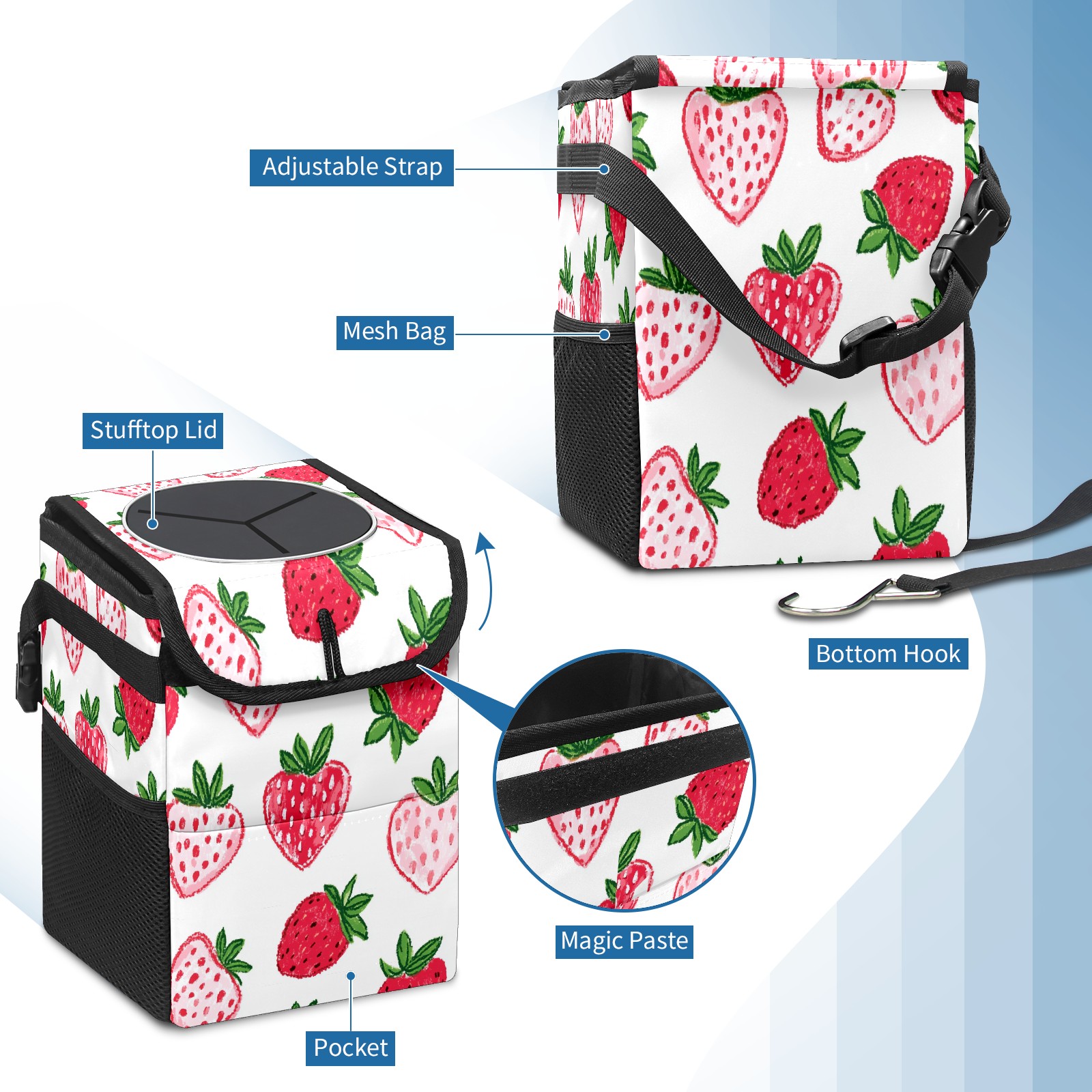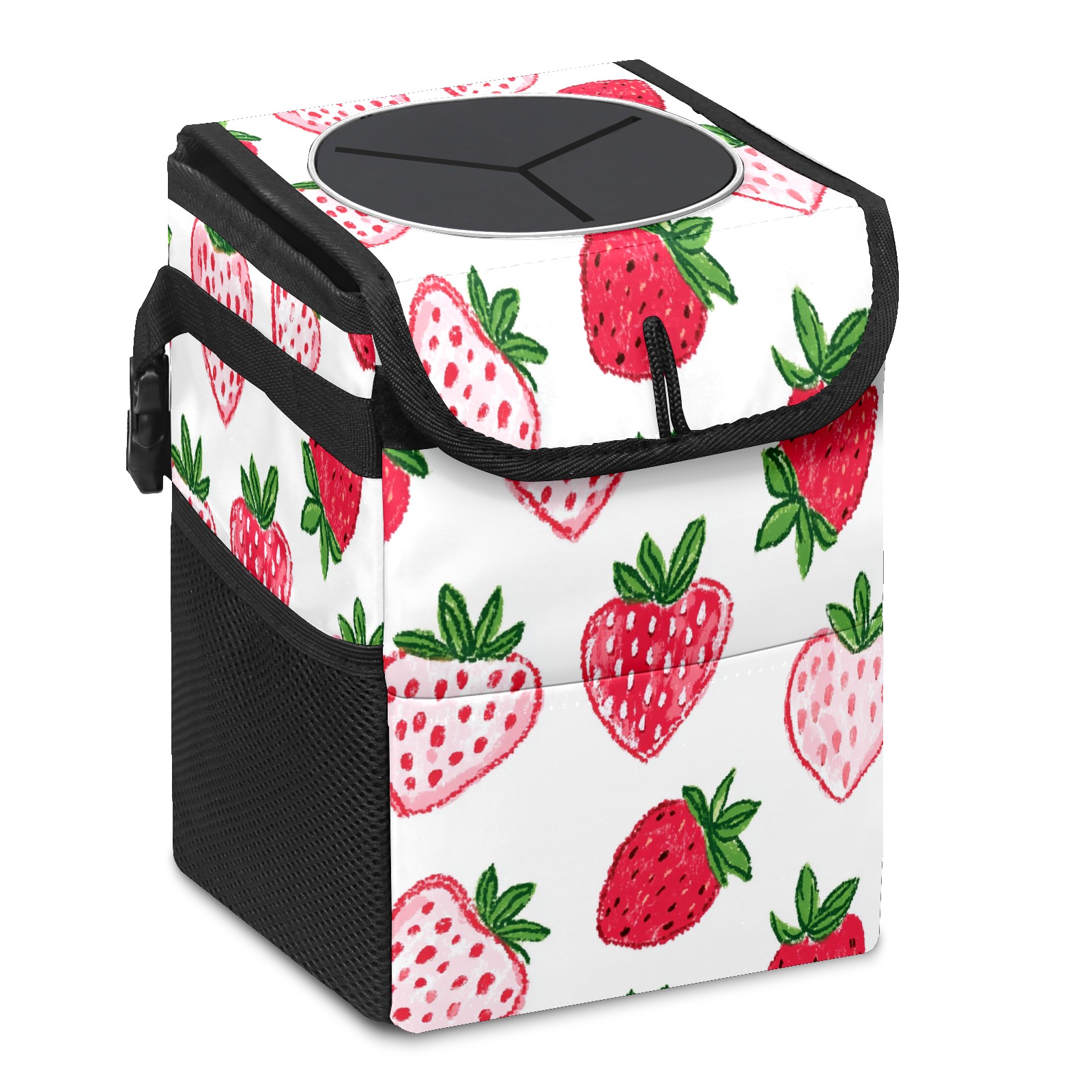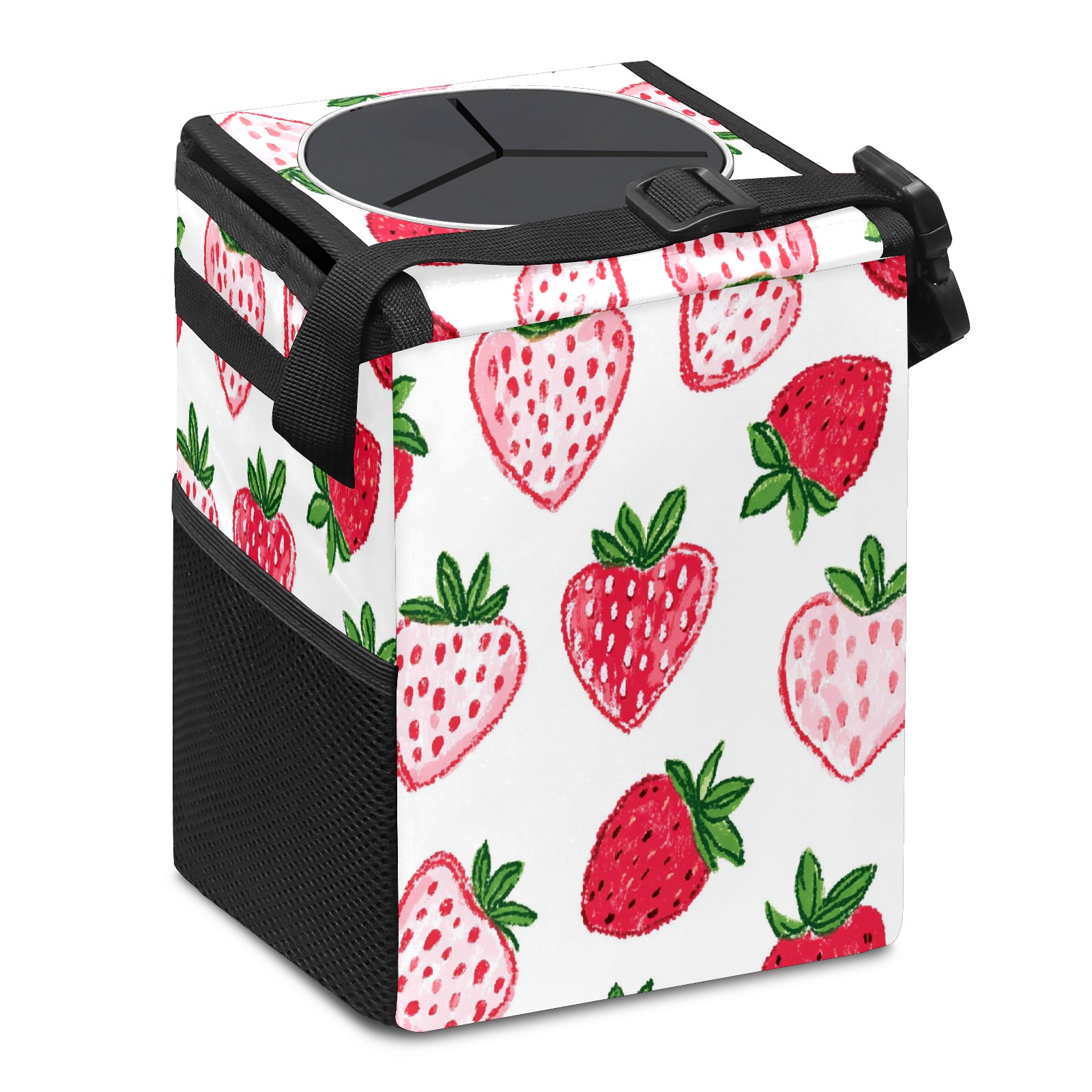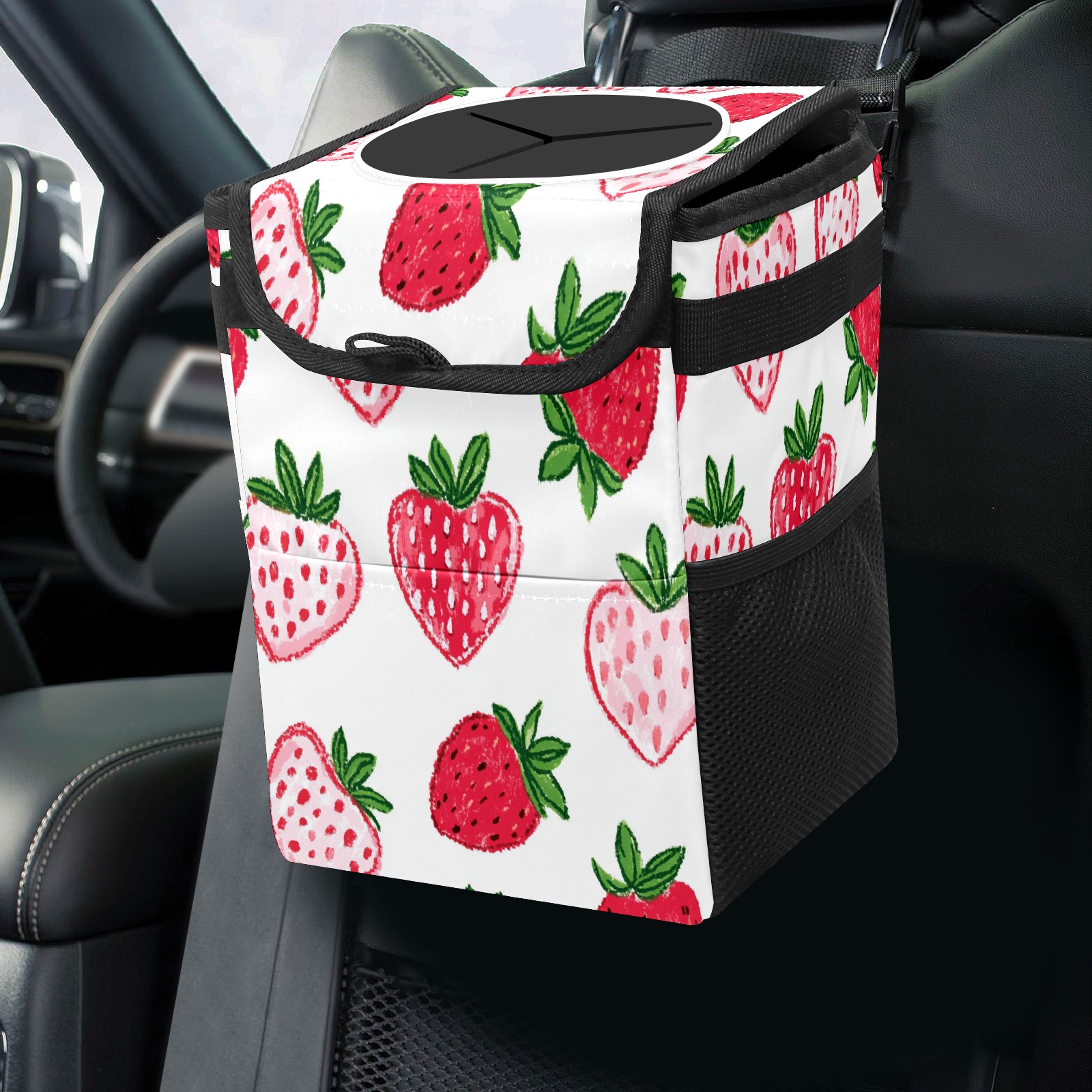 Car Trash Can with Lid, Small Portable Hanging Automotive Garbage Bin for Vehicles, Leakproof Waste Bag Container for SUV Truck Van Interior Auto Travel Road Trips(Strawberry Hearts)
