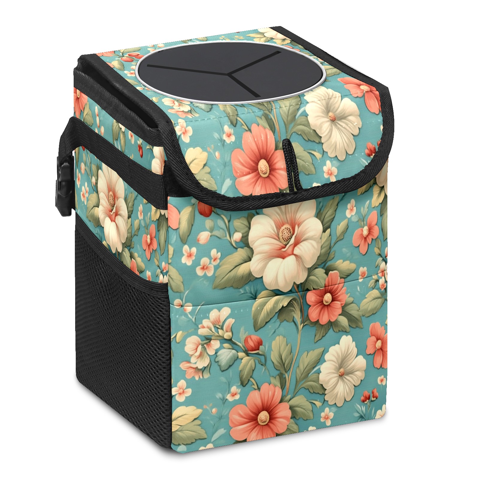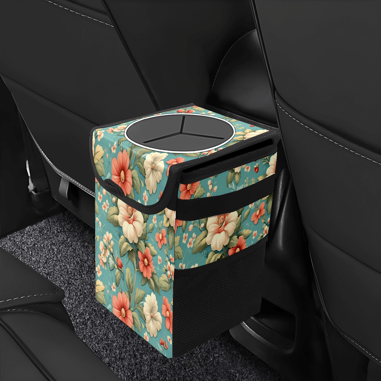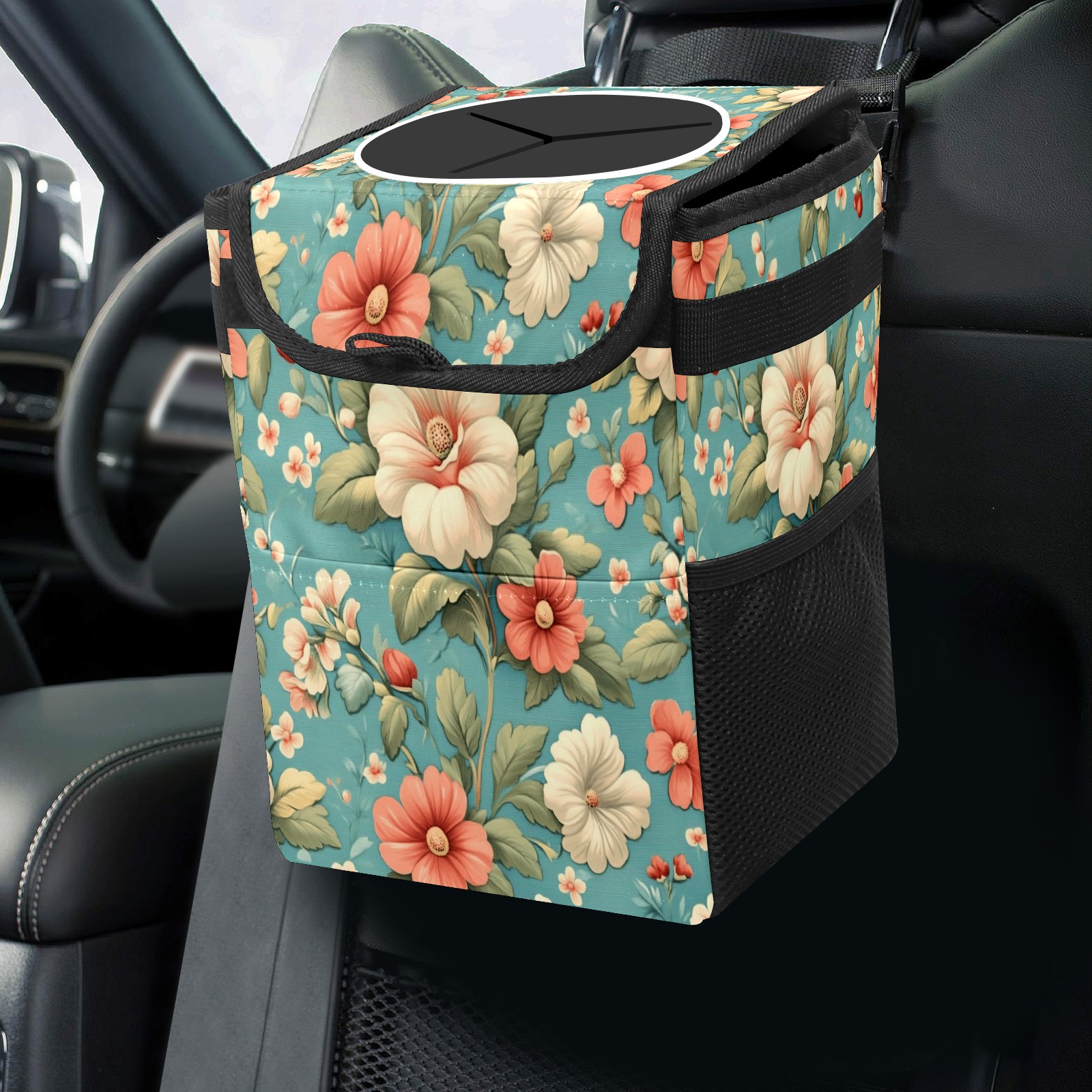 Car Trash Can with Lid, Small Portable Hanging Automotive Garbage Bin for Vehicles, Leakproof Waste Bag Container for SUV Truck Van Interior Auto Travel Road Trips(Vintage Floral)