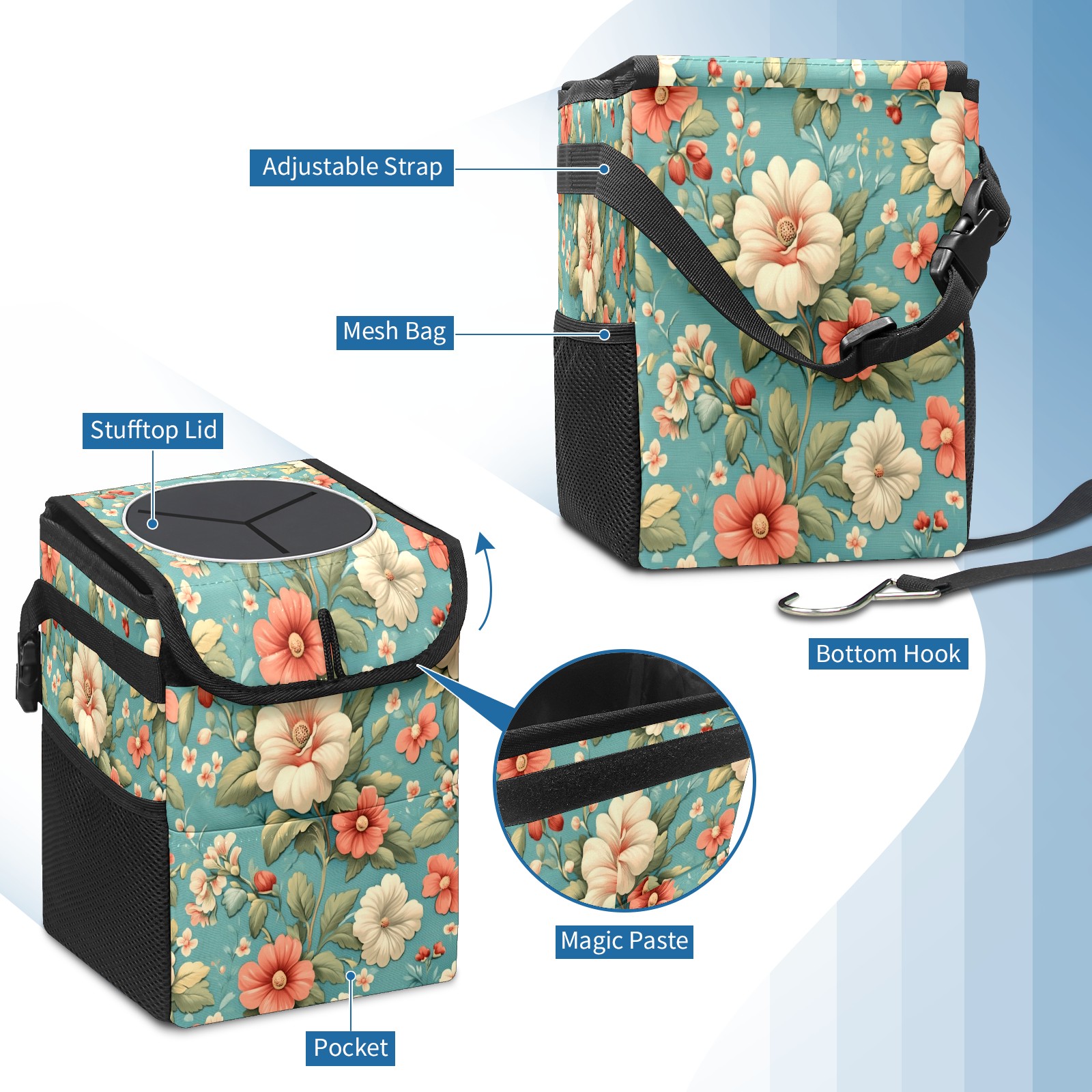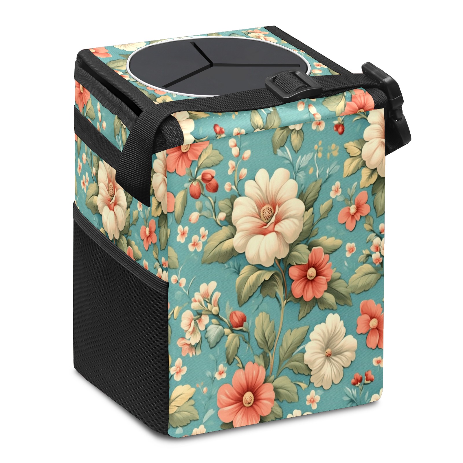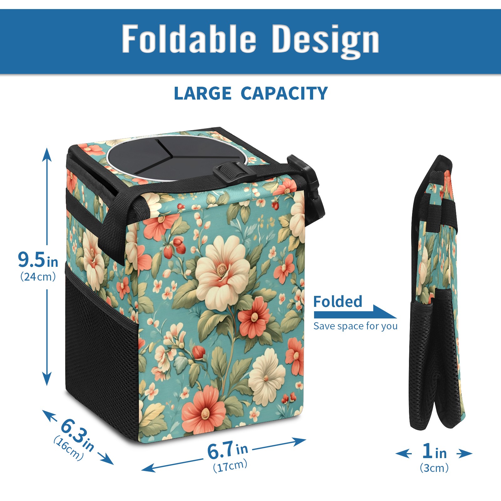 Car Trash Can with Lid, Small Portable Hanging Automotive Garbage Bin for Vehicles, Leakproof Waste Bag Container for SUV Truck Van Interior Auto Travel Road Trips(Vintage Floral)