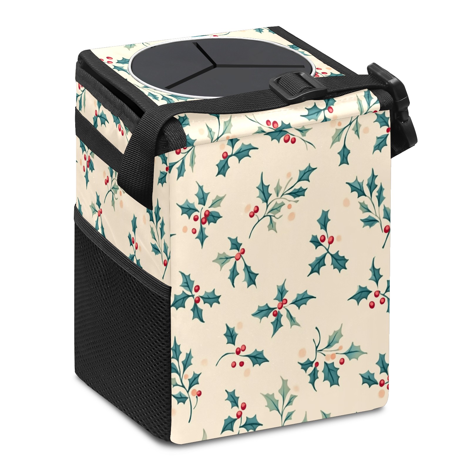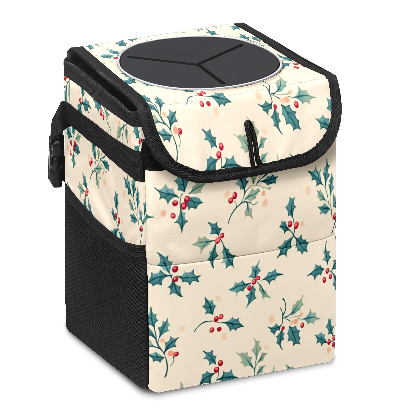 Car Trash Can with Lid, Small Portable Hanging Automotive Garbage Bin for Vehicles, Leakproof Waste Bag Container for SUV Truck Van Interior Auto Travel Road Trips(Small Holly Leaves)