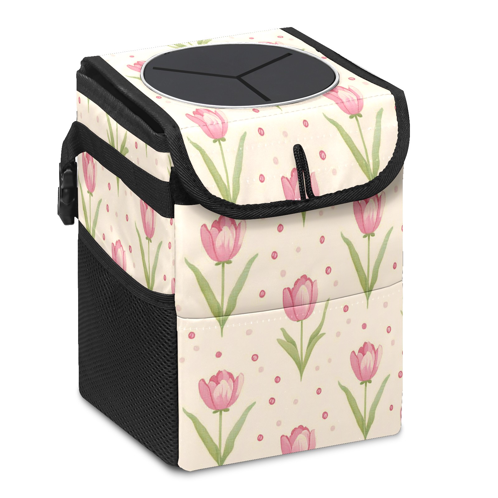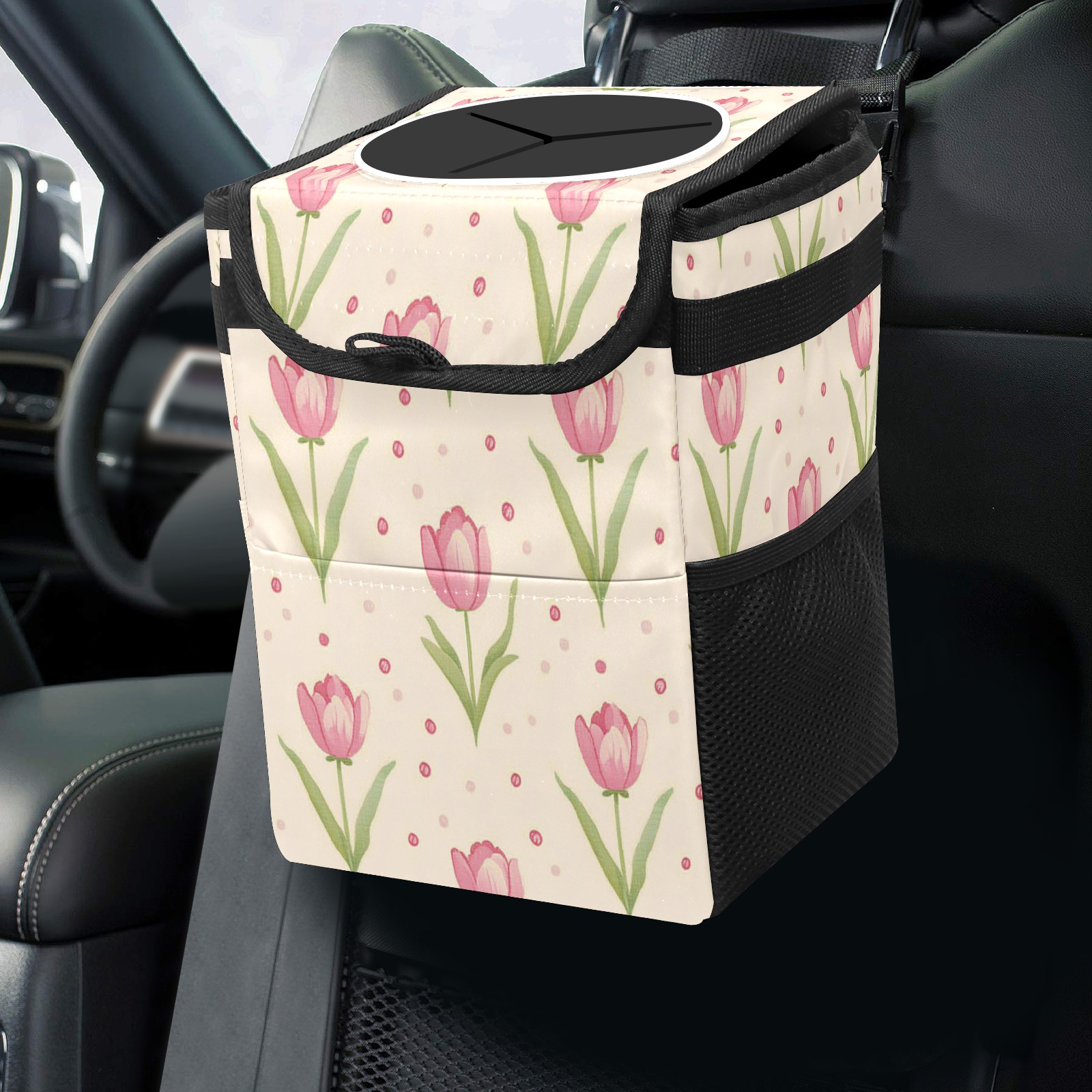Car Trash Can with Lid, Small Portable Hanging Automotive Garbage Bin for Vehicles, Leakproof Waste Bag Container for SUV Truck Van Interior Auto Travel Road Trips(Pink Tulip)