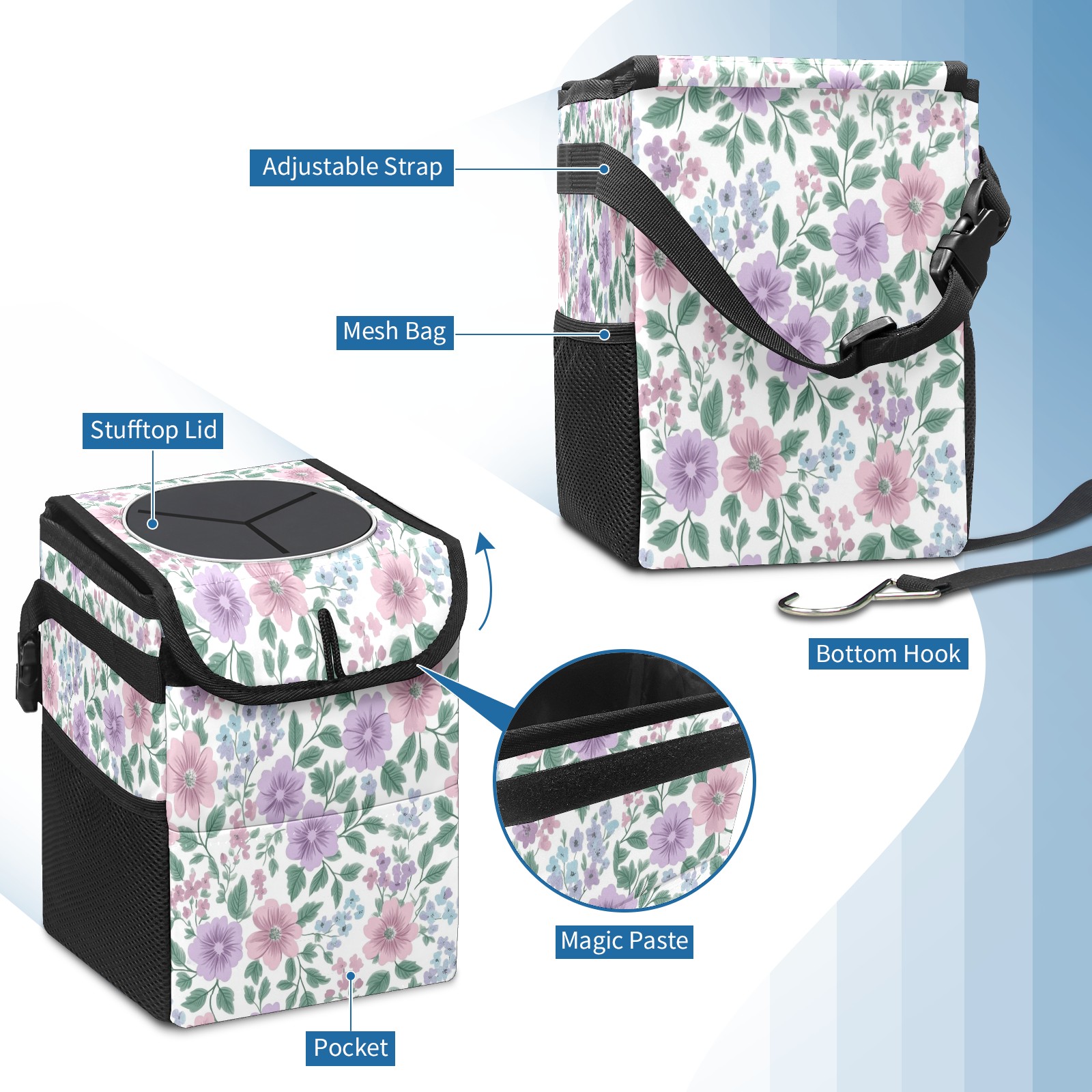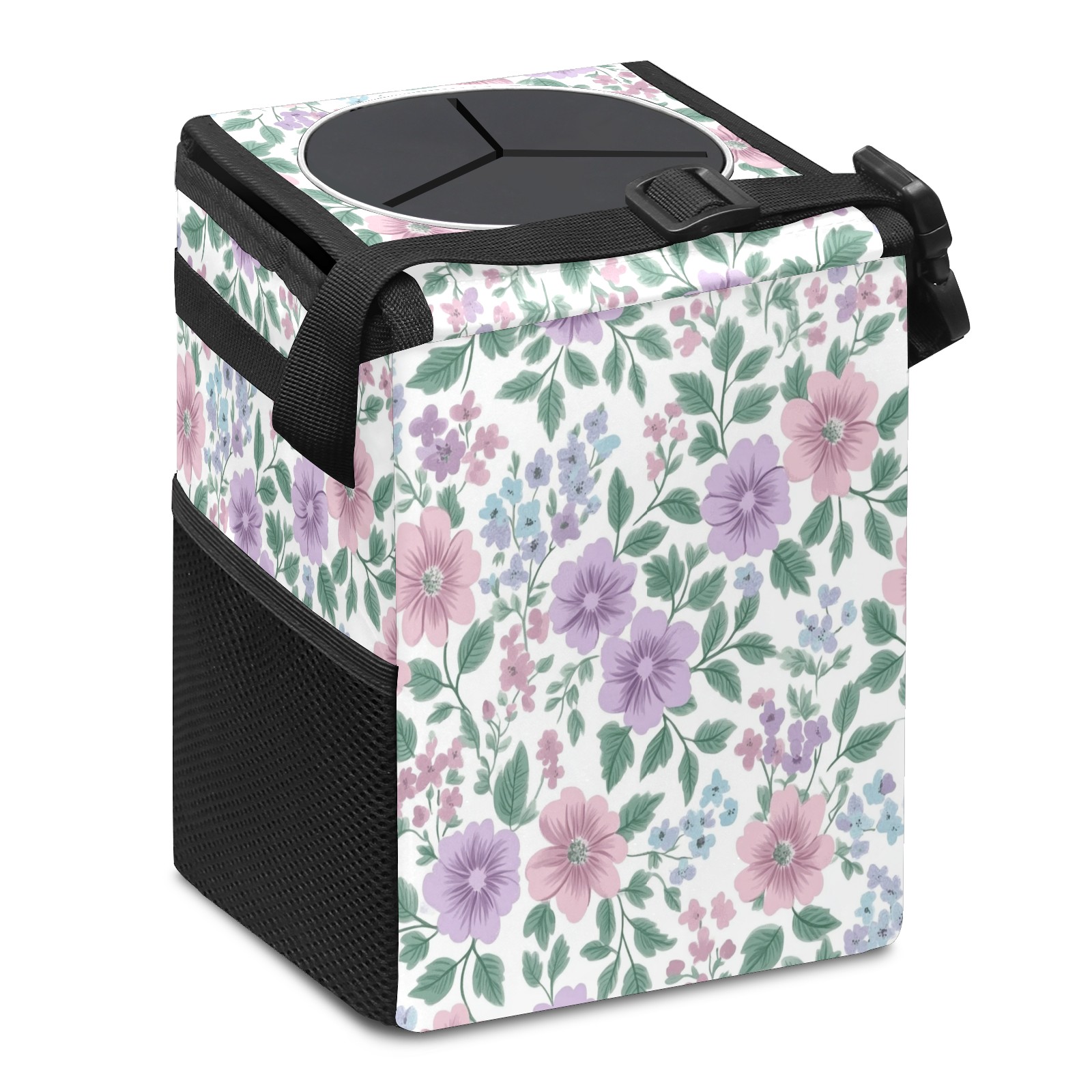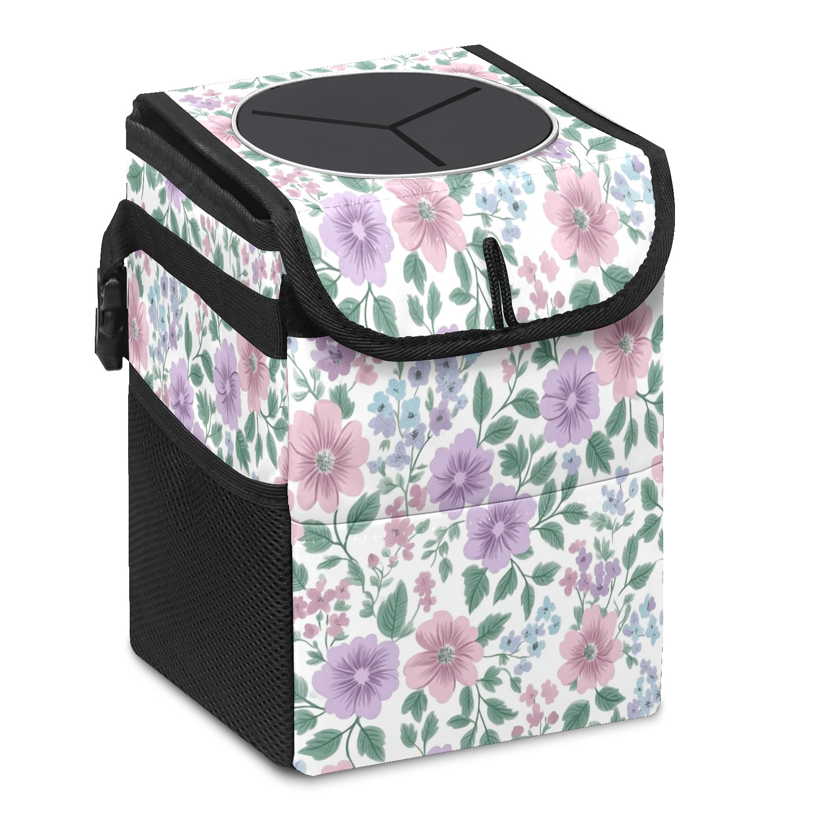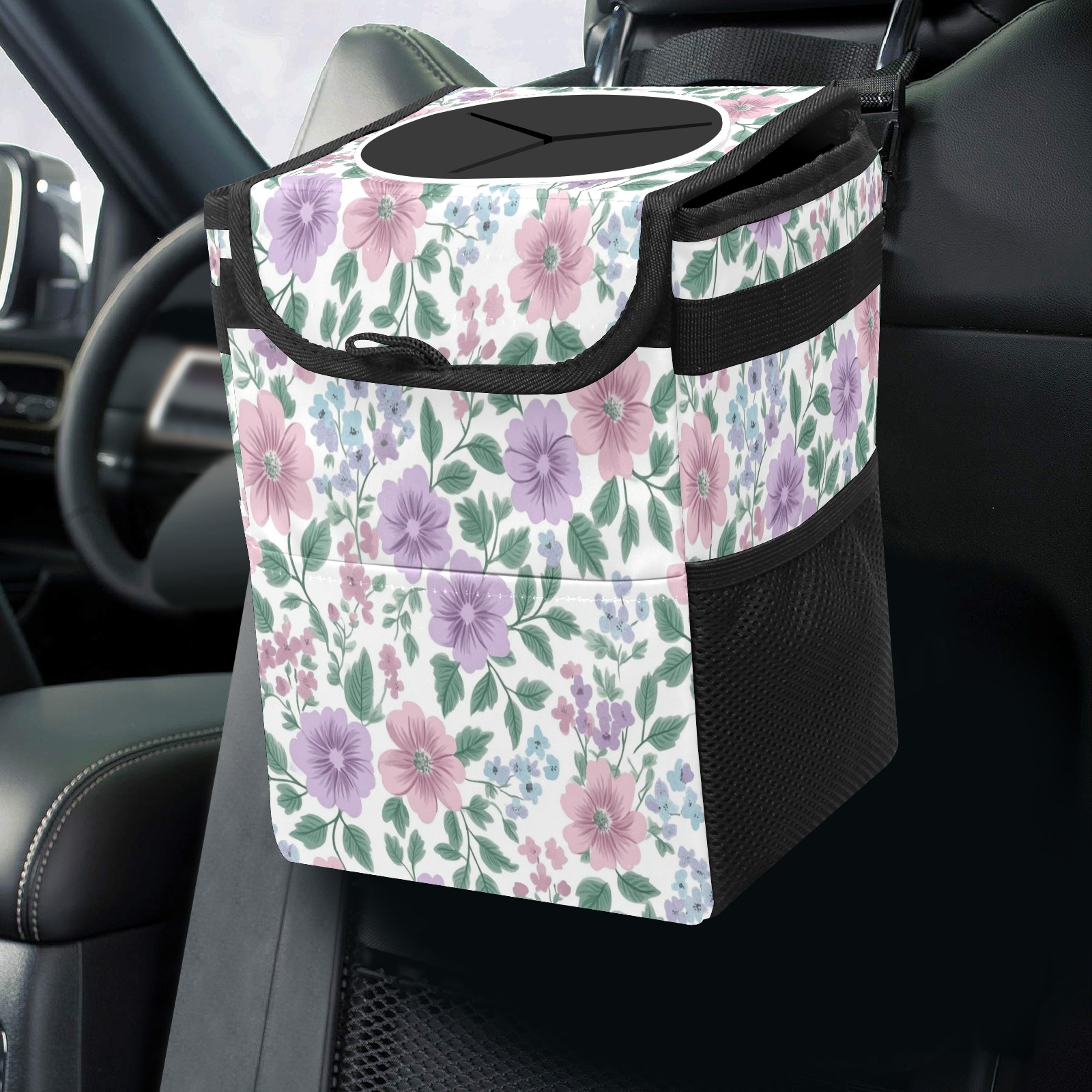Car Trash Can with Lid, Small Portable Hanging Automotive Garbage Bin for Vehicles, Leakproof Waste Bag Container for SUV Truck Van Interior Auto Travel Road Trips(Pink Lavender Floral)