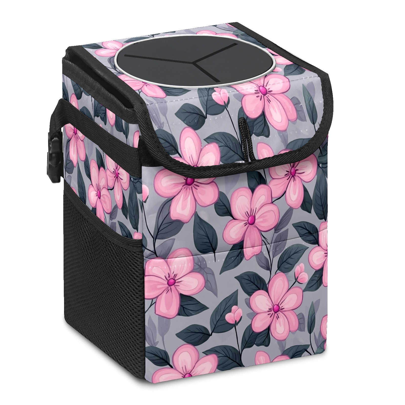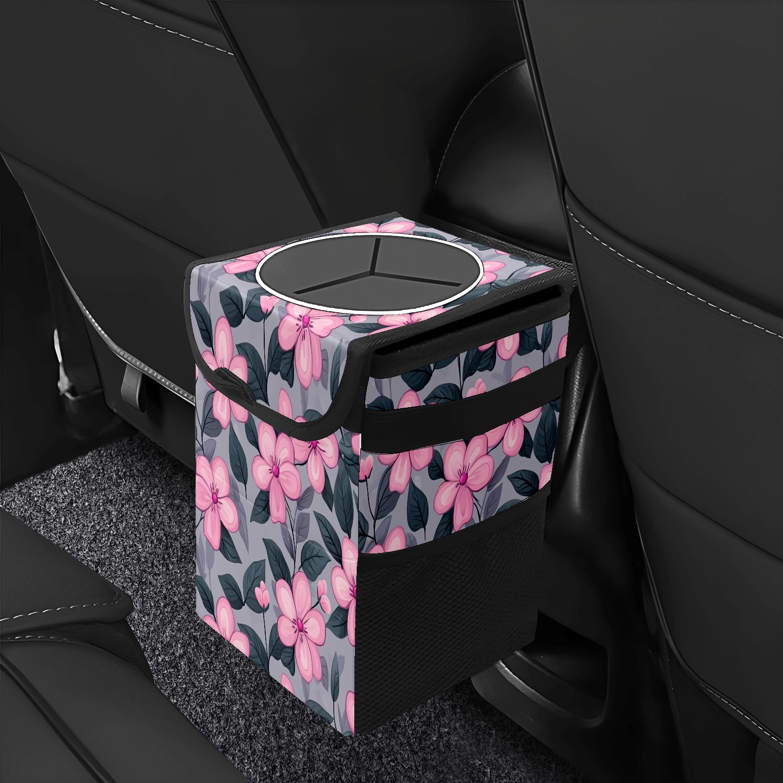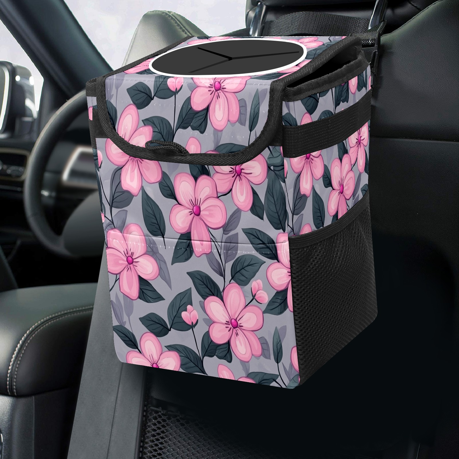 Car Trash Can with Lid, Small Portable Hanging Automotive Garbage Bin for Vehicles, Leakproof Waste Bag Container for SUV Truck Van Interior Auto Travel Road Trips(Pink Flowers)