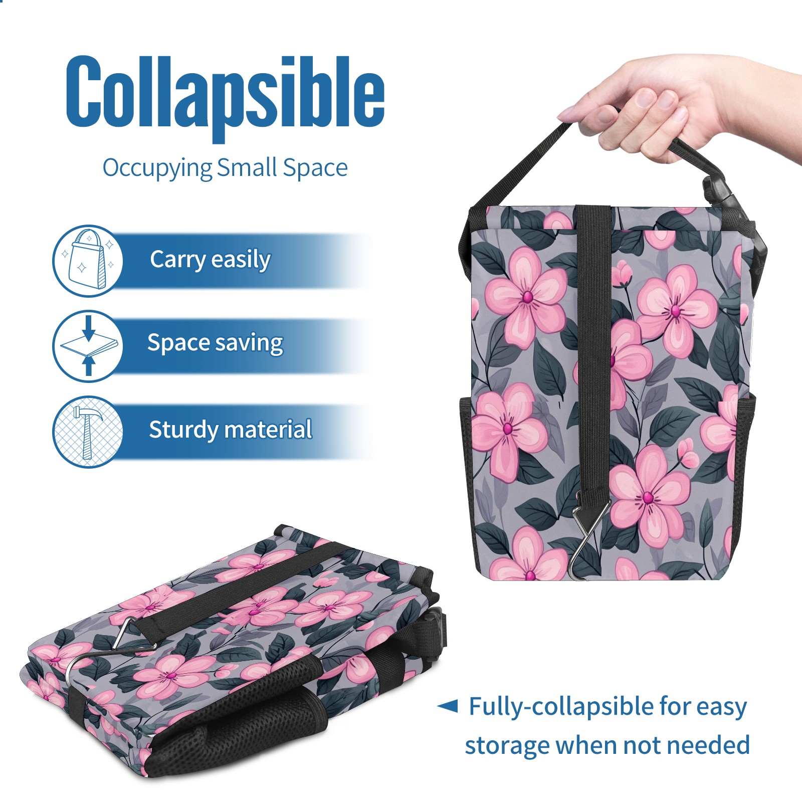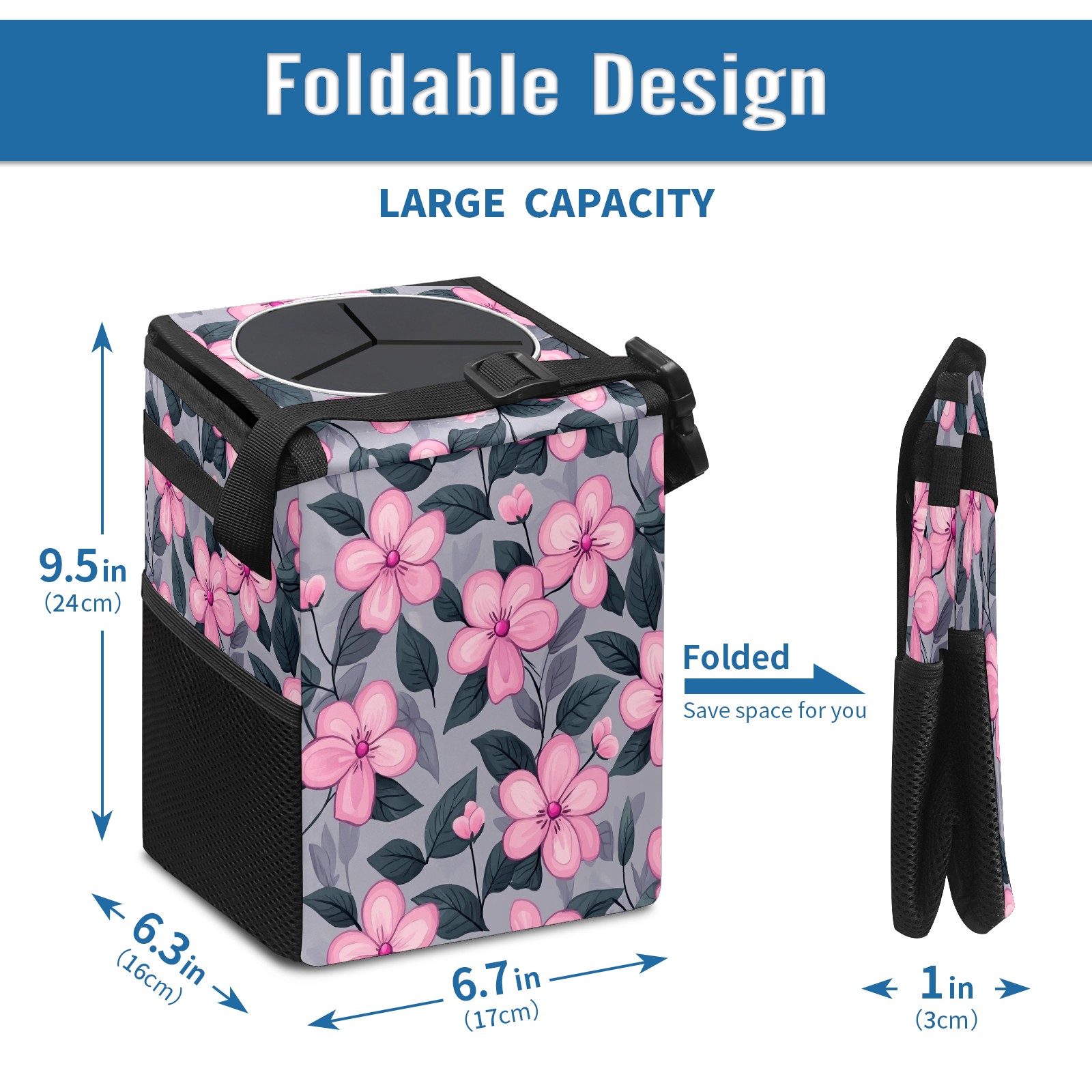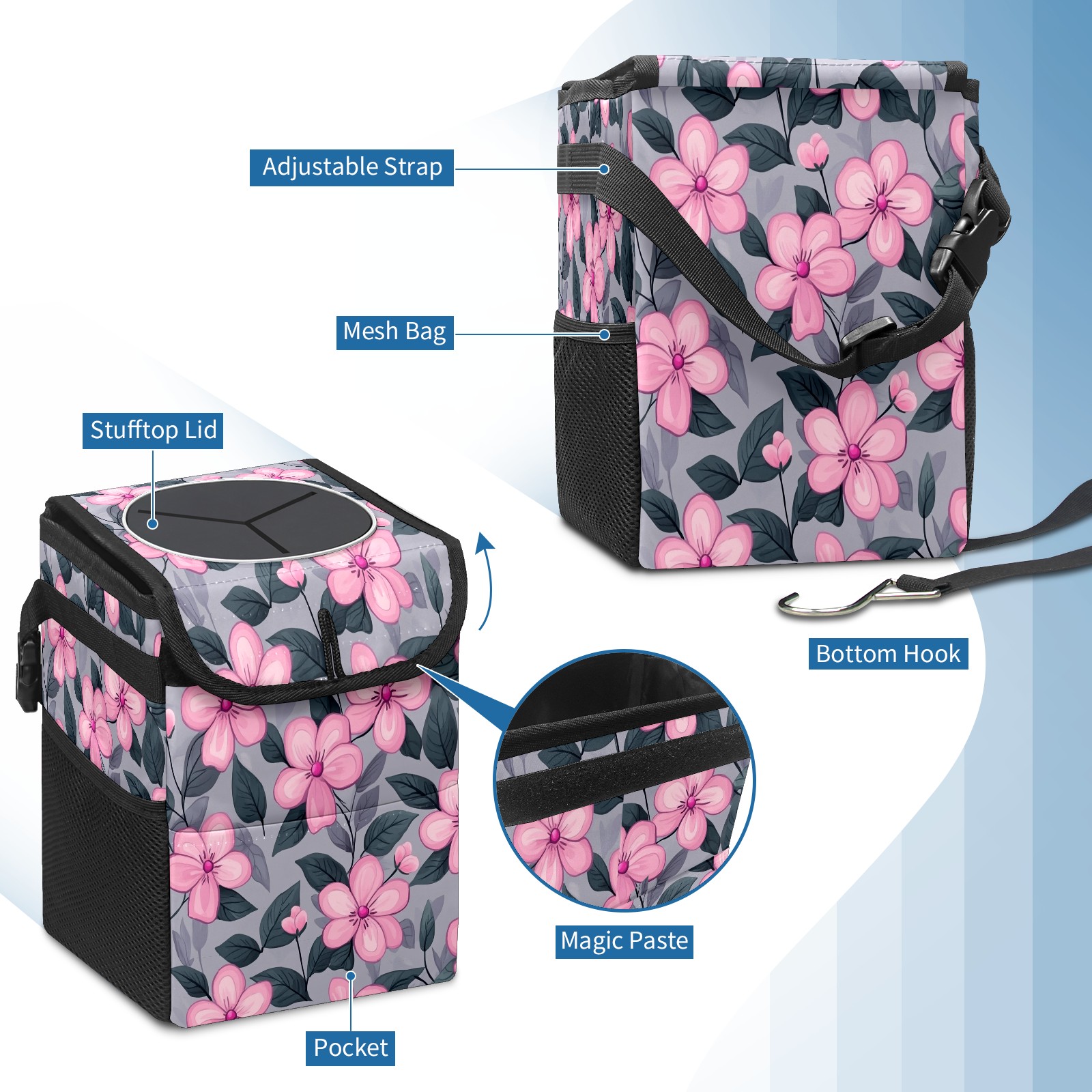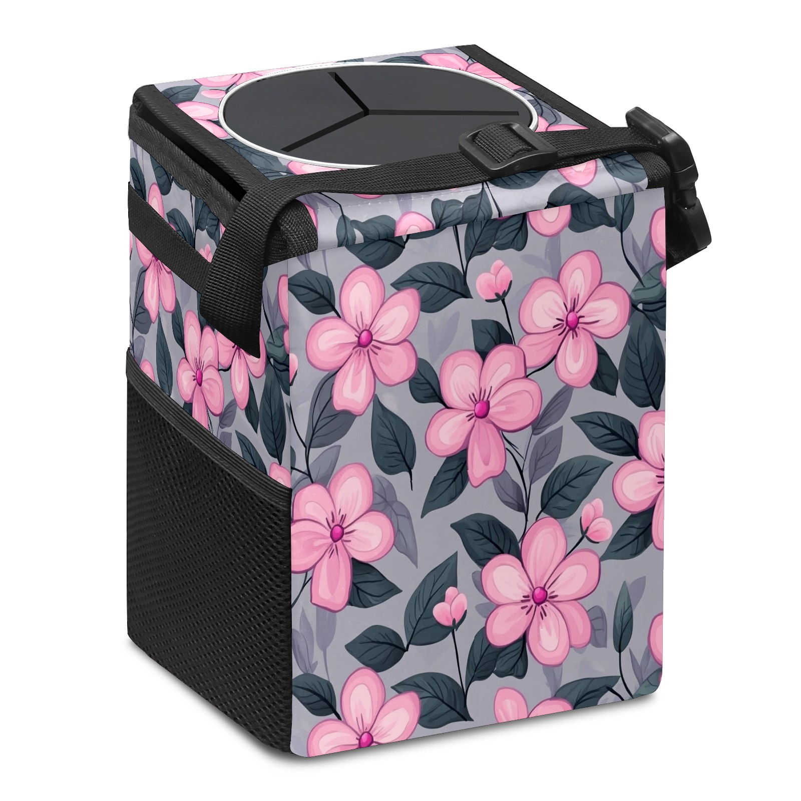 Car Trash Can with Lid, Small Portable Hanging Automotive Garbage Bin for Vehicles, Leakproof Waste Bag Container for SUV Truck Van Interior Auto Travel Road Trips(Pink Flowers)