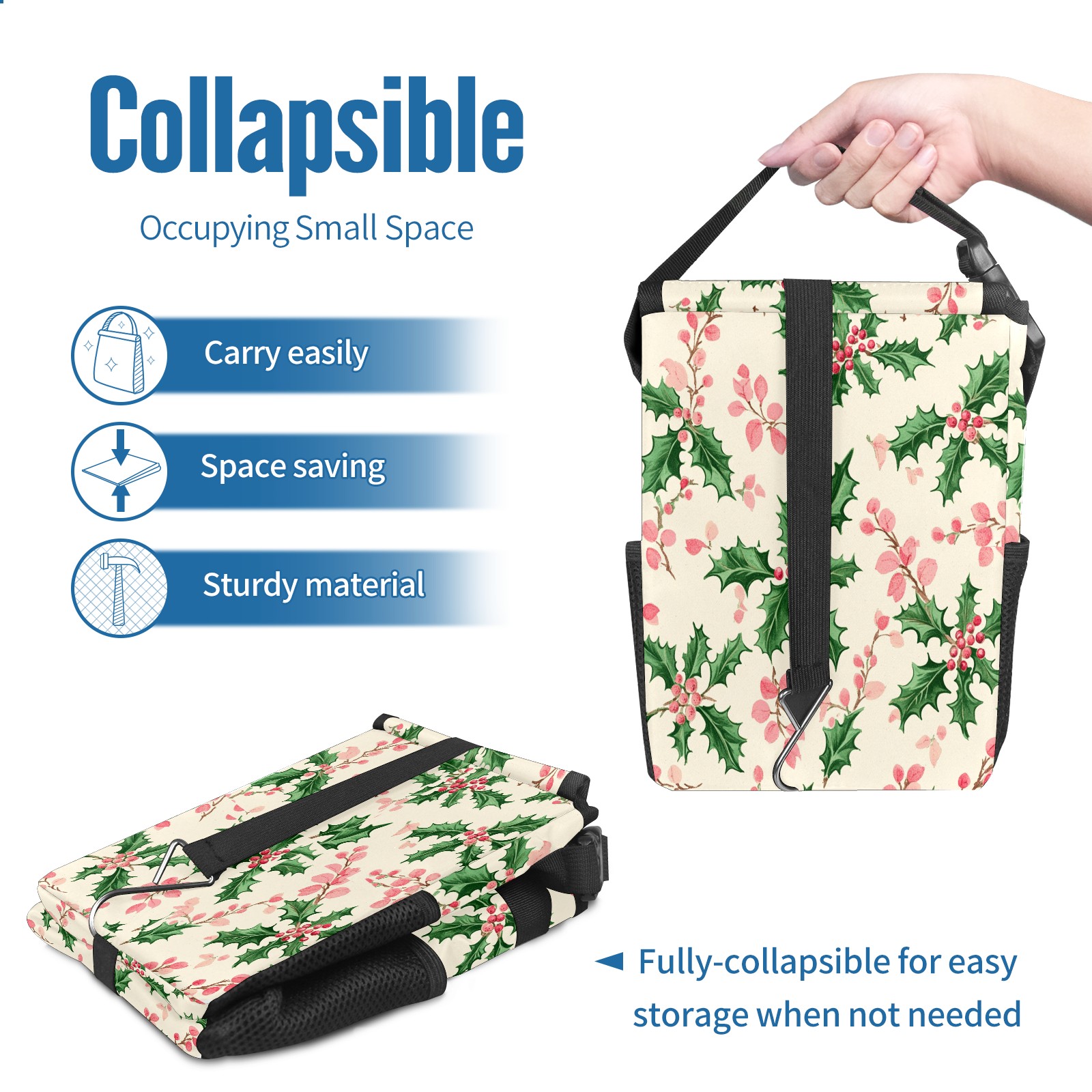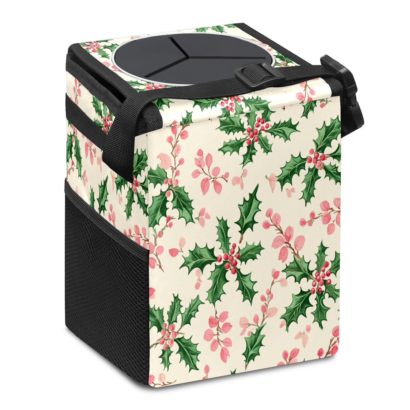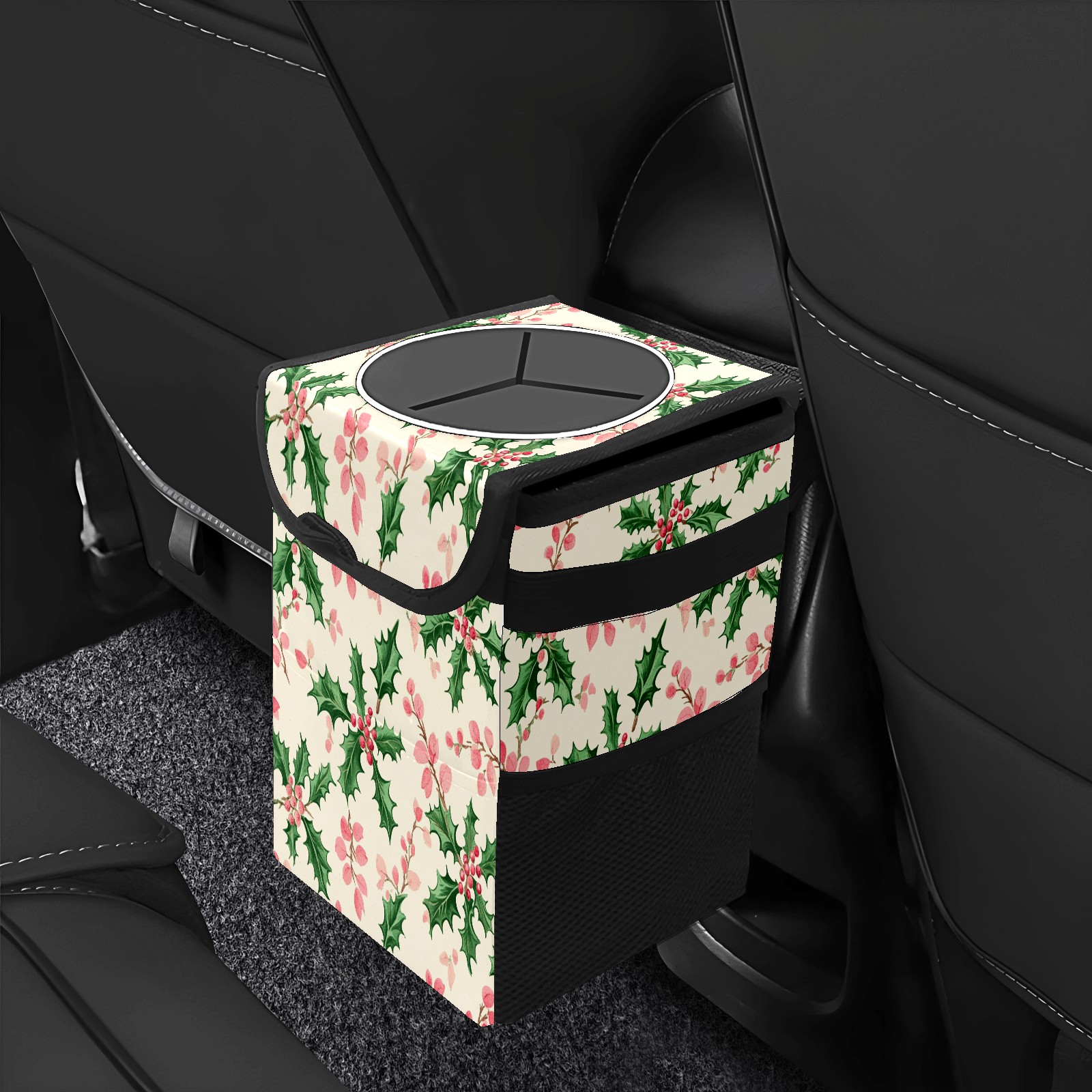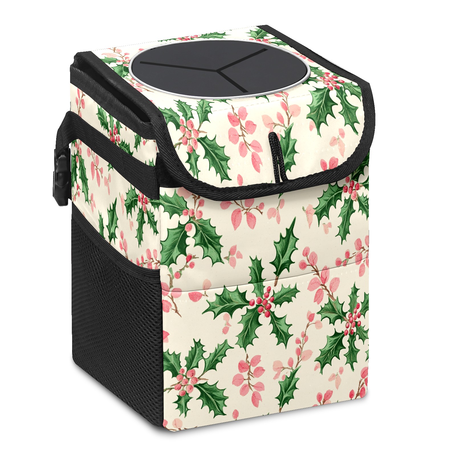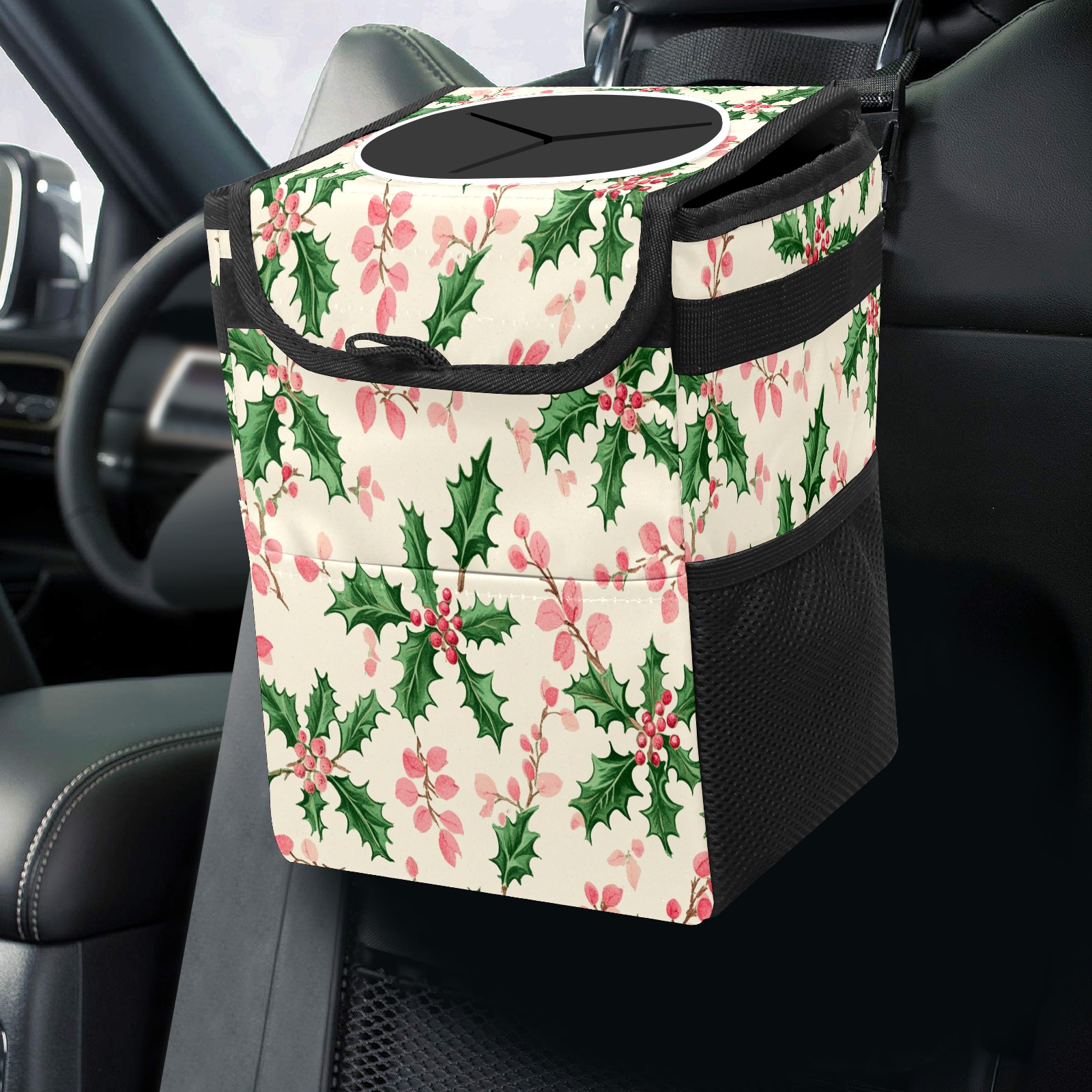 Car Trash Can with Lid, Small Portable Hanging Automotive Garbage Bin for Vehicles, Leakproof Waste Bag Container for SUV Truck Van Interior Auto Travel Road Trips(Holly Leaves)
