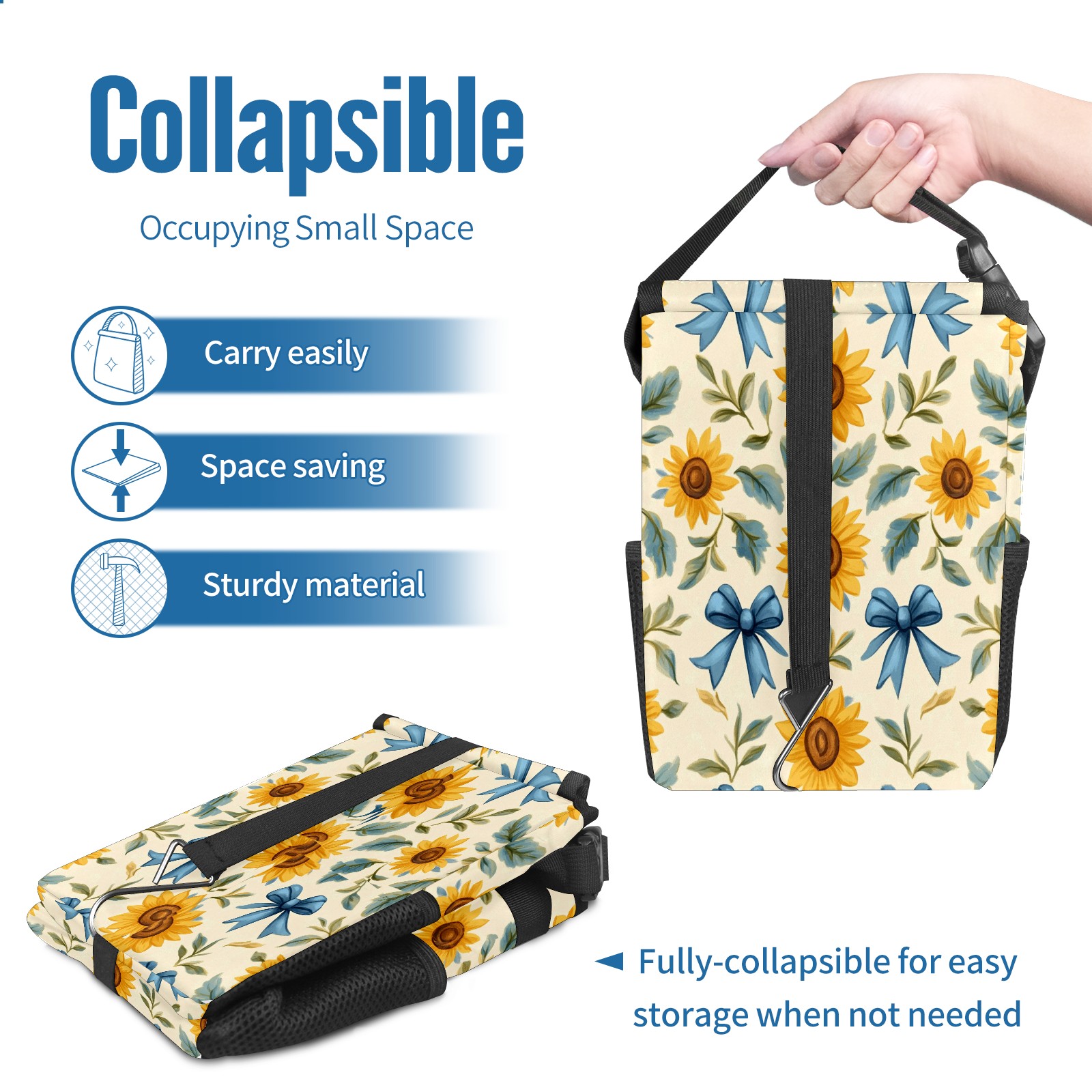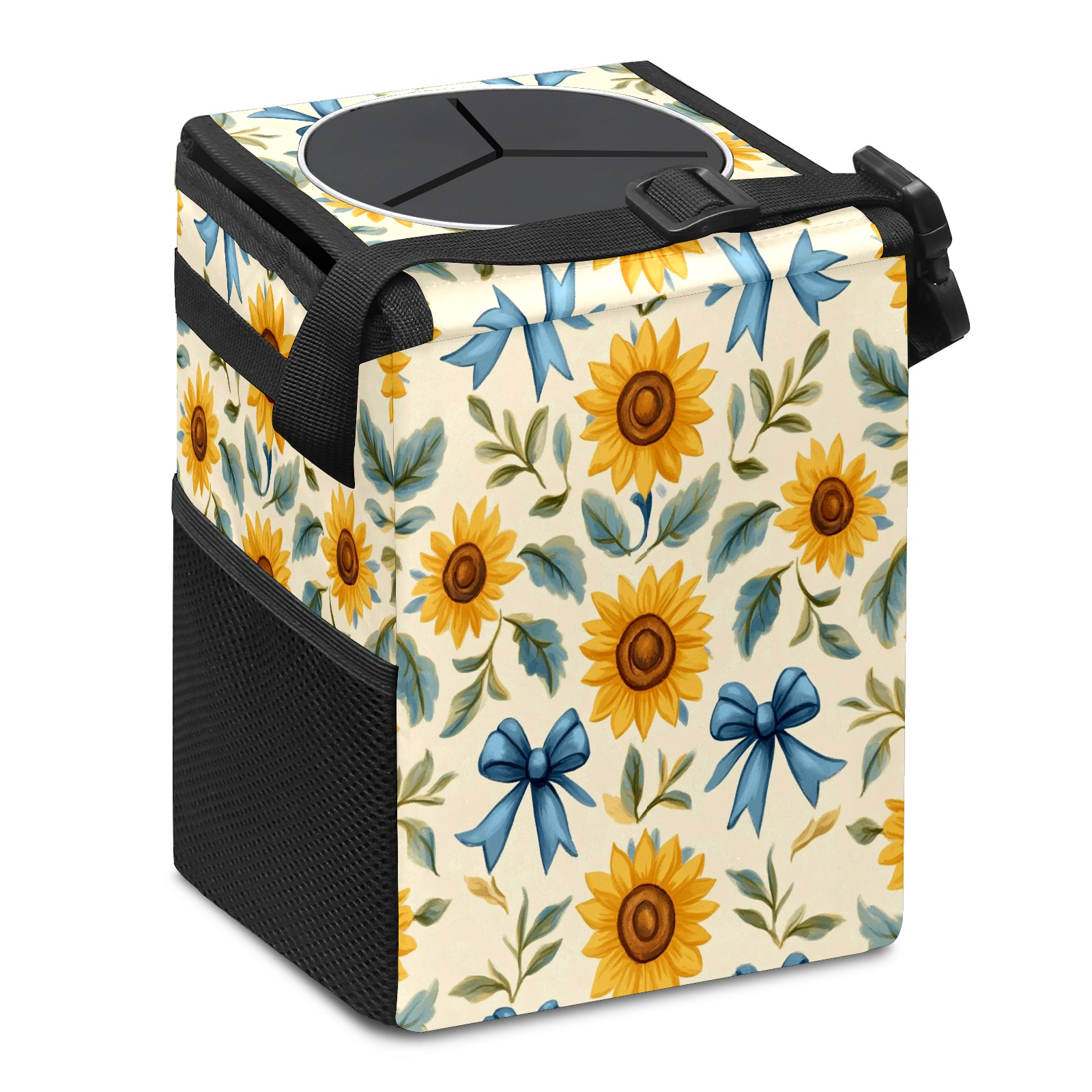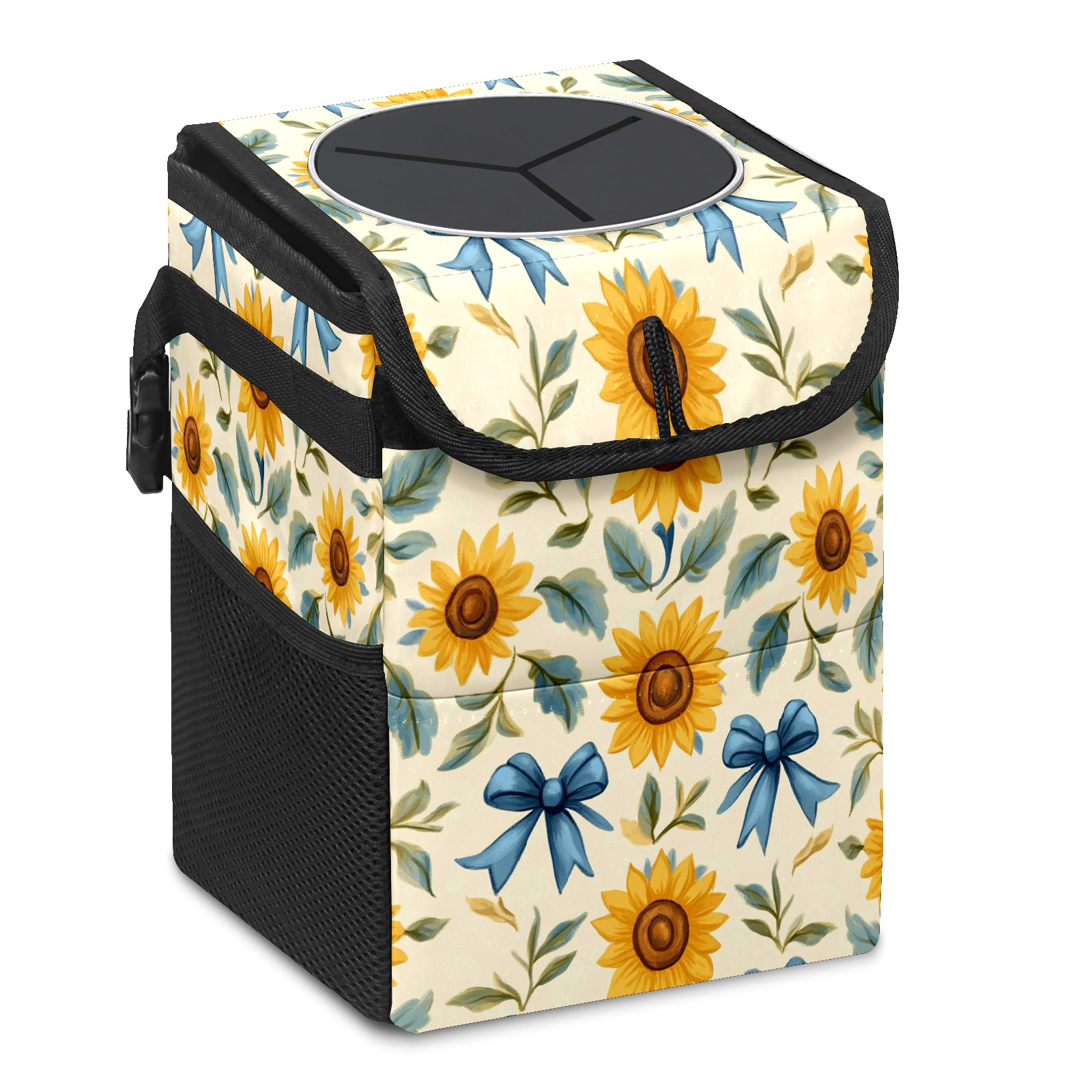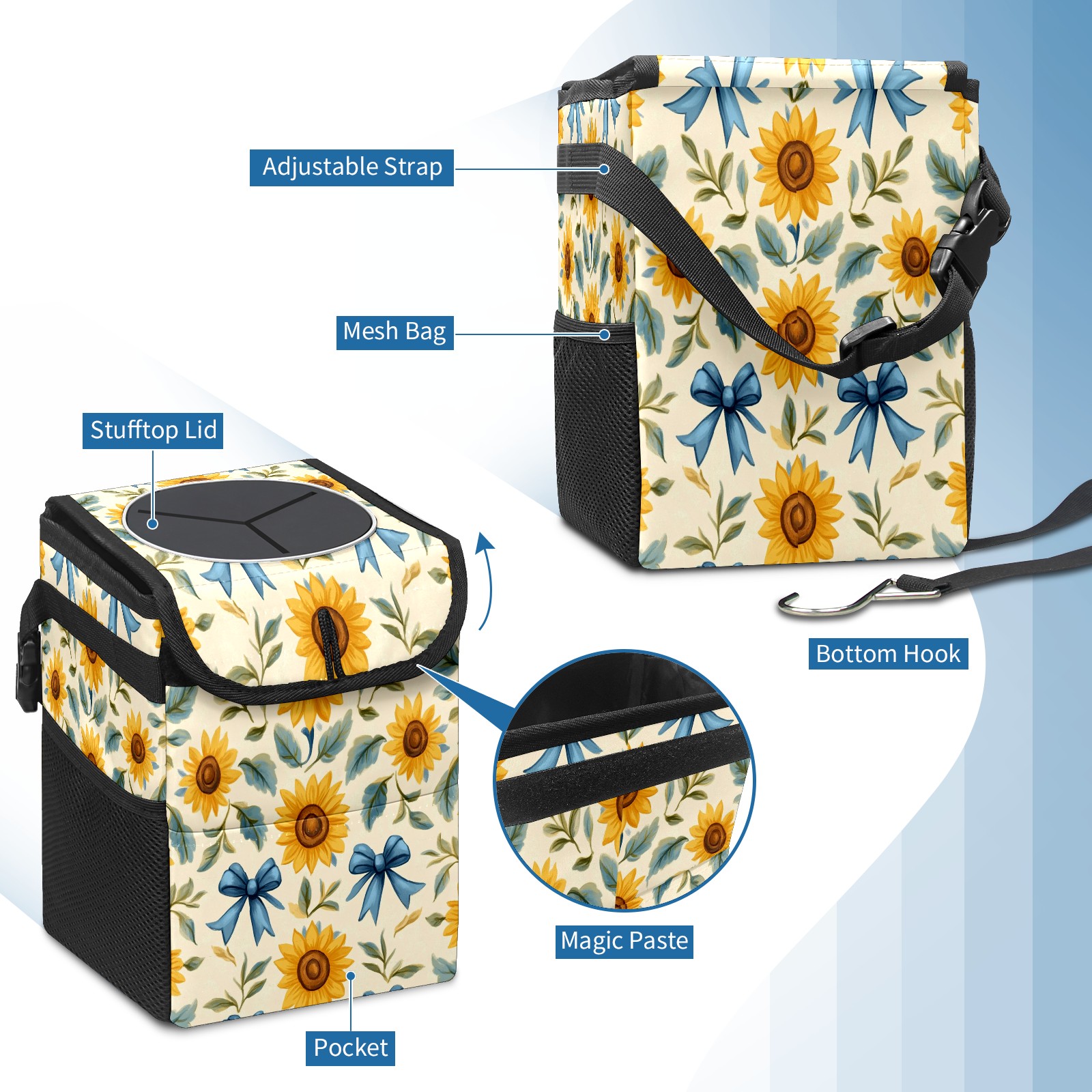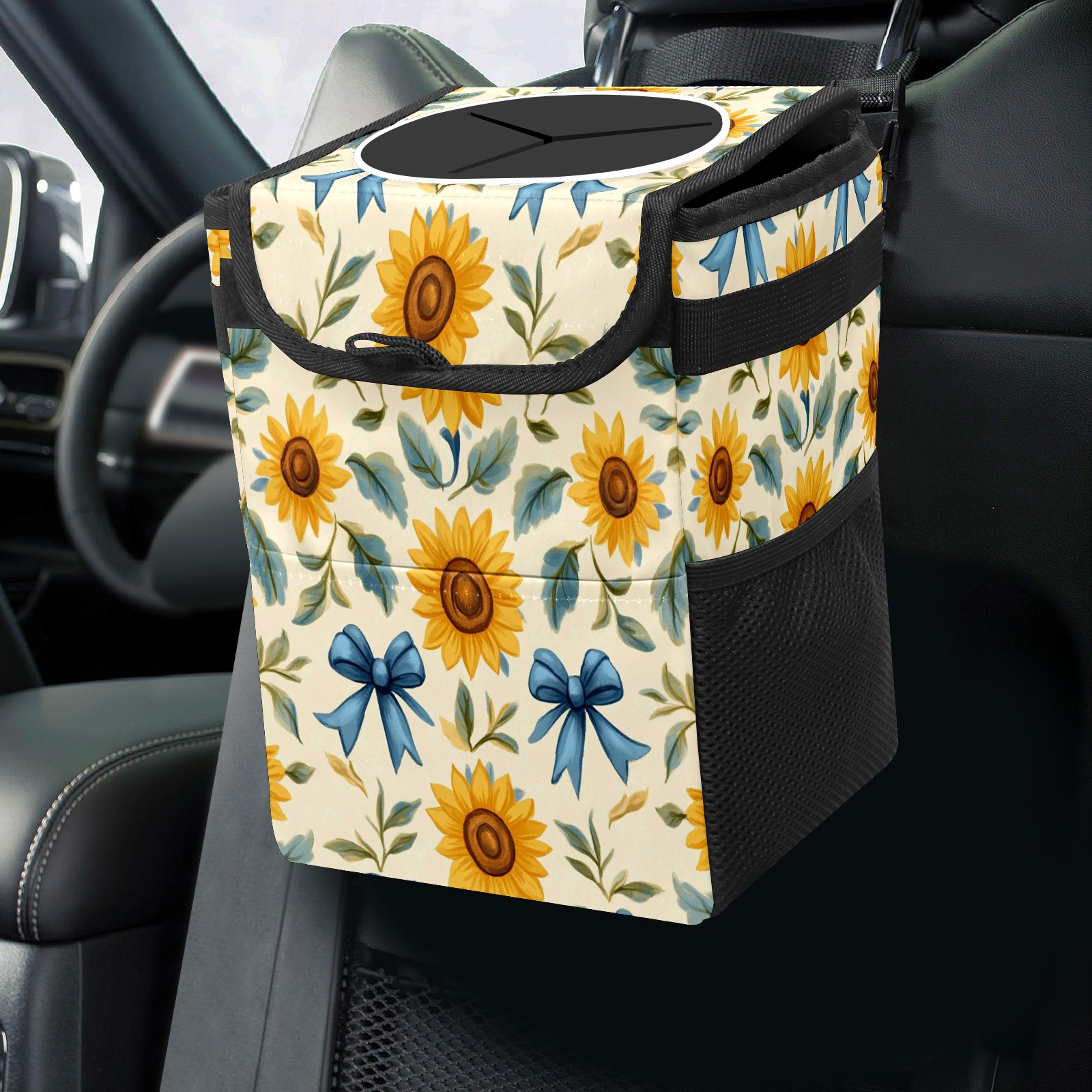 Car Trash Can with Lid, Small Portable Hanging Automotive Garbage Bin for Vehicles, Leakproof Waste Bag Container for SUV Truck Van Interior Auto Travel Road Trips(Blue Bows And Sunflowers)