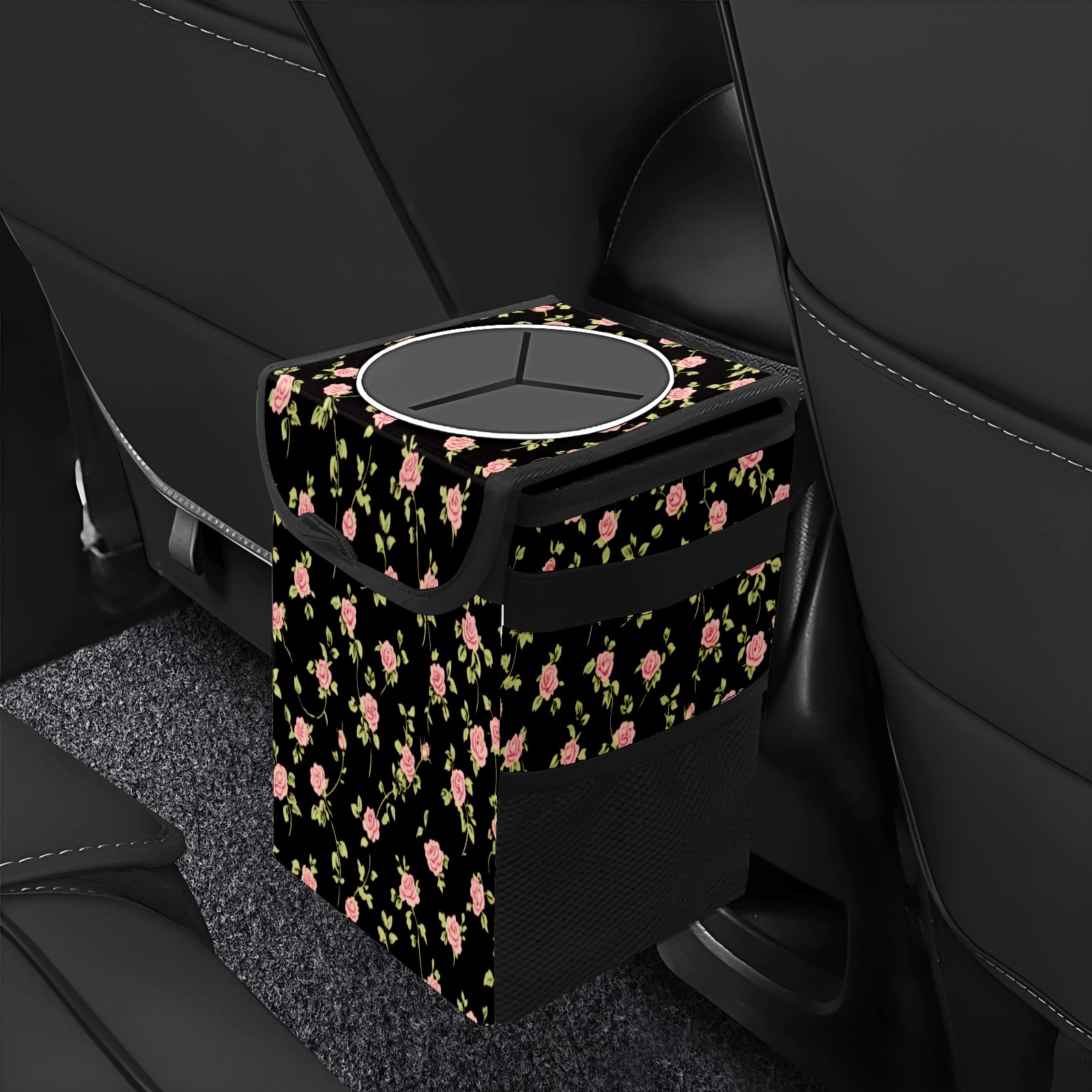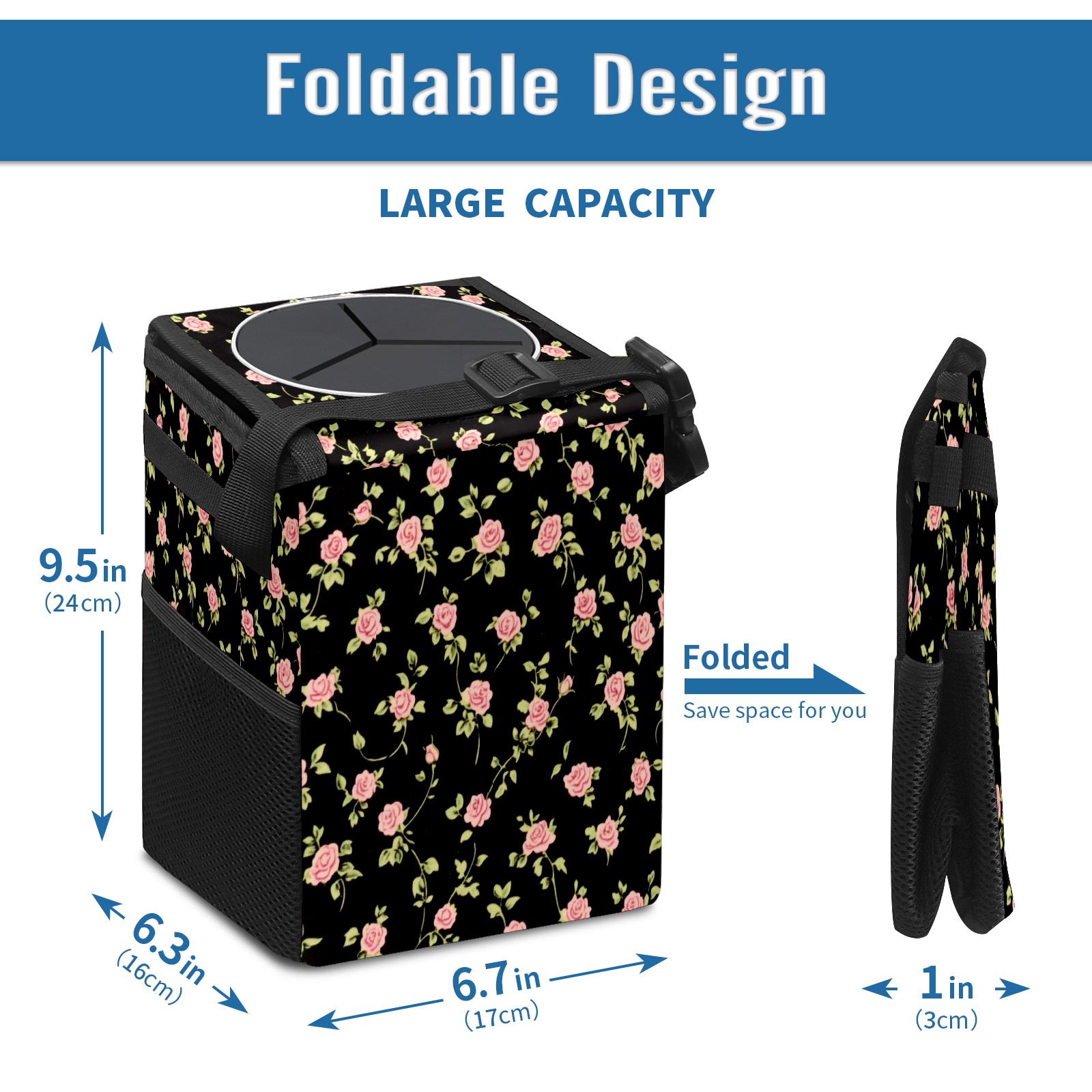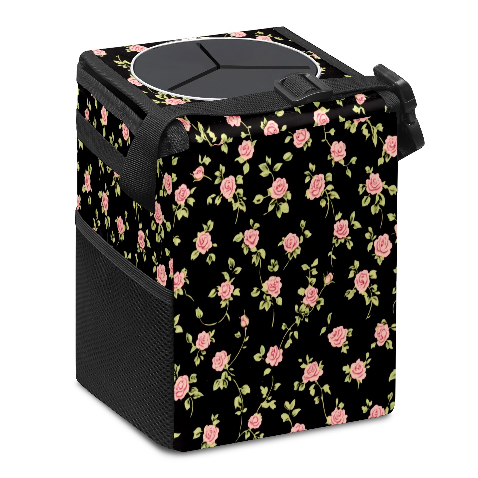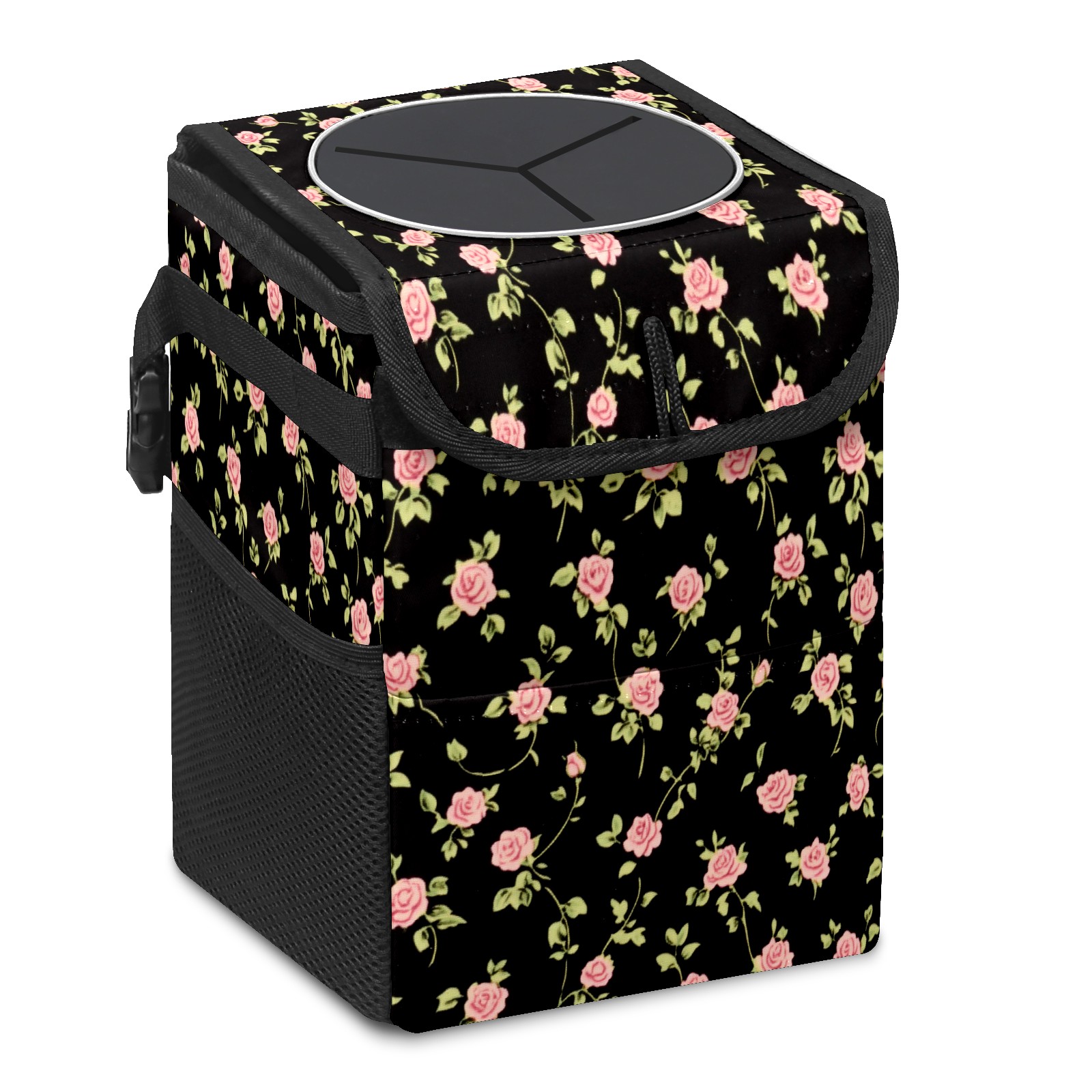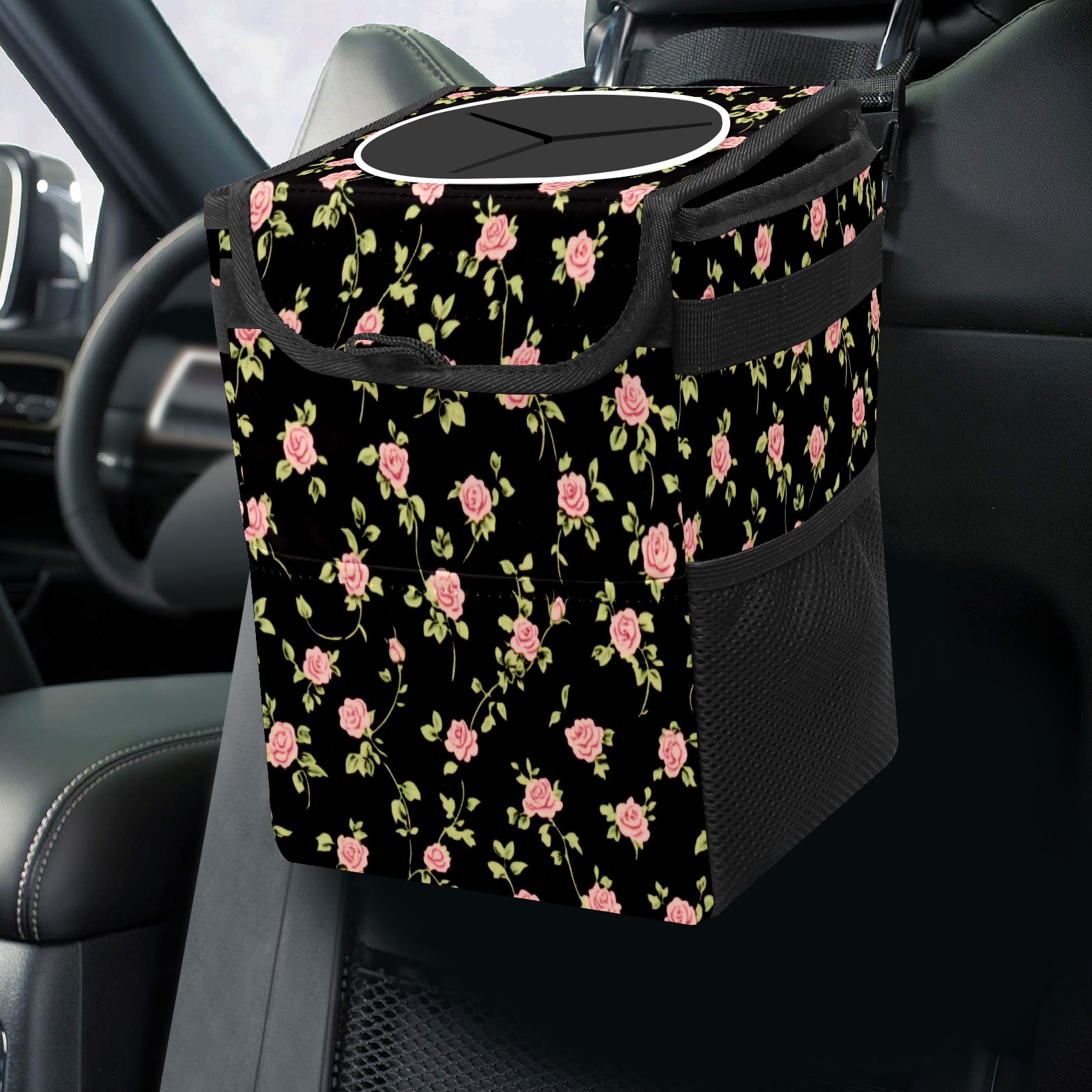 Car Trash Can with Lid, Small Portable Hanging Automotive Garbage Bin for Vehicles, Leakproof Waste Bag Container for SUV Truck Van Interior Auto Travel Road Trips(Black Pink Roses)