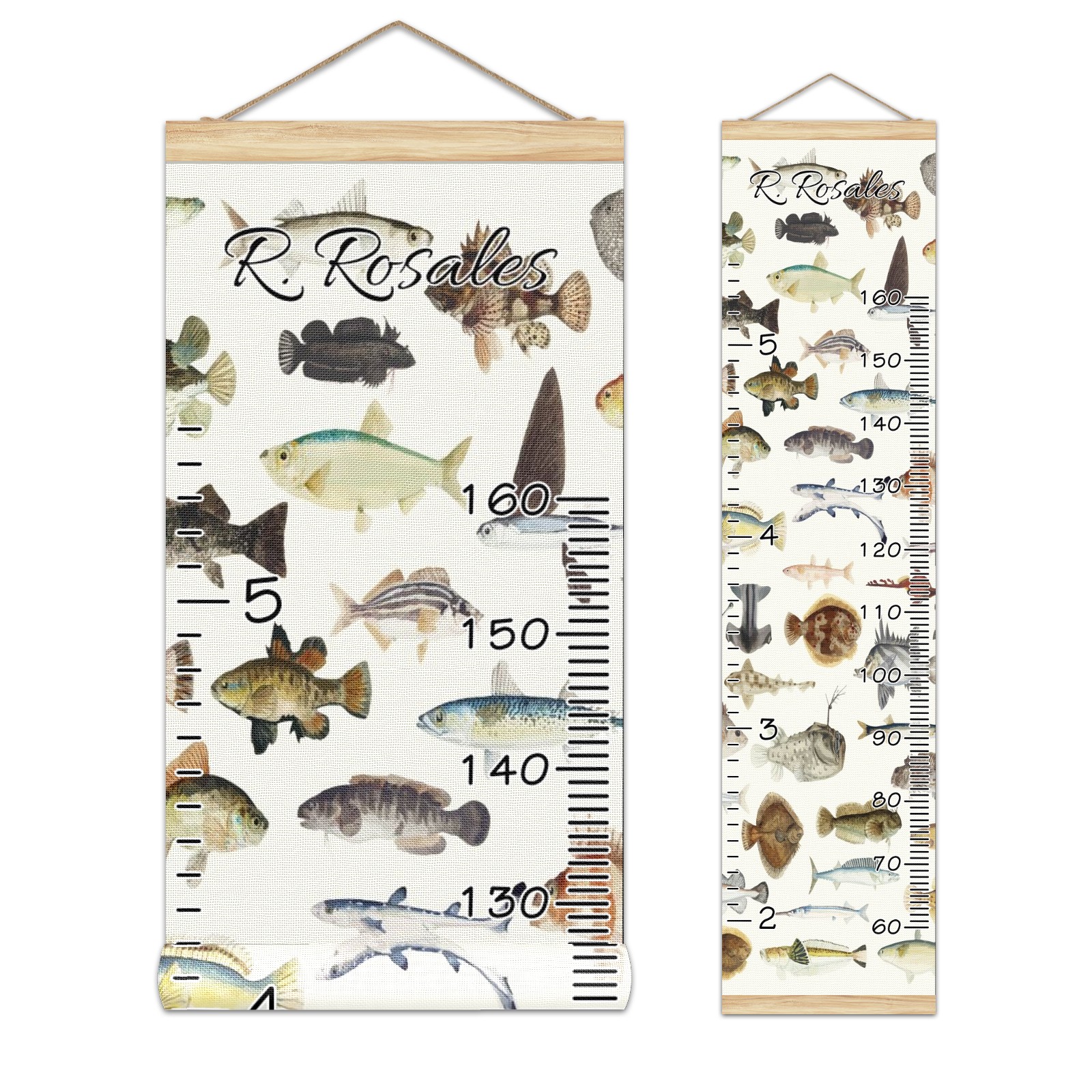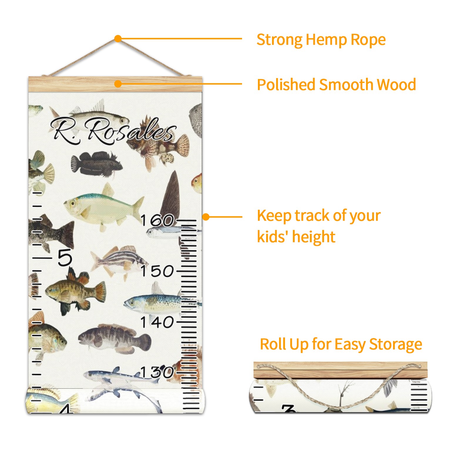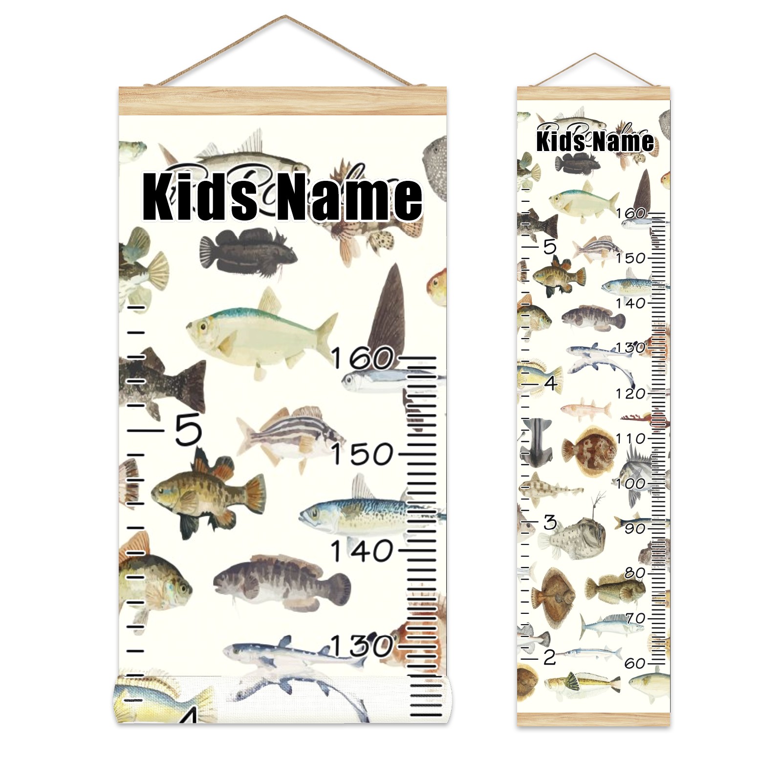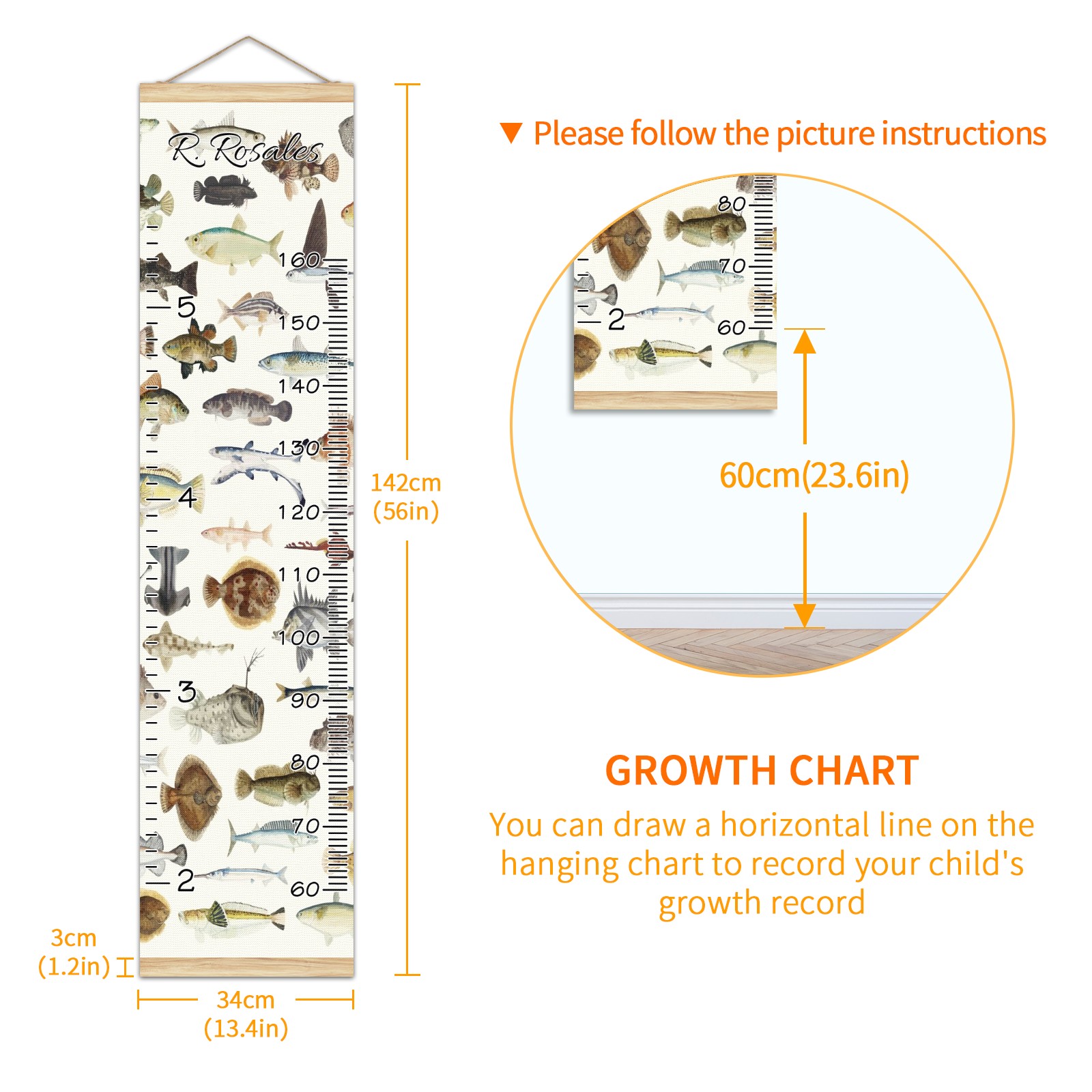 Personalized Kids Name Growth Chart Ruler for Wall Wood Frame Canvas Height Measure Chart 13.4x56 in Hanging Growth Chart Colored Fish Drawing1.4 Boys Girls Room Decor