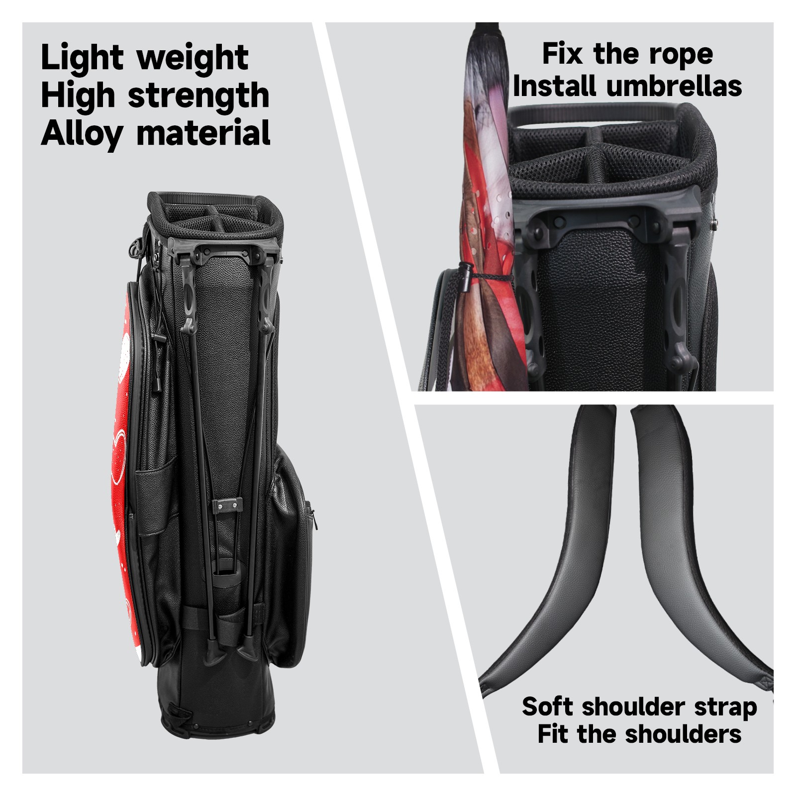 <p>This golf cart bag combines versatility with durability, providing comprehensive protection and convenient access for your clubs. The five-way top compartments provide strategic zoning for easily storing a variety of clubs and protecting them from impacts and wear. The PU fabric and sturdy plastic base combine premium quality with durability. The versatile storage system includes multiple zippered pockets and a separate cooler compartment for storing equipment, accessories, and drinks. The portable rear handle allows for easy transport. The ergonomic, padded shoulder straps are adjustable and removable to fit your shoulder and reduce weight. A built-in rain cover effectively keeps out moisture, ensuring your clubs stay dry and protected in wet weather. This is the ideal golf bag for your golfing adventure.<br></p>