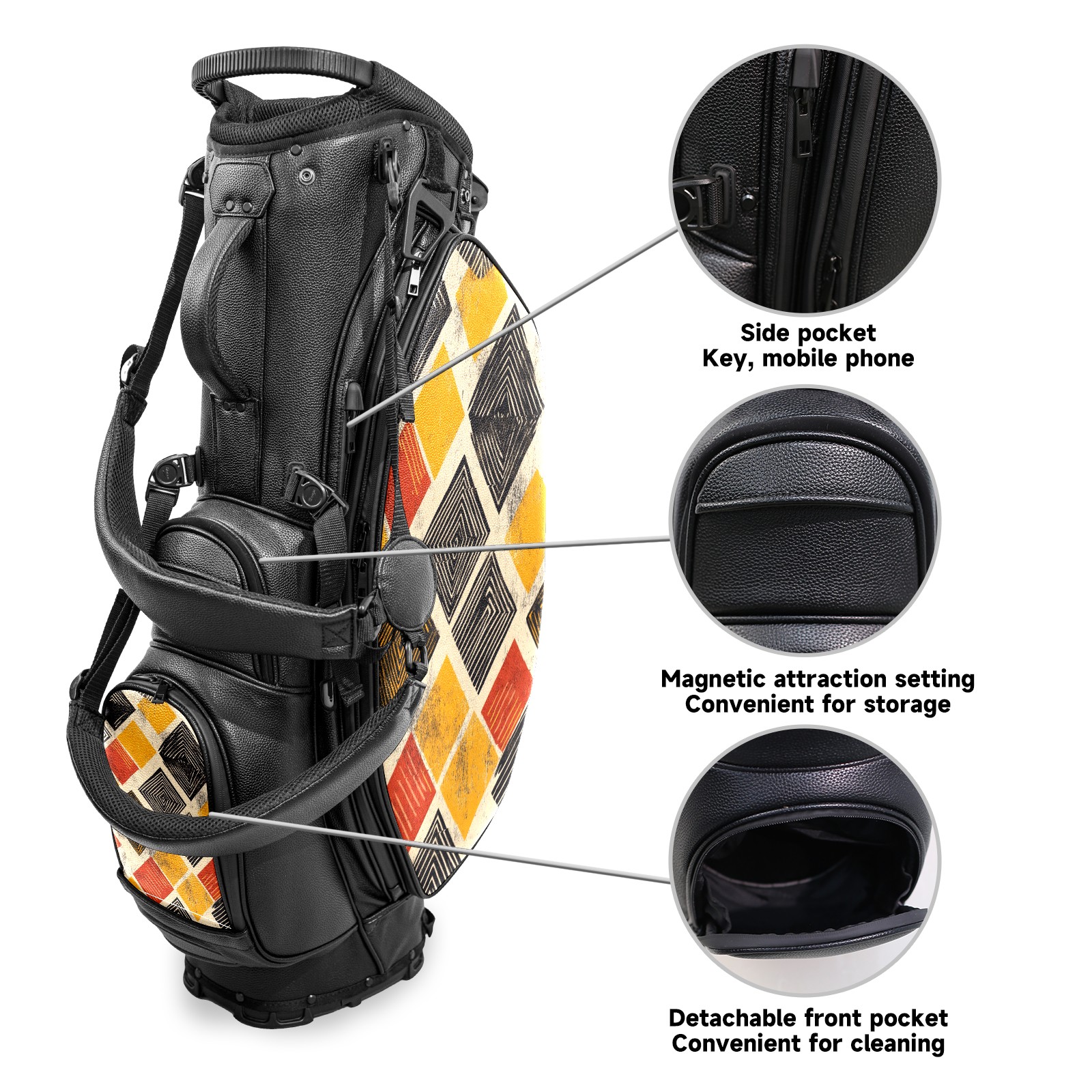 <p>This golf cart bag combines versatility with durability, providing comprehensive protection and convenient access for your clubs. The five-way top compartments provide strategic zoning for easily storing a variety of clubs and protecting them from impacts and wear. The PU fabric and sturdy plastic base combine premium quality with durability. The versatile storage system includes multiple zippered pockets and a separate cooler compartment for storing equipment, accessories, and drinks. The portable rear handle allows for easy transport. The ergonomic, padded shoulder straps are adjustable and removable to fit your shoulder and reduce weight. A built-in rain cover effectively keeps out moisture, ensuring your clubs stay dry and protected in wet weather. This is the ideal golf bag for your golfing adventure.<br></p>