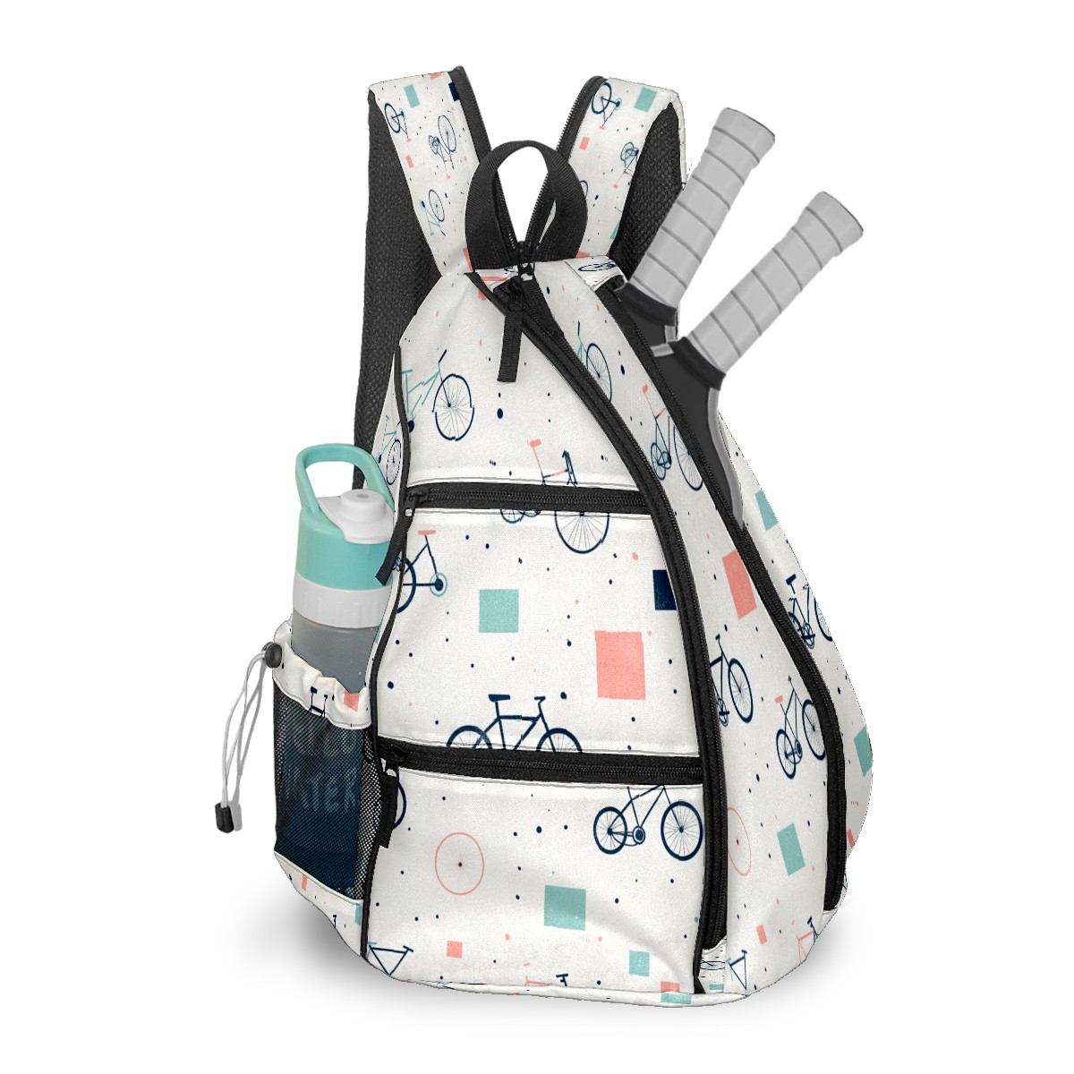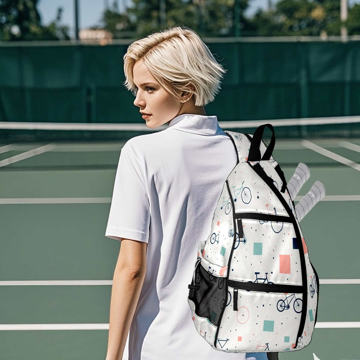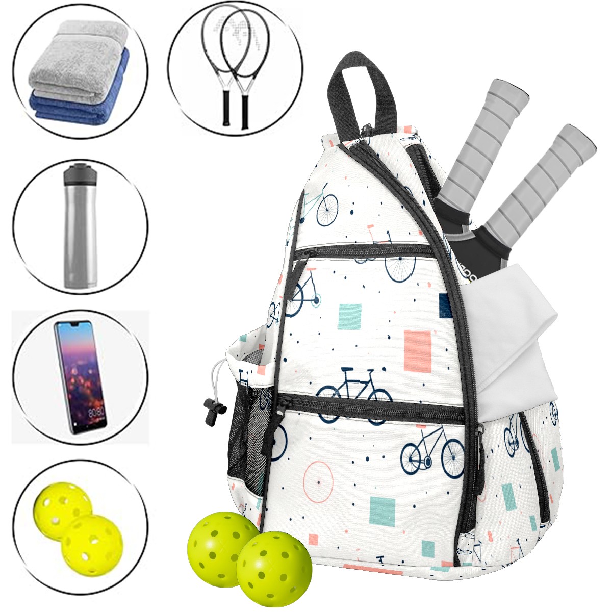 Pickleball Sling Bag for Women and Men - Backpack with Nylon Fabric/Woven Strap/Mesh Pocket/Fence Hook/Adjustable Bag Bike Pattern