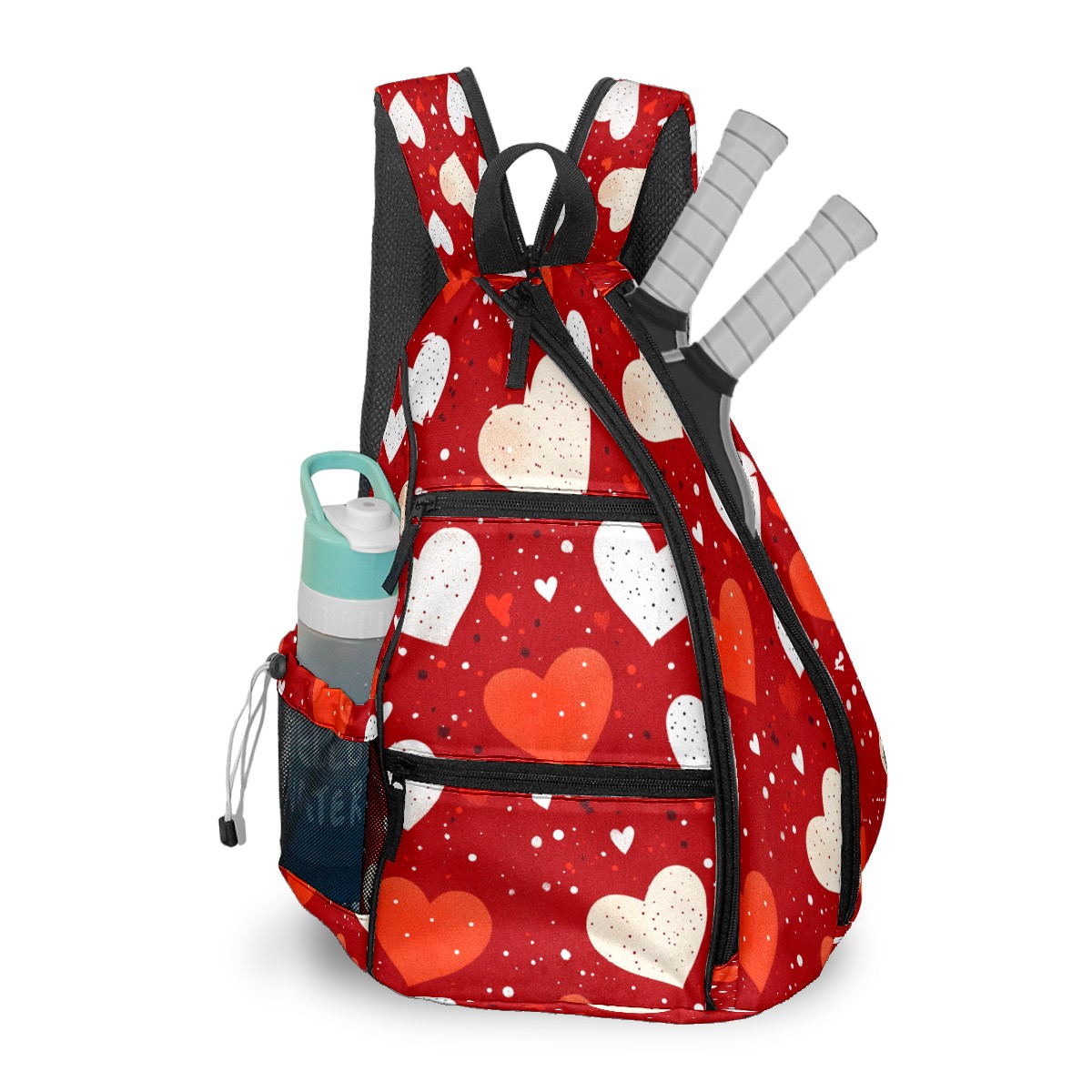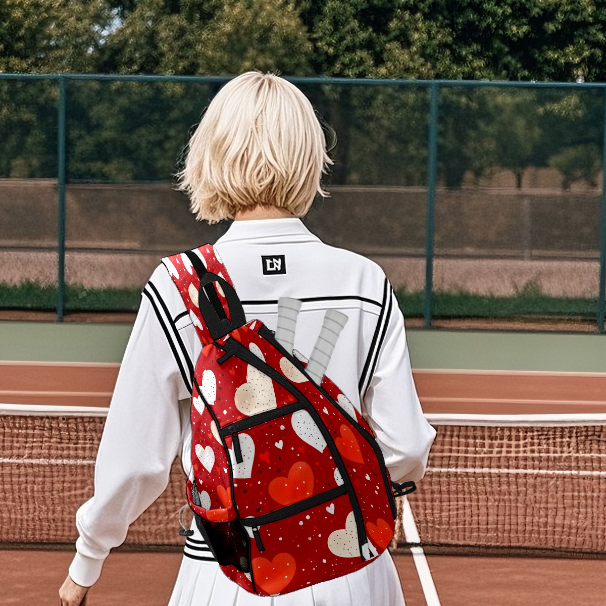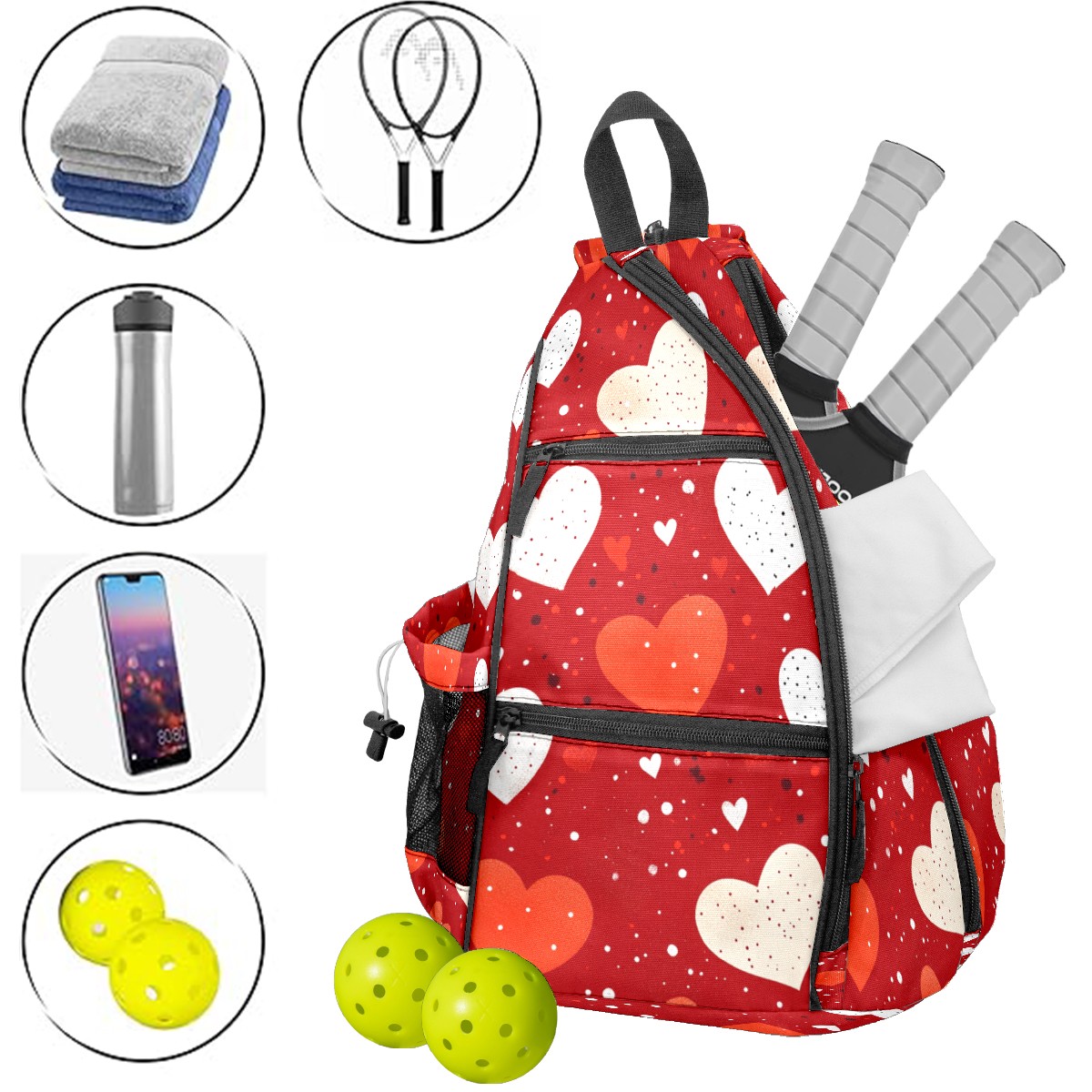 Pickleball Sling Bag for Women and Men - Backpack with Nylon Fabric/Woven Strap/Mesh Pocket/Fence Hook/Adjustable Bag Red Heart Pattern
