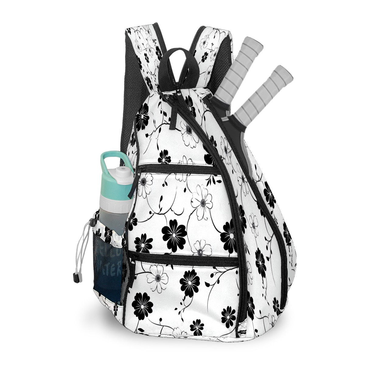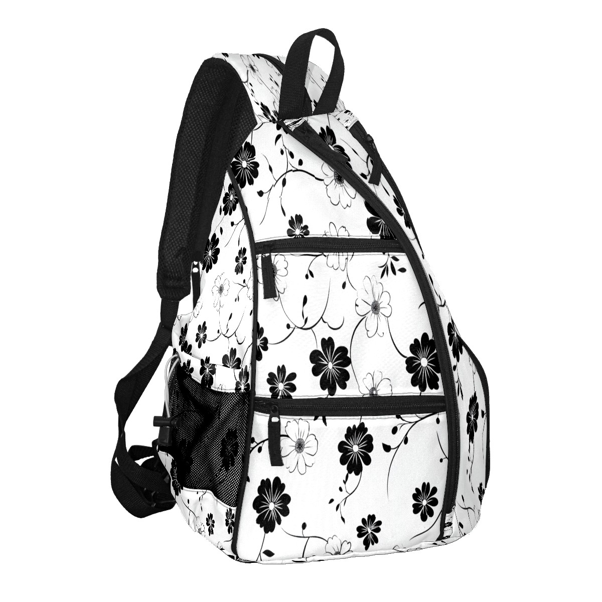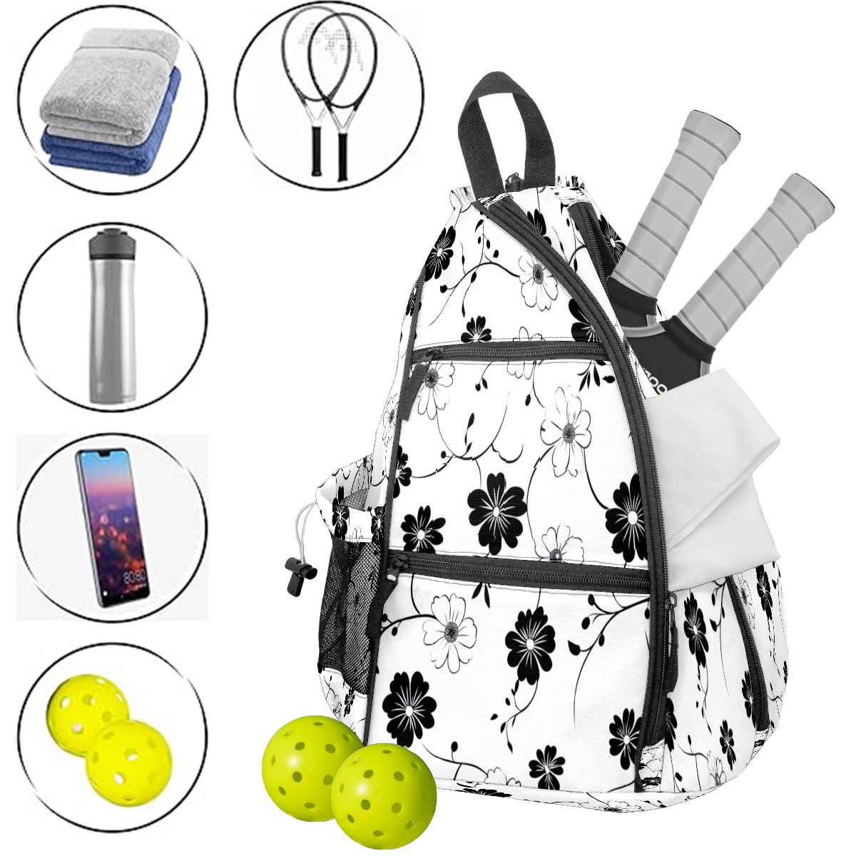 Pickleball Sling Bag for Women and Men - Backpack with Nylon Fabric/Woven Strap/Mesh Pocket/Fence Hook/Adjustable Bag Black Flower Pattern