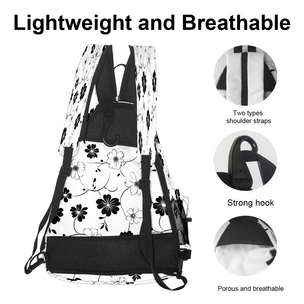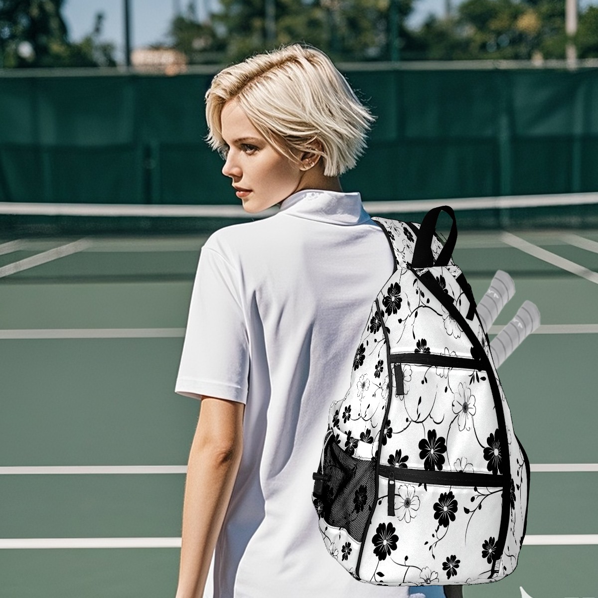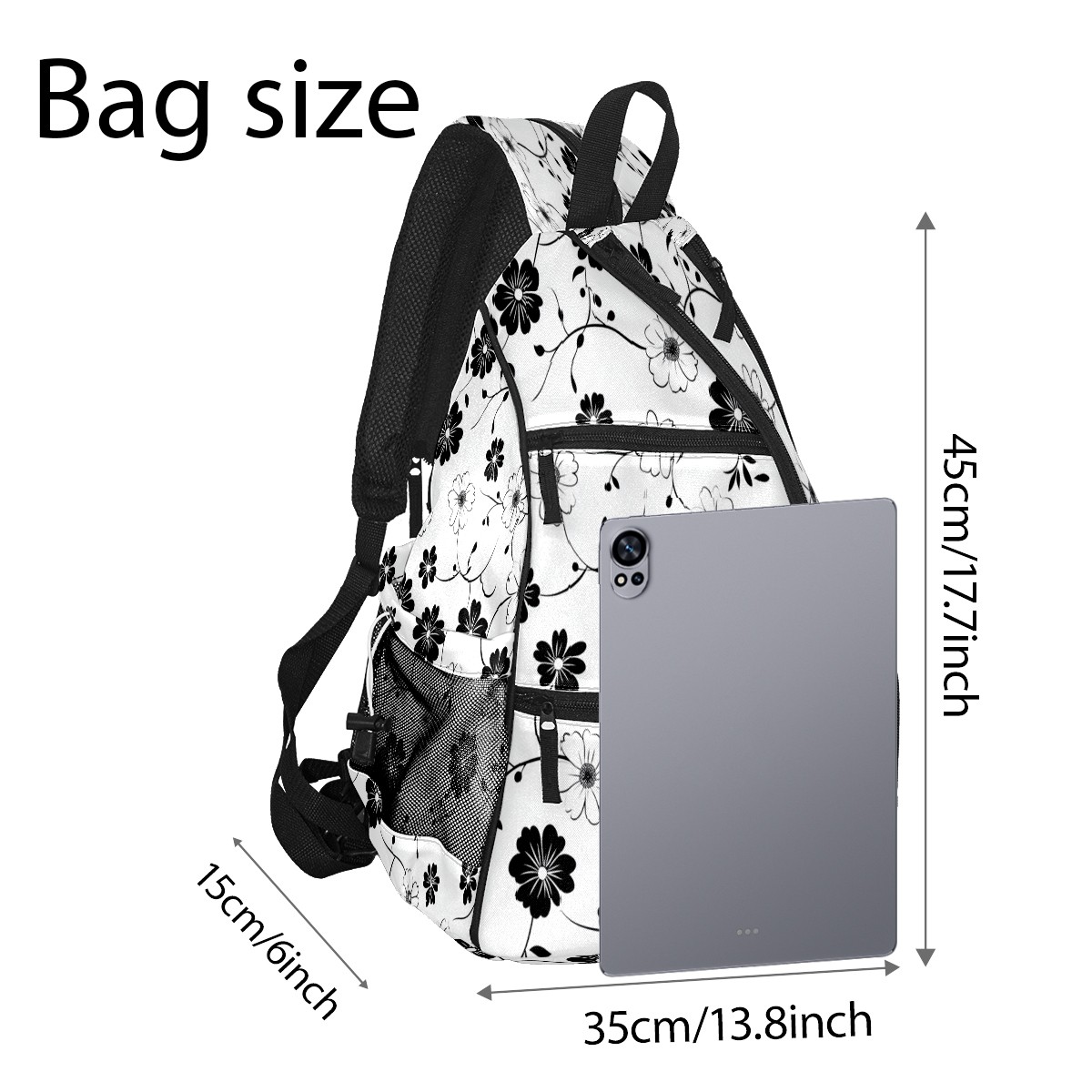 Pickleball Sling Bag for Women and Men - Backpack with Nylon Fabric/Woven Strap/Mesh Pocket/Fence Hook/Adjustable Bag Black Flower Pattern