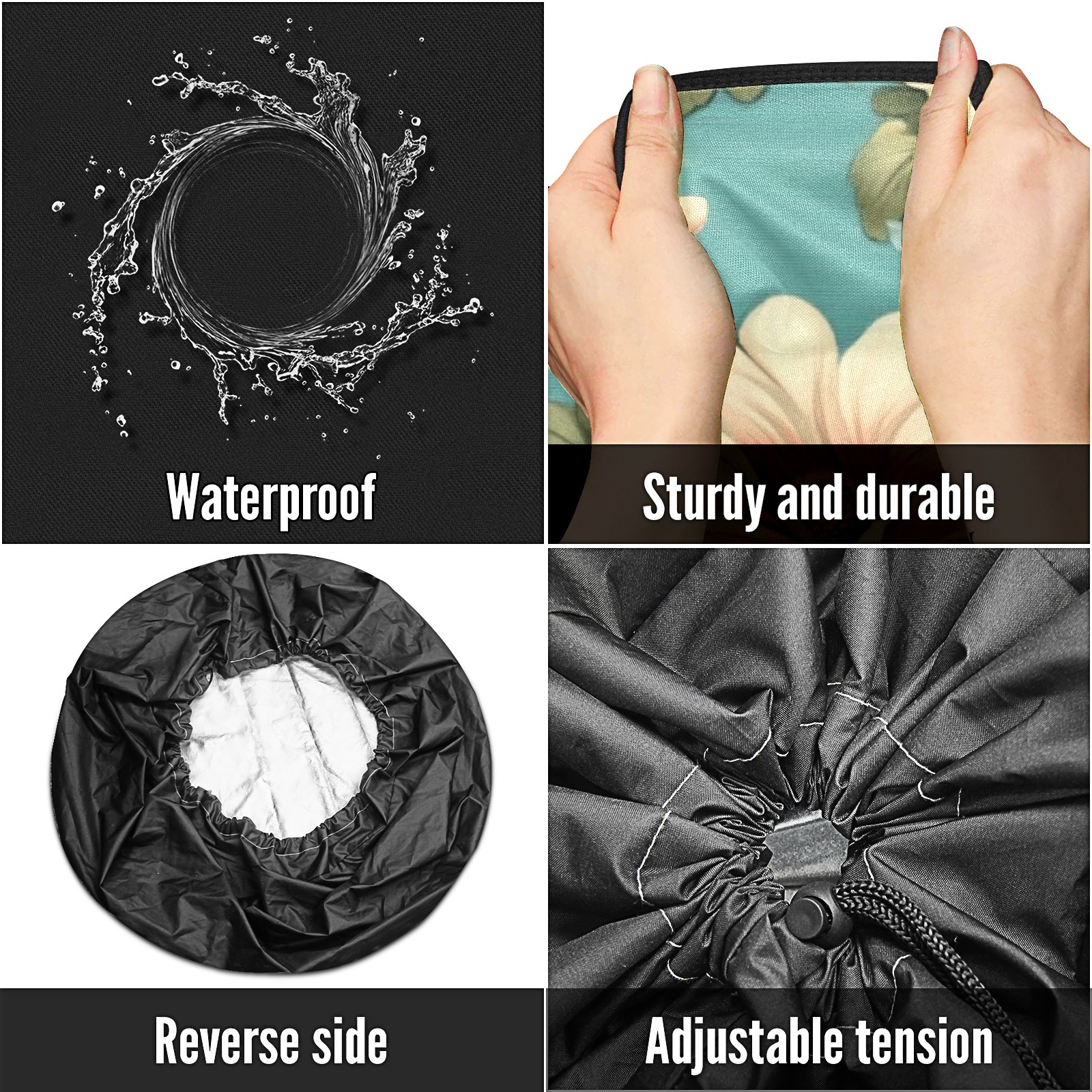 • <p>Keep your spare tire protected and your vehicle looking sharp with our universal Tire Cover. Designed with a sleek single-sided print and classic black sides, this rugged cover is made from high-quality polyester fabric that is fully waterproof. The adjustable nylon rope ensures a secure, custom fit for any tire, helping to maintain a clean and professional appearance for your vehicle.</p>