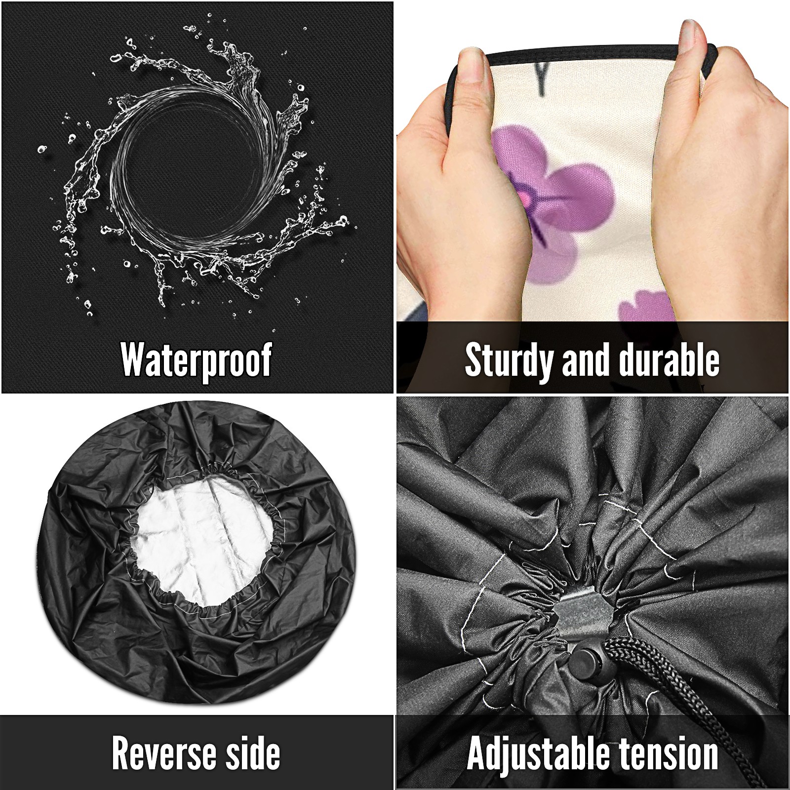 • <p>Keep your spare tire protected and your vehicle looking sharp with our universal Tire Cover. Designed with a sleek single-sided print and classic black sides, this rugged cover is made from high-quality polyester fabric that is fully waterproof. The adjustable nylon rope ensures a secure, custom fit for any tire, helping to maintain a clean and professional appearance for your vehicle.</p>