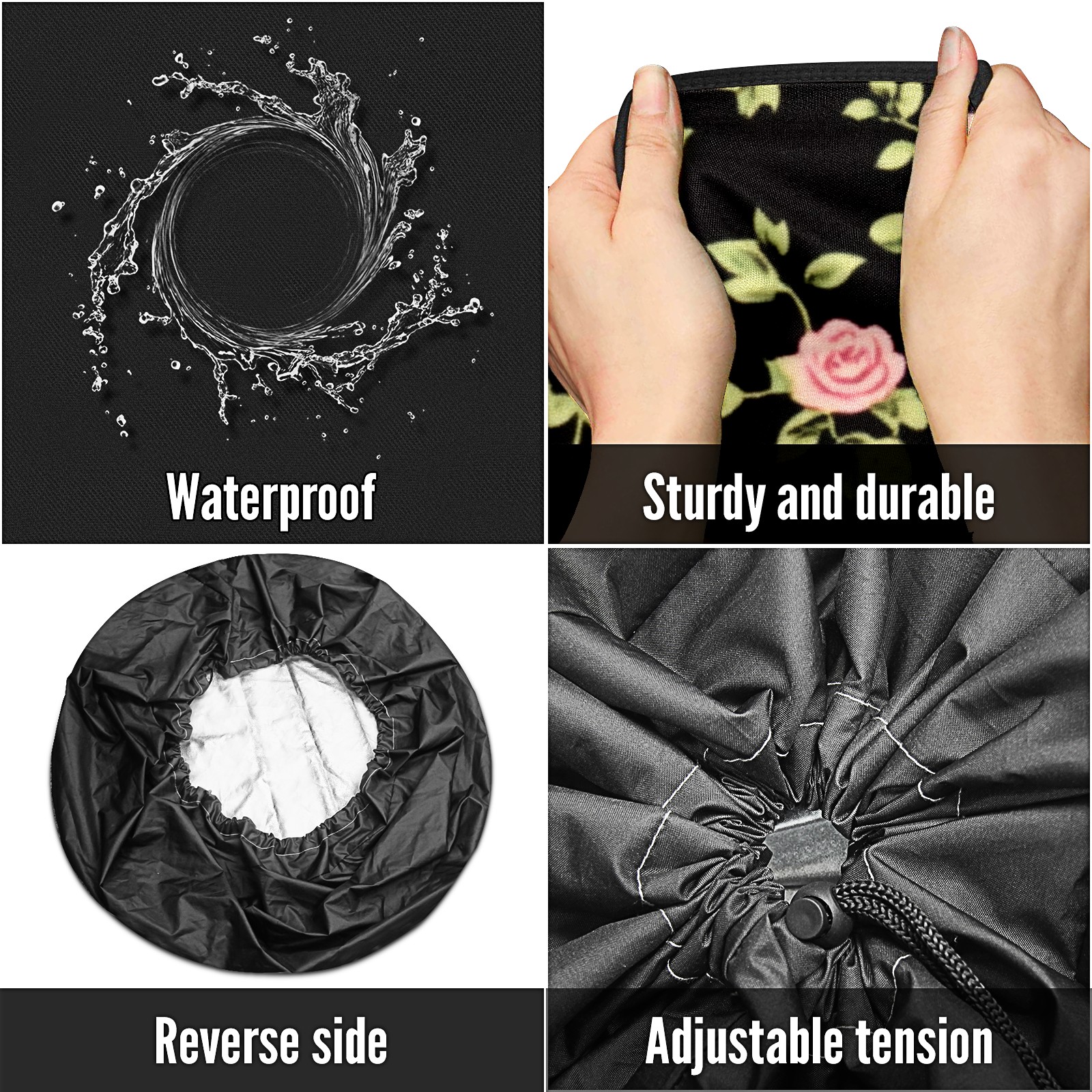 • <p>Keep your spare tire protected and your vehicle looking sharp with our universal Tire Cover. Designed with a sleek single-sided print and classic black sides, this rugged cover is made from high-quality polyester fabric that is fully waterproof. The adjustable nylon rope ensures a secure, custom fit for any tire, helping to maintain a clean and professional appearance for your vehicle.</p>