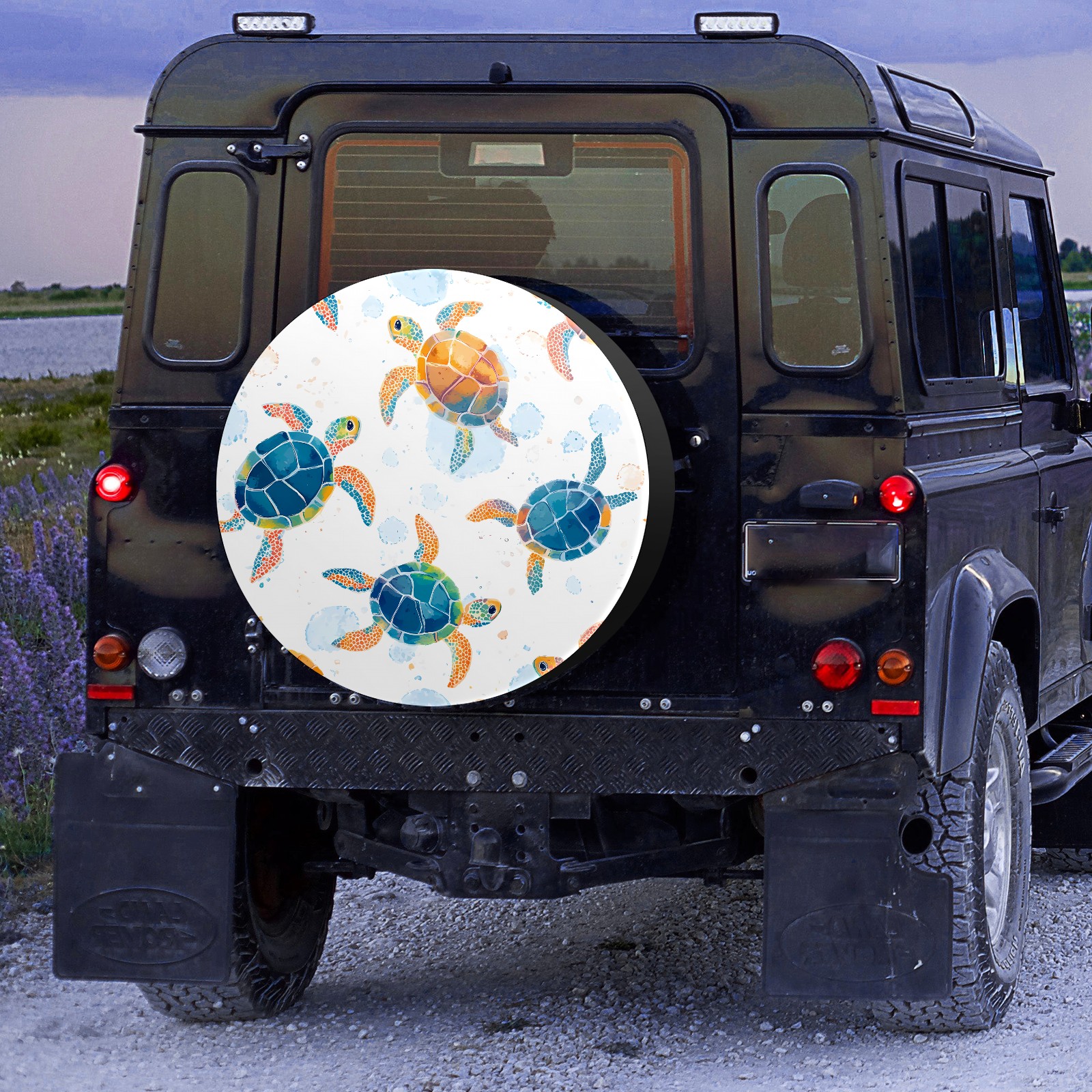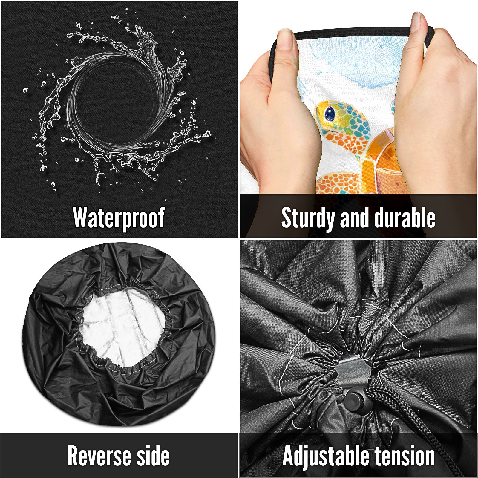 • <p>Keep your spare tire protected and your vehicle looking sharp with our universal Tire Cover. Designed with a sleek single-sided print and classic black sides, this rugged cover is made from high-quality polyester fabric that is fully waterproof. The adjustable nylon rope ensures a secure, custom fit for any tire, helping to maintain a clean and professional appearance for your vehicle.</p>