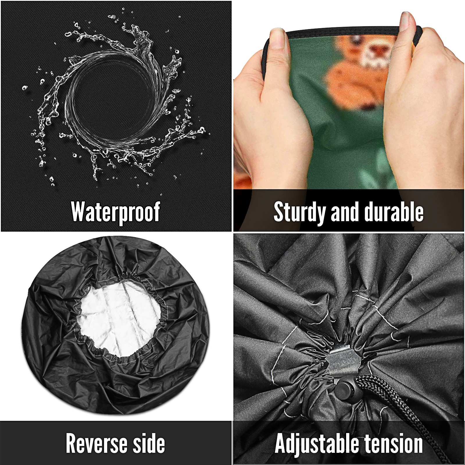 • <p>Keep your spare tire protected and your vehicle looking sharp with our universal Tire Cover. Designed with a sleek single-sided print and classic black sides, this rugged cover is made from high-quality polyester fabric that is fully waterproof. The adjustable nylon rope ensures a secure, custom fit for any tire, helping to maintain a clean and professional appearance for your vehicle.</p>