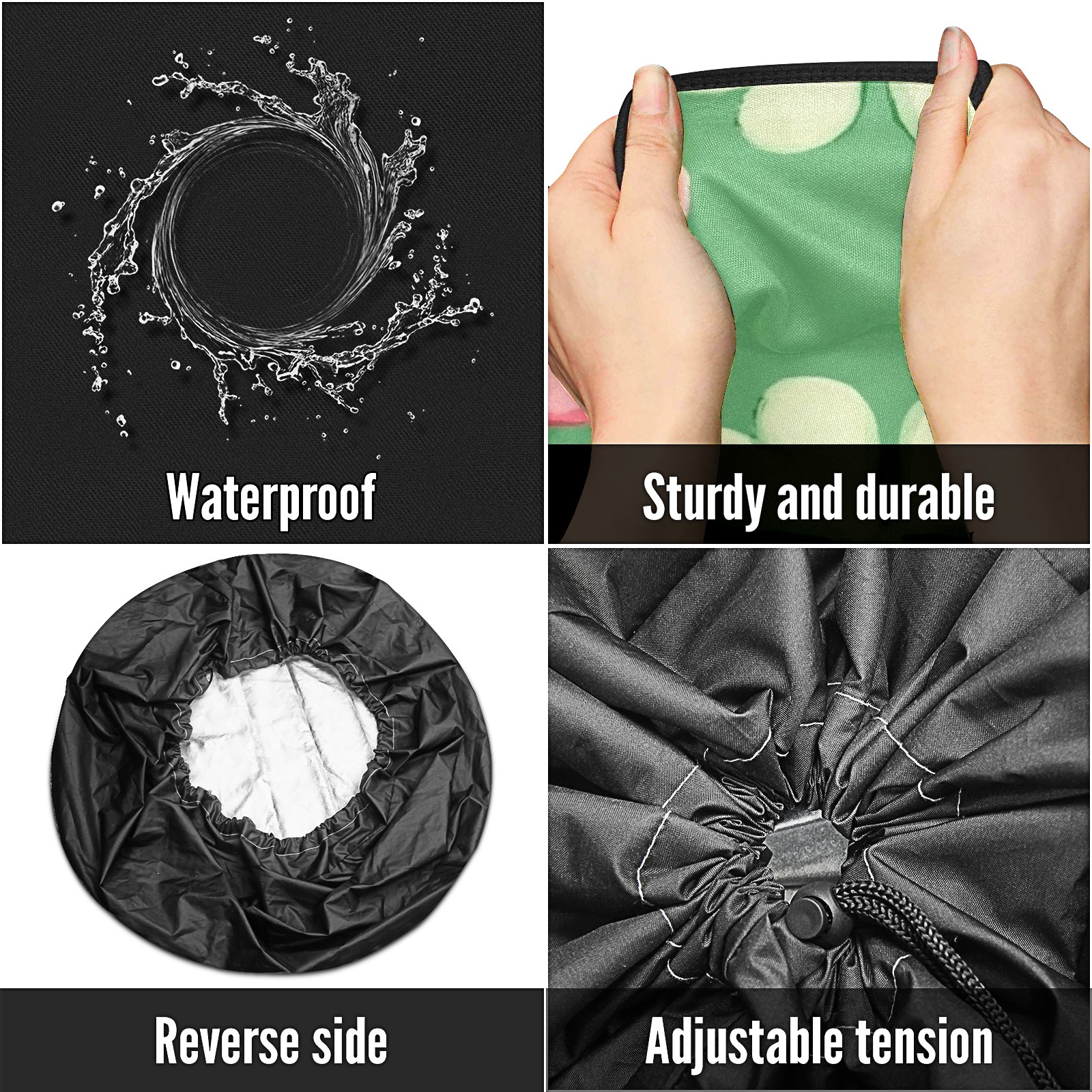 • <p>Keep your spare tire protected and your vehicle looking sharp with our universal Tire Cover. Designed with a sleek single-sided print and classic black sides, this rugged cover is made from high-quality polyester fabric that is fully waterproof. The adjustable nylon rope ensures a secure, custom fit for any tire, helping to maintain a clean and professional appearance for your vehicle.</p>