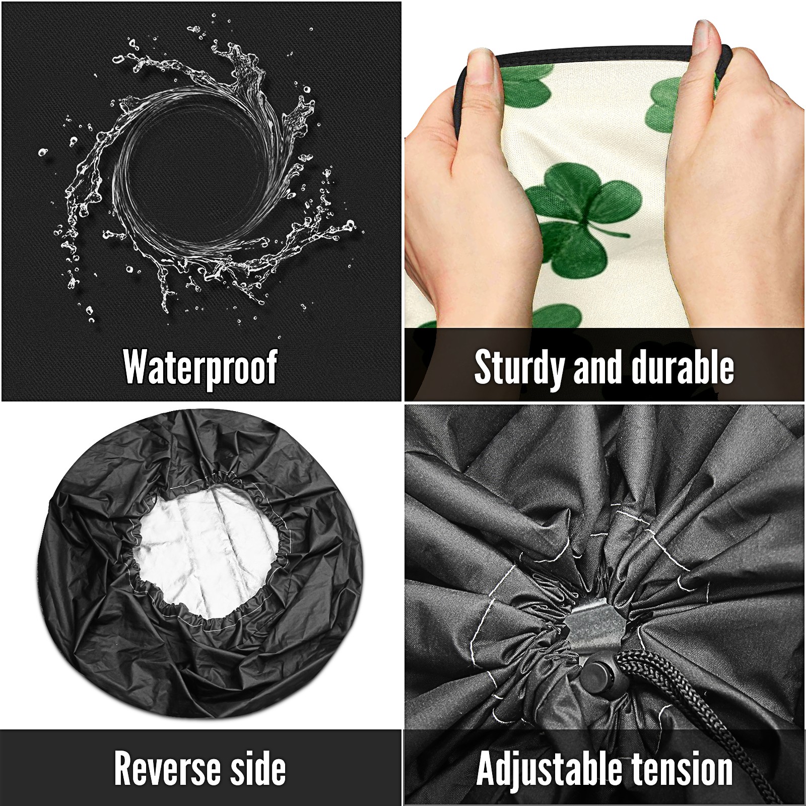 • <p>Keep your spare tire protected and your vehicle looking sharp with our universal Tire Cover. Designed with a sleek single-sided print and classic black sides, this rugged cover is made from high-quality polyester fabric that is fully waterproof. The adjustable nylon rope ensures a secure, custom fit for any tire, helping to maintain a clean and professional appearance for your vehicle.</p>